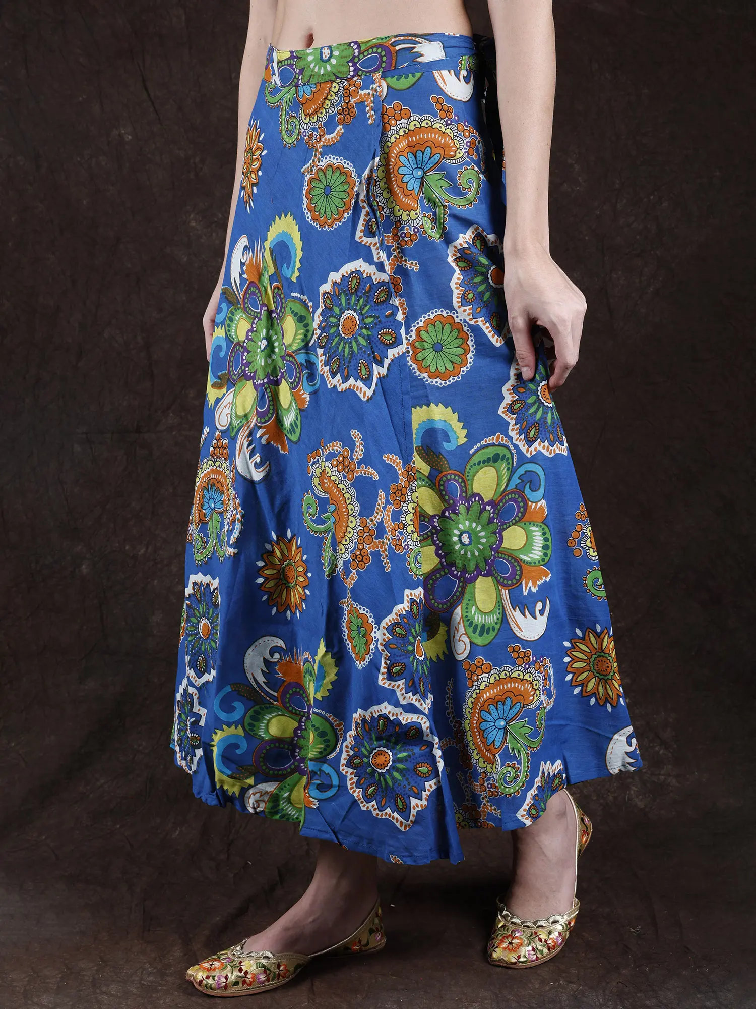 Add a kaleidoscopic beauty to your casual attires with this imperial-blue wrap-around skirt.