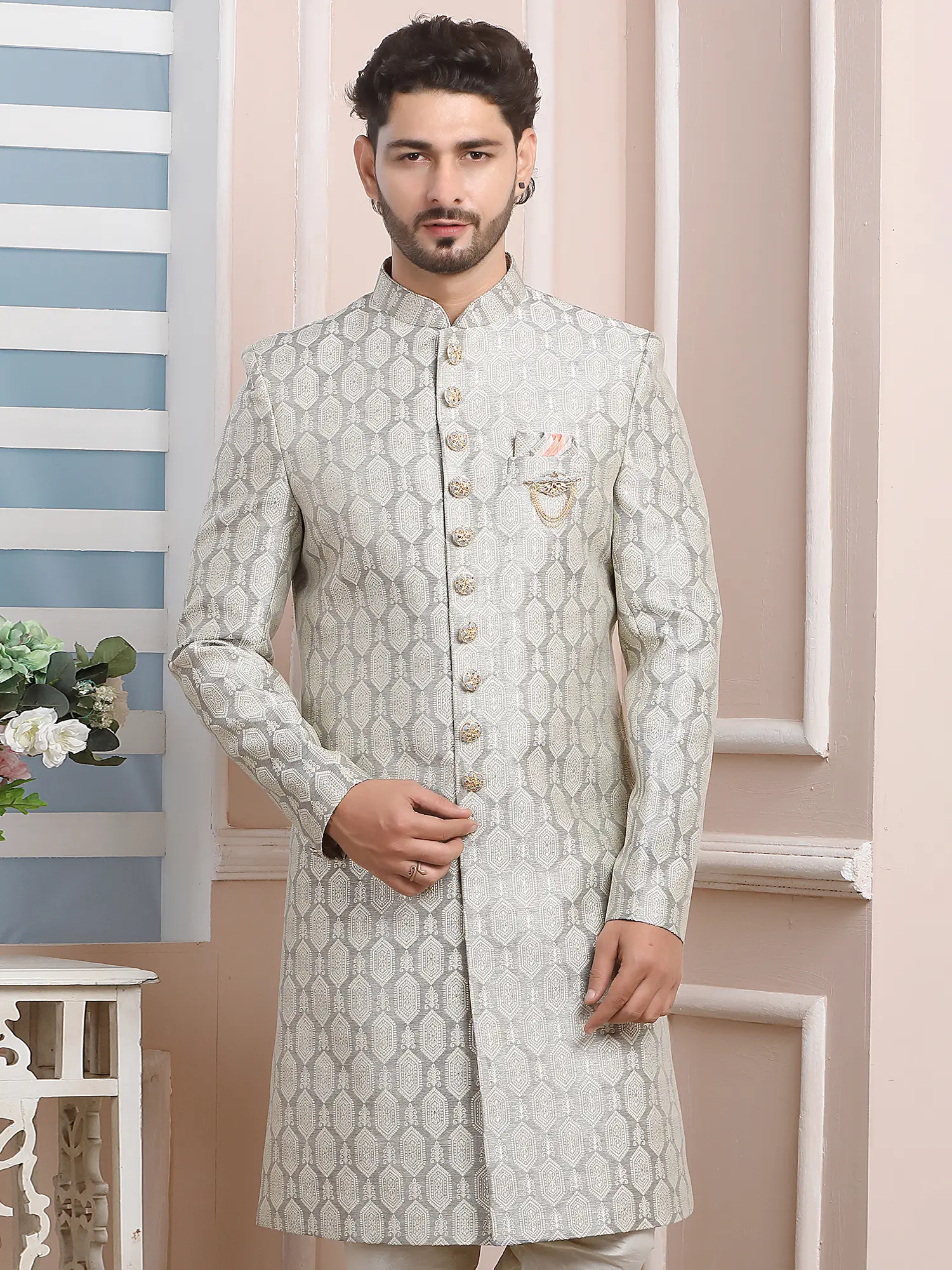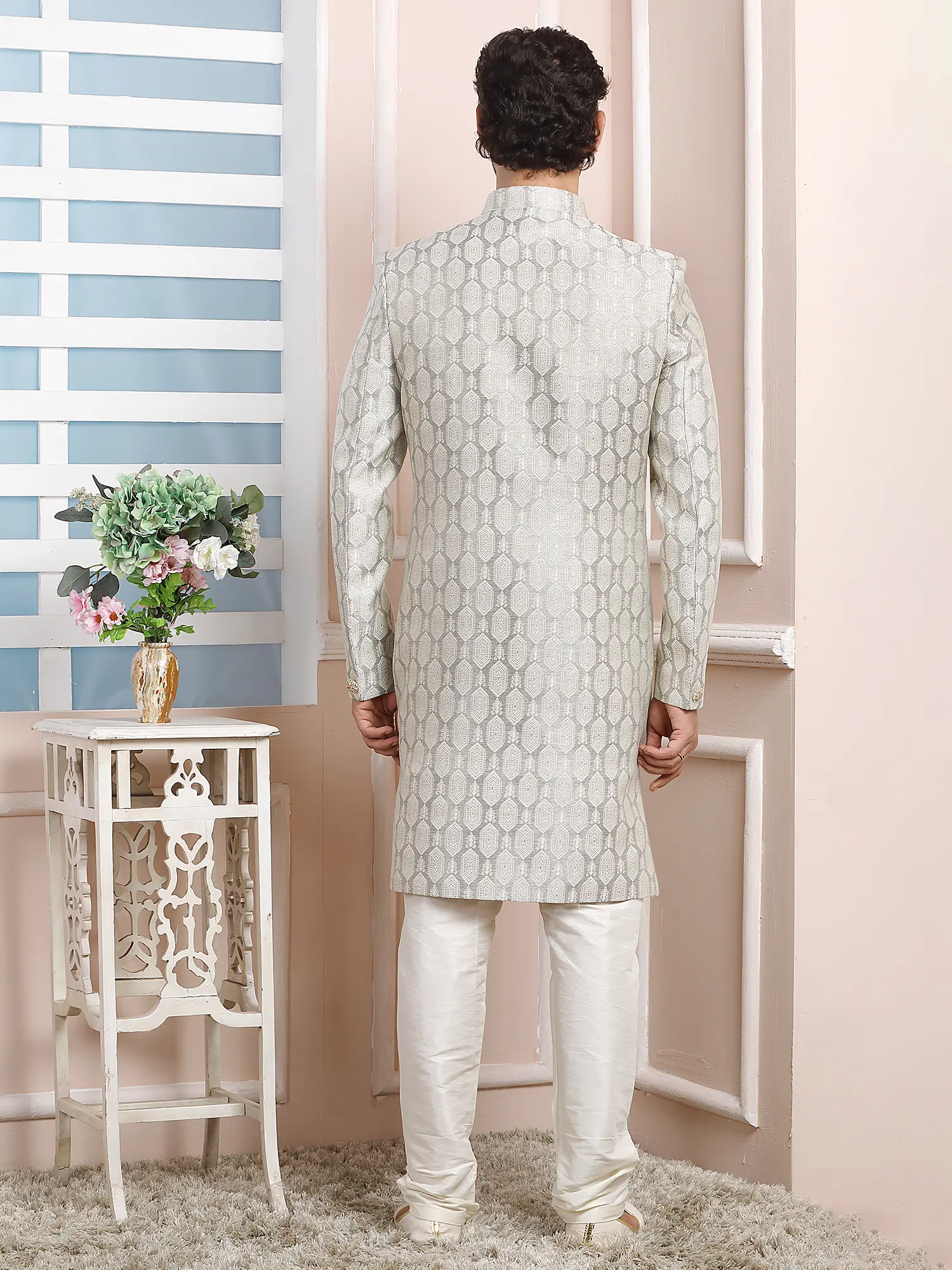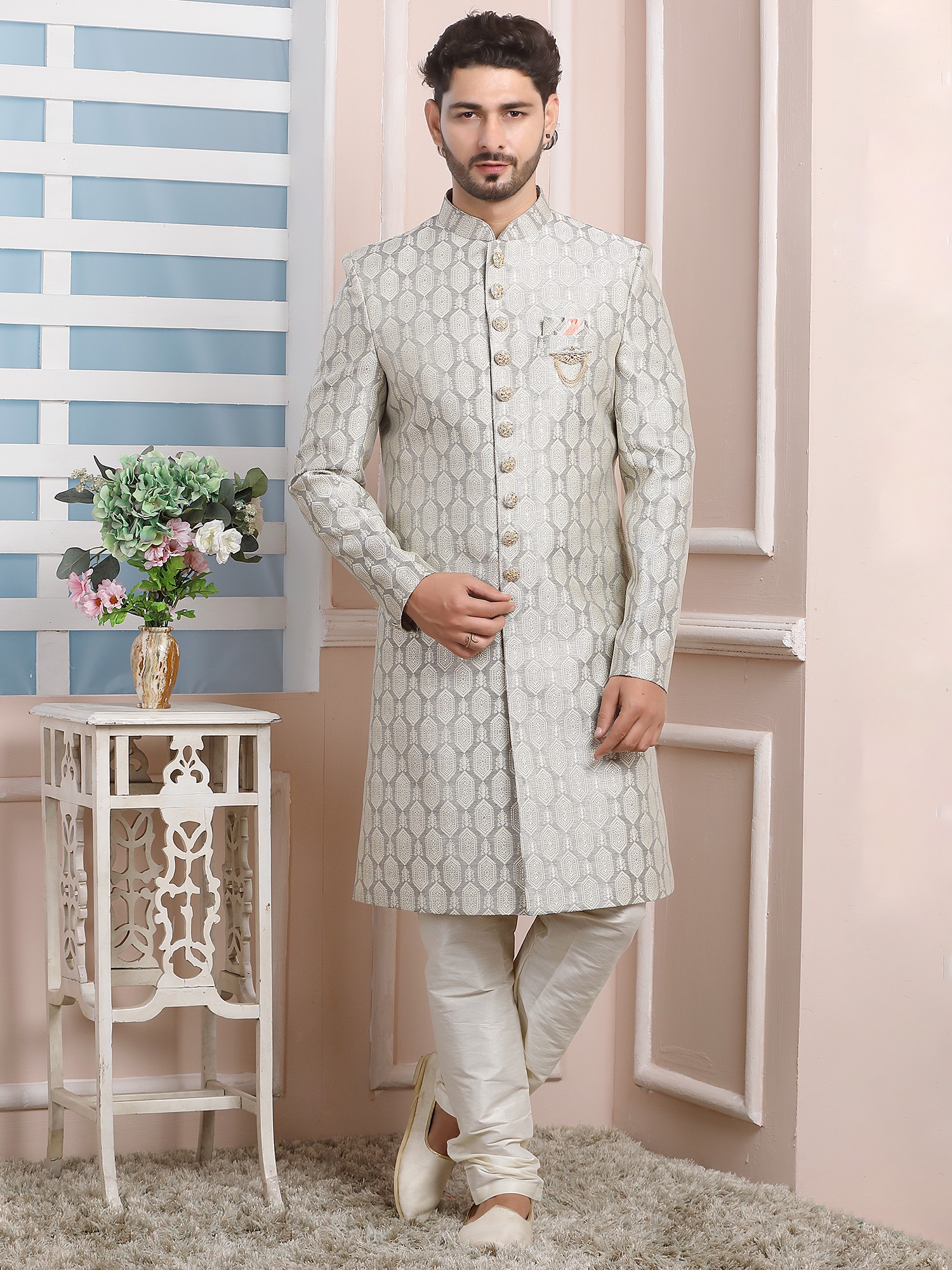 The sherwani features a distinguished Indo-Western silhouette, meticulously tailored for a flattering fit. Its unique geometric jacquard pattern captivates the eye, offering a subtle yet impactful visual narrative. The ensemble is completed by a pair of classic churidar bottoms, providing a comfortable and elegant foundation.