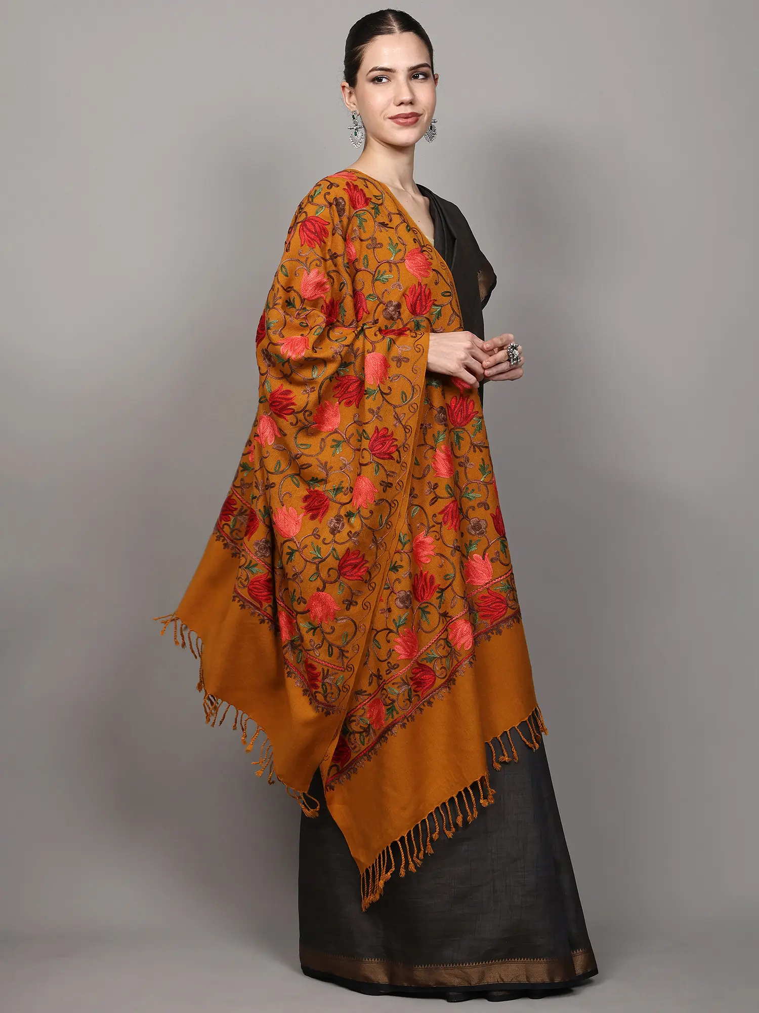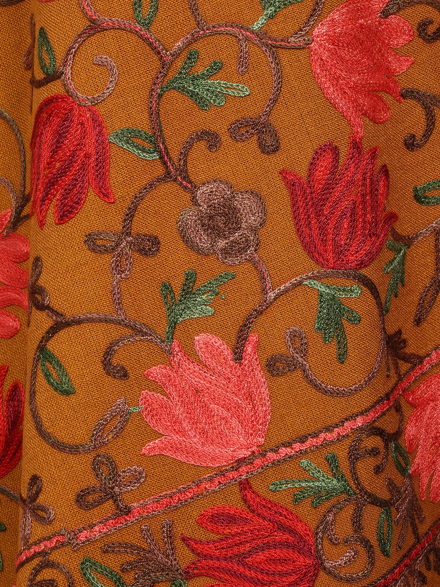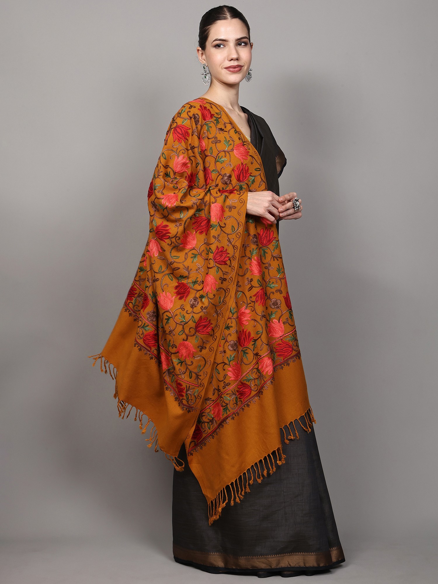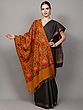 Immerse yourself in the rich heritage of Punjab with this exquisite wool stole, a masterpiece of artisanal craftsmanship. The striking Inca-gold hue forms the perfect canvas for a breathtaking display of Aari embroidery, a traditional technique renowned for its intricate detail and vibrant execution. This stole is not merely an accessory; it is a wearable work of art, designed to elevate any ensemble with a touch of regal elegance.