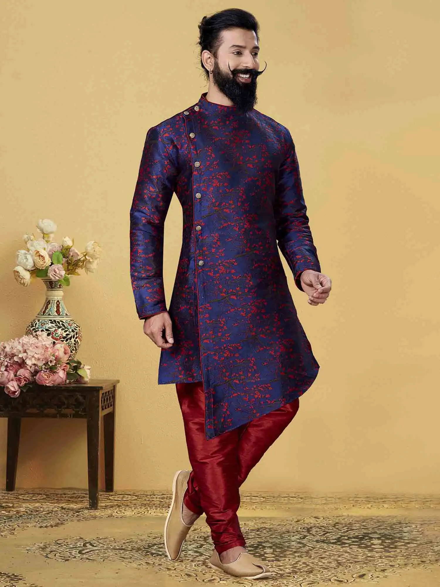 Whether attending a festive celebration or a special occasion, this royal “Indo-Western Kurta with Churidar Pajama” elevates your presence, symbolising grace and refinement. This Indo-Western style has gained popularity due to its versatility, stylishness, and the changing lifestyle preferences of Indian men who now prefer more comfortable Western clothes daily. This set exudes refinement and luxury thanks to its construction from the finest heavy silk.