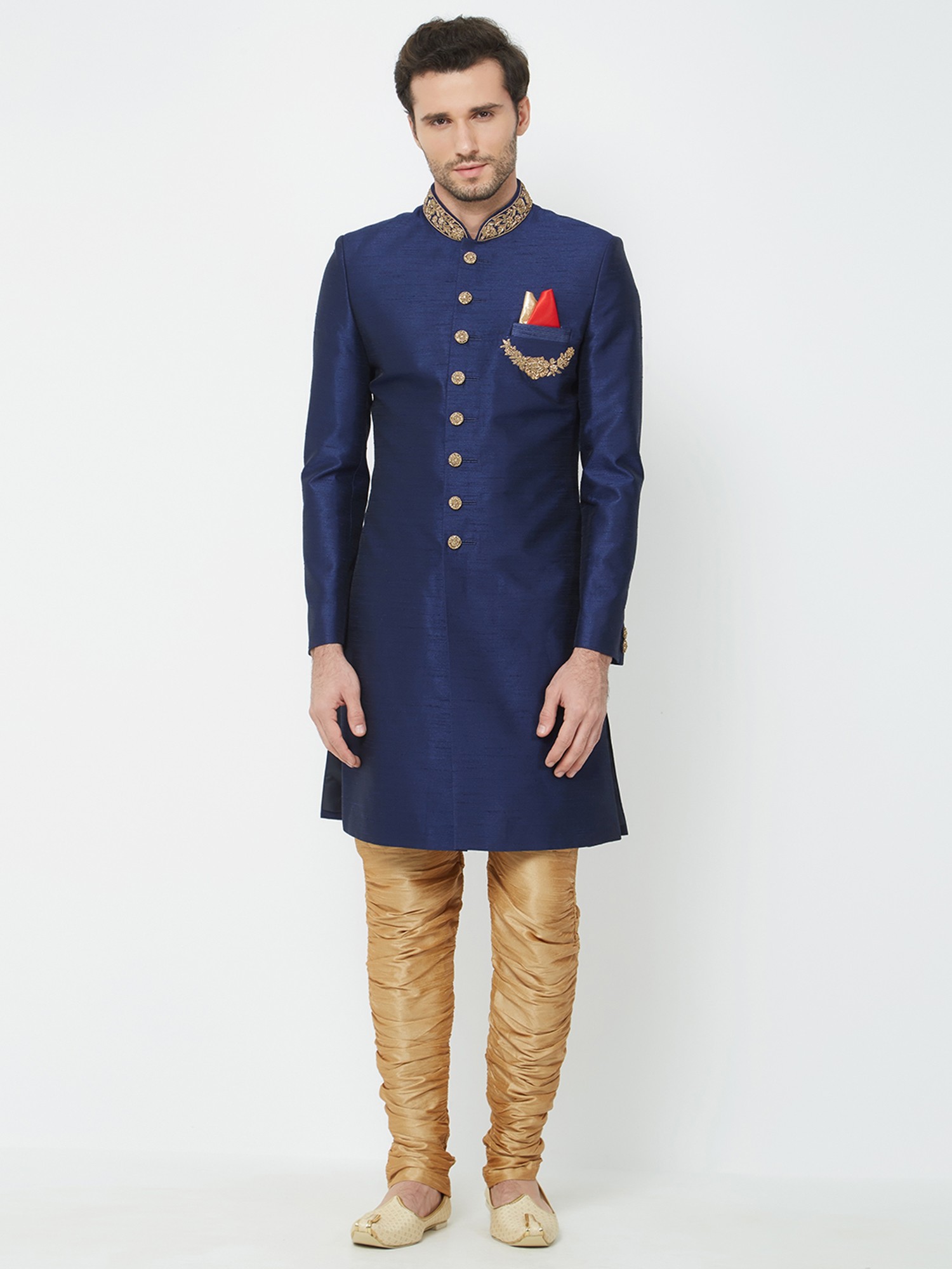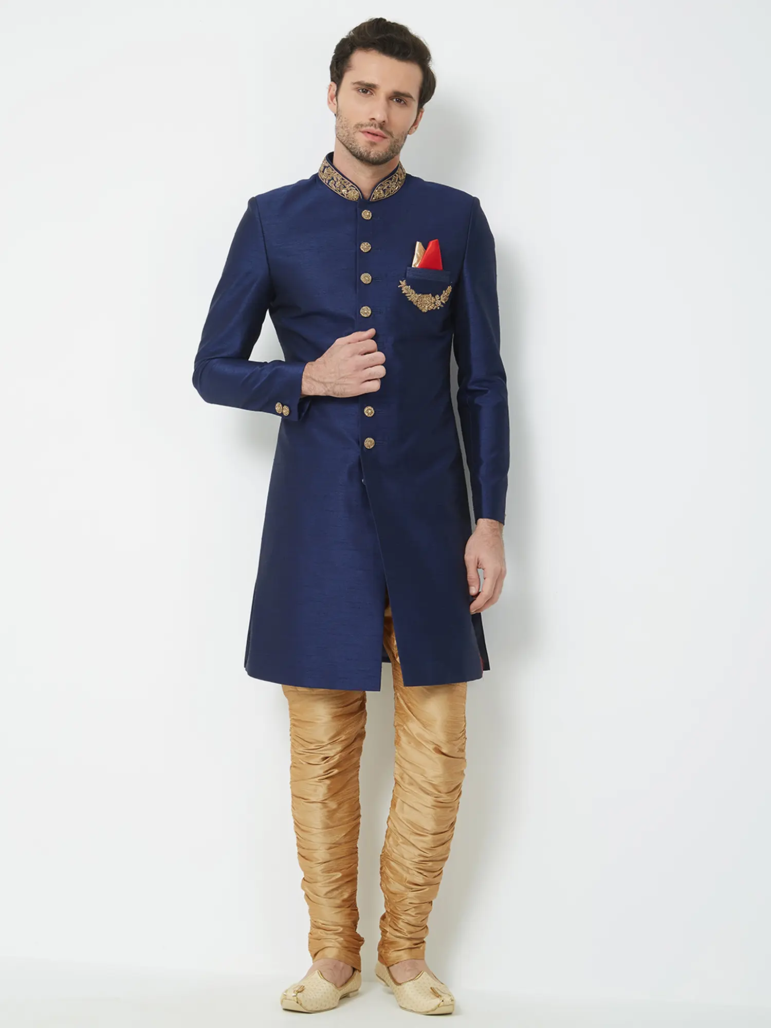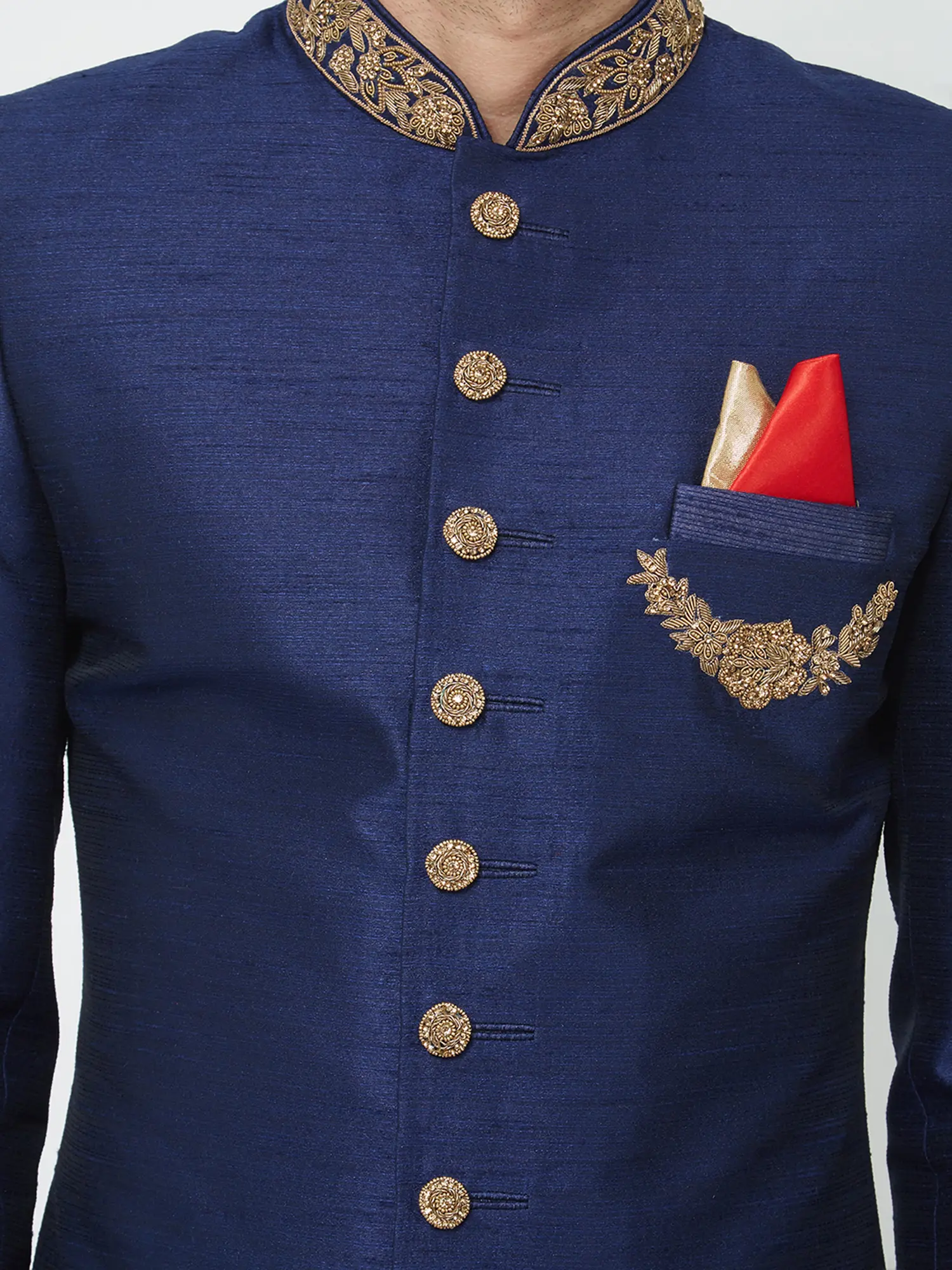 Features intricate handwork embroidery on the collar and chest pocket for a touch of opulence.