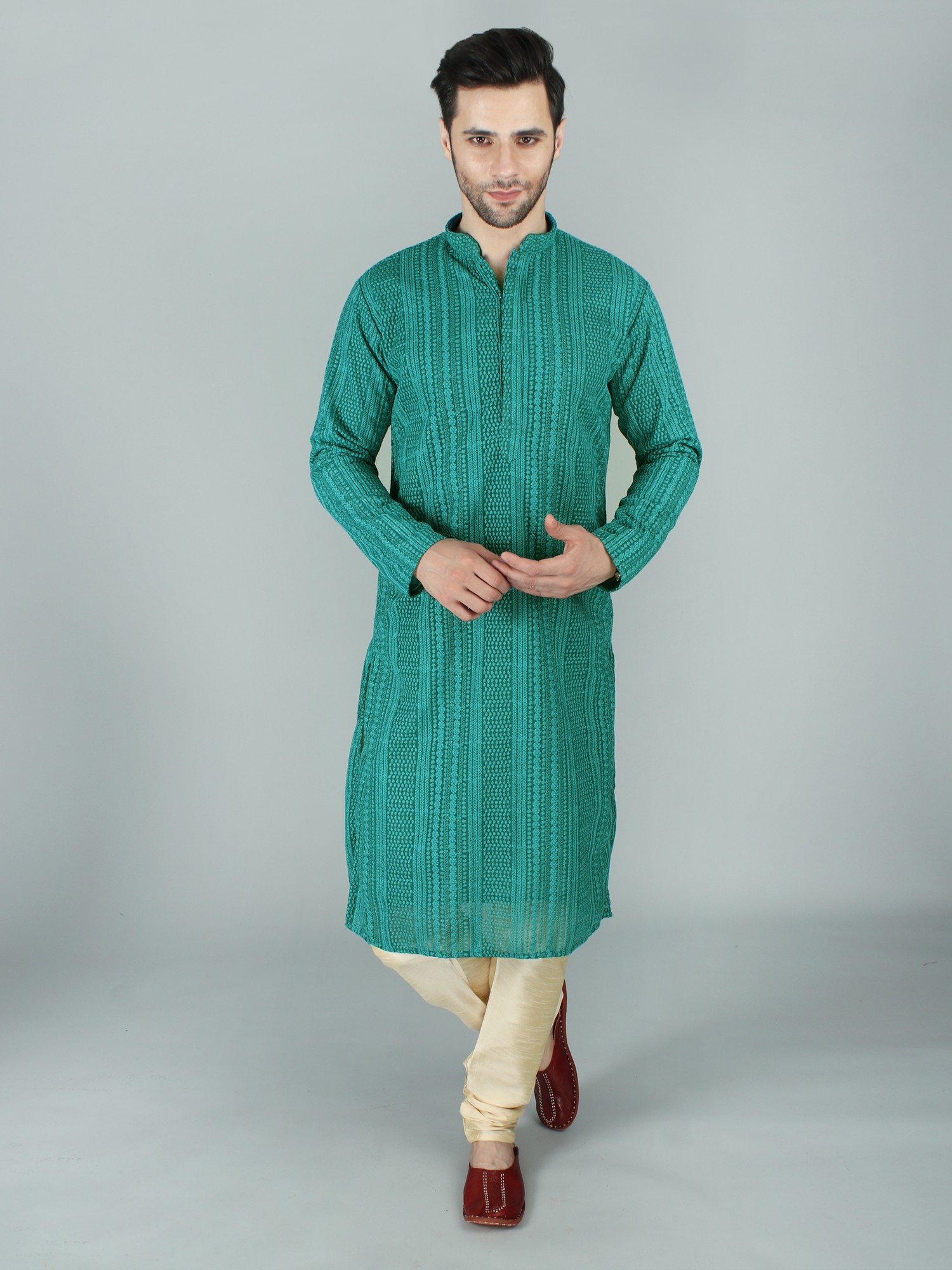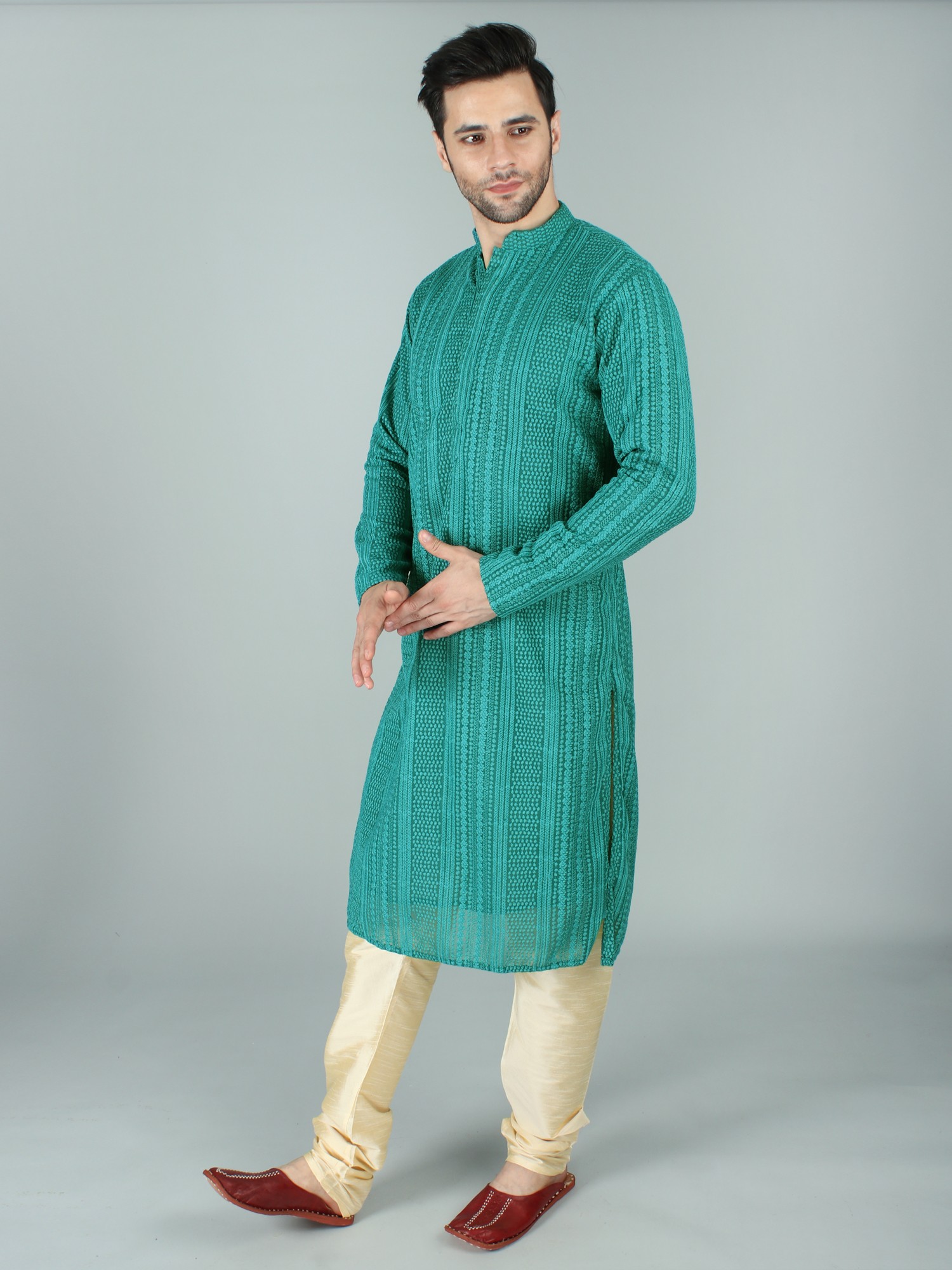 Step into the realm of timeless grace with our fine Chikankari Kurta Pyjama Set, where tradition meets delicate craftsmanship. The fine art of Chikankari takes centre stage, creating a garment that is a celebration of detailing. The Kurta Pyjama Set, with its Chikankari elegance; it's a symbol of cultural richness. The intricate patterns delicately dance on the fabric, showcasing a mastery that transcends fashion trends.