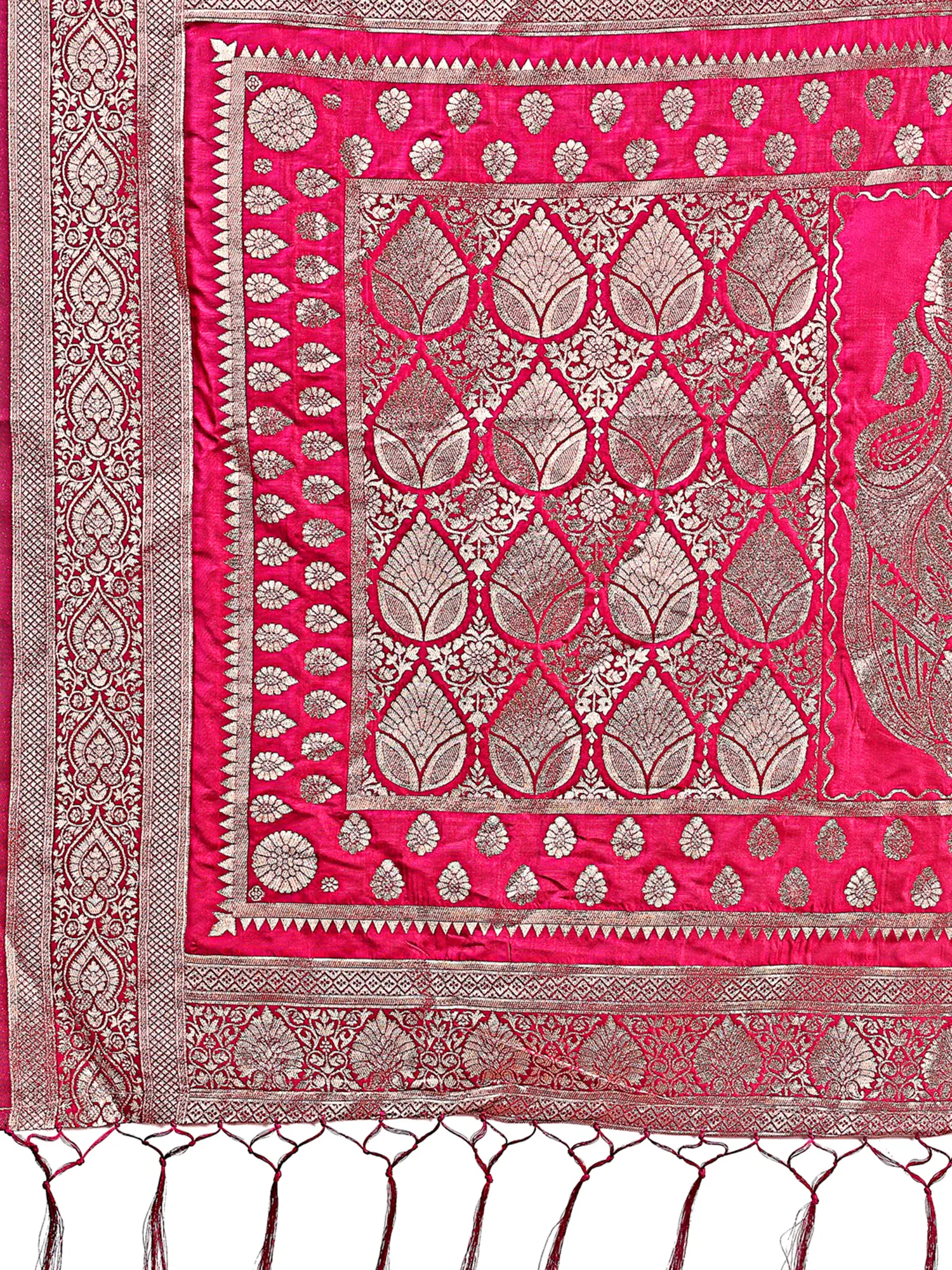 Features intricate Zari weaving with detailed floral motifs throughout the fabric.