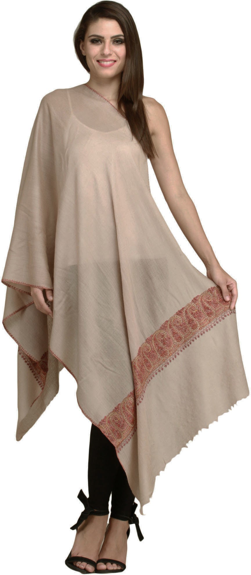 The Irish-Cream Plain Wool Sozni Stole with Paisley-Floral Embroidery on the Border from Kashmir is a masterpiece of craftsmanship and tradition. This elegant stole not only provides warmth but also tells a story through its intricate design. Handcrafted in the enchanting region of Kashmir, it showcases the timeless beauty of Sozni embroidery, a technique passed down through generations. The creamy woolen canvas of the stole is adorned with delicate, ornate patterns that feature a mesmerizing blend of paisley and floral motifs. This stole is a testament to the rich heritage of Kashmiri textile artistry.