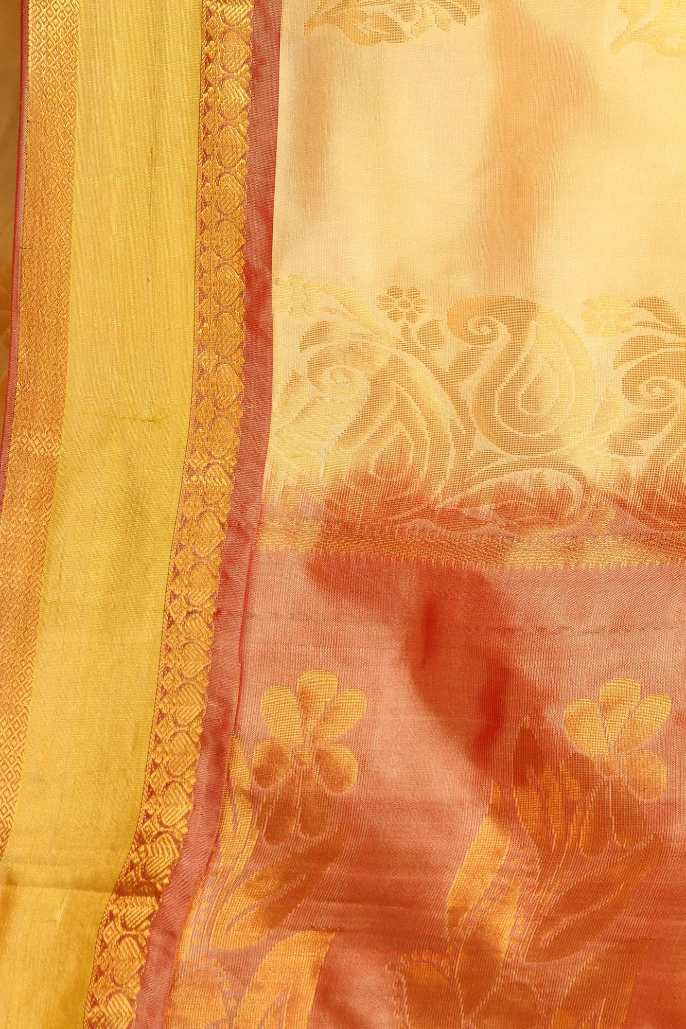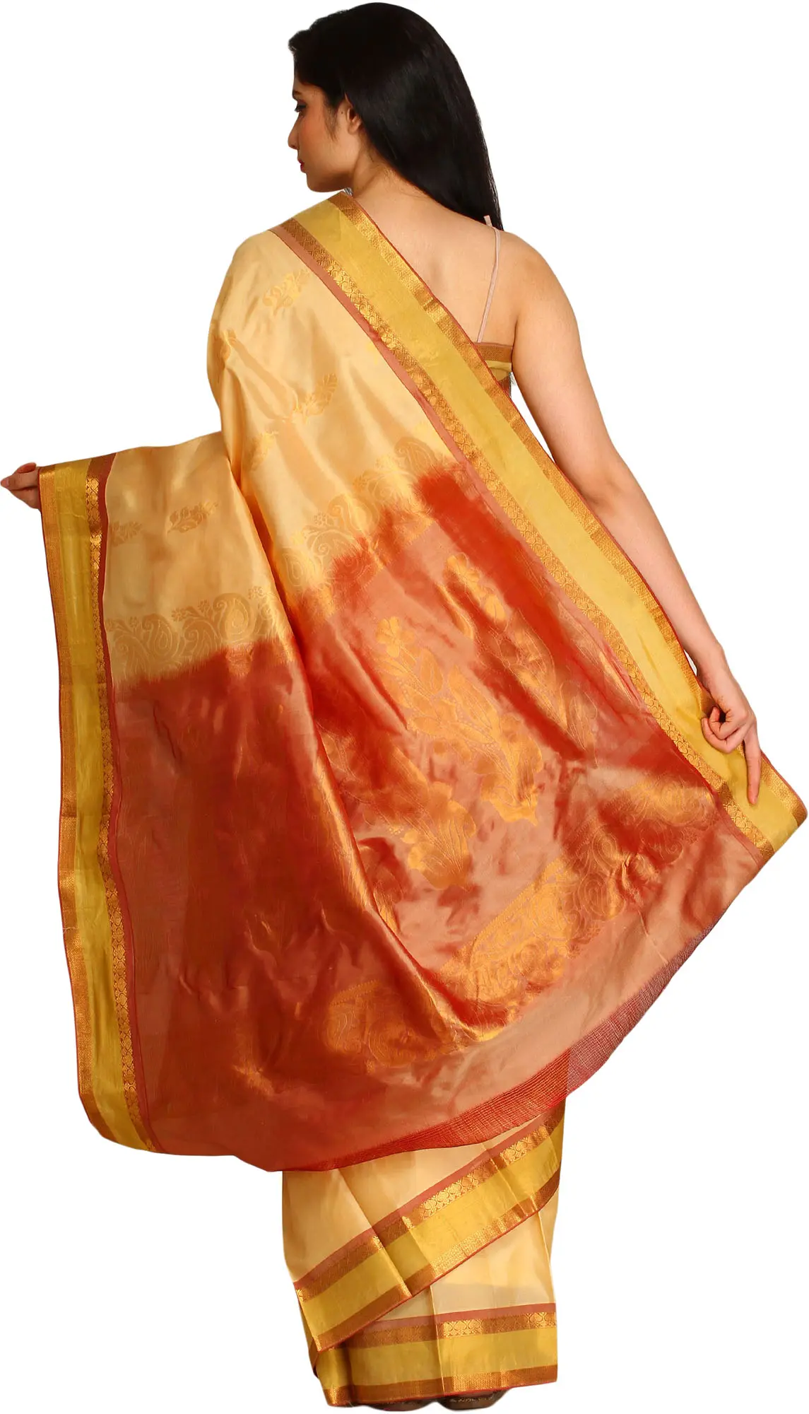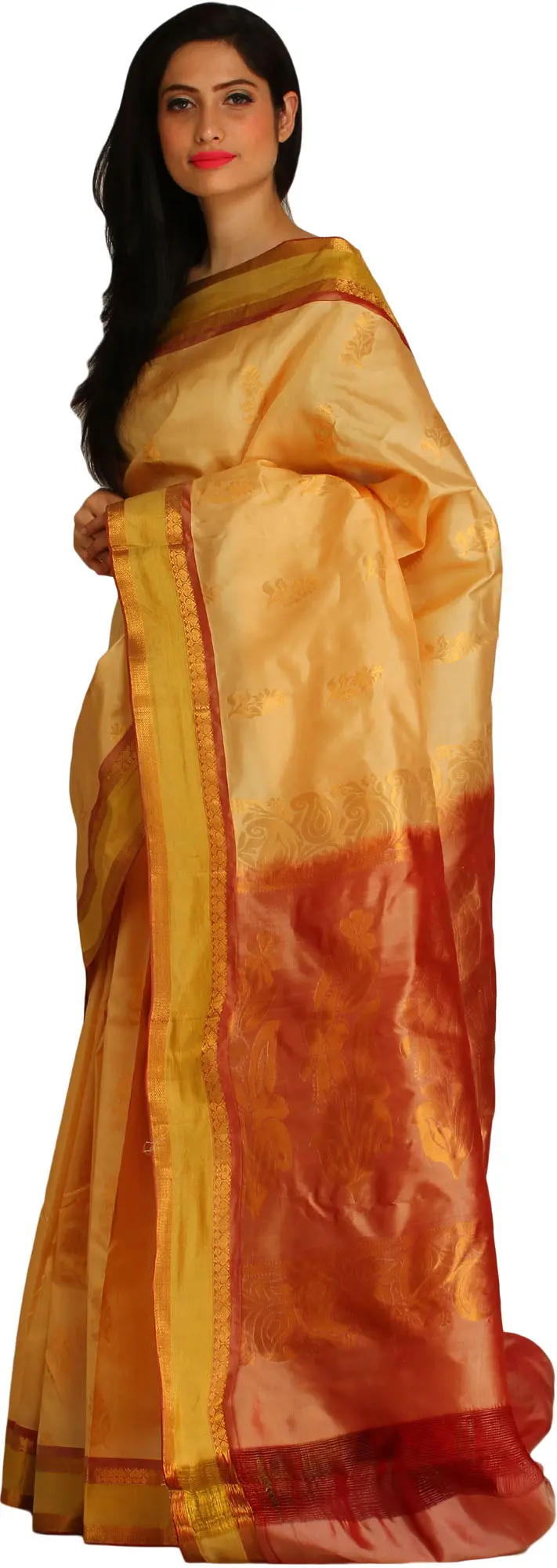 Art Silk Golden Zari Woven Saree with Sheer Stripe Pallu and Lotus-Wave Motif on Border from Tamilnadu