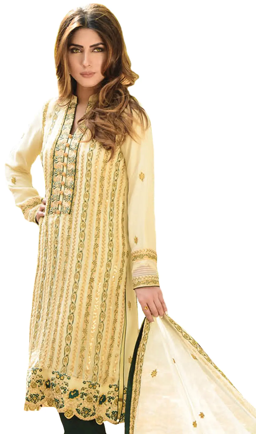 Step into a world of refined style with this exquisite choodidaar kameez suit, a testament to timeless fashion. The delicate ivory hue of the georgette kameez serves as a canvas for a symphony of intricate zari embroidery, meticulously crafted all over. This detailed artistry creates a mesmerizing pattern that catches the light, adding a subtle yet captivating sparkle. Accompanying the embroidery are carefully placed sequins, shimmering like dew drops, further enhancing the garment's opulent appeal.