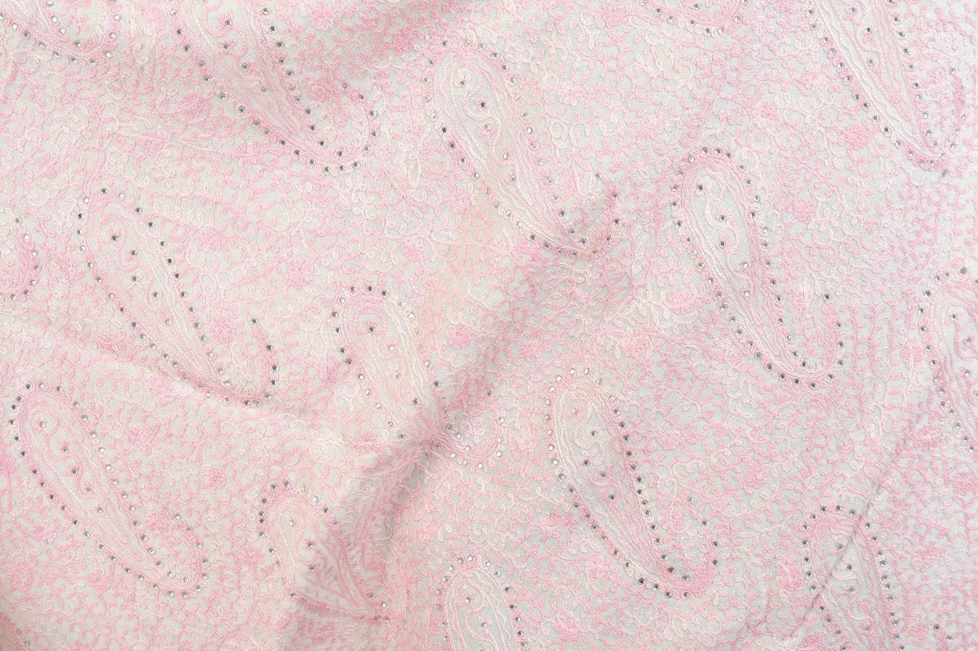 The true artistry of this shawl lies in its detailed Aari embroidery. Skilled artisans have painstakingly adorned the fabric with the iconic paisley motif, a symbol of fertility and prosperity. The delicate pink thread used for the embroidery creates a beautiful contrast against the ivory base, showcasing the subtle yet striking design. Each paisley is meticulously outlined and filled, creating a textured and visually captivating pattern that draws the eye. The precision of the Aari technique, using a hook to create loops of thread, results in a dense and lustrous embroidery that speaks of dedication and mastery.