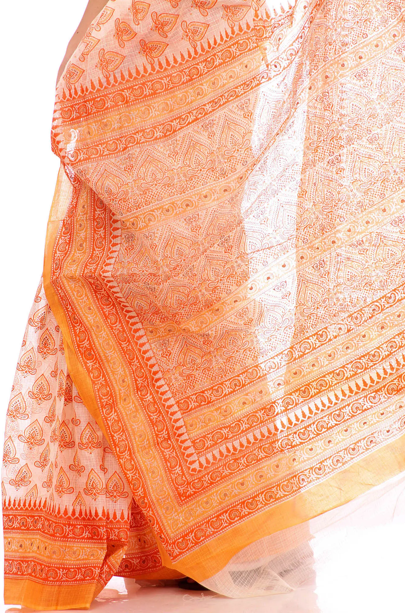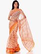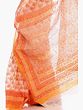 The captivating design of this sari features an all-over printed bootis pattern in a cheerful orange hue against a pristine ivory base. The intricate bootis, resembling stylized floral or paisley motifs, are meticulously printed, creating a visually appealing texture and depth. The contrast between the bright orange print and the soft ivory of the cotton creates a striking yet harmonious aesthetic. The border of the sari is adorned with a rich, vibrant orange, accentuated by complementary prints that add a touch of sophistication and completeness to the overall design. This thoughtful detailing ensures the sari stands out with its unique character.