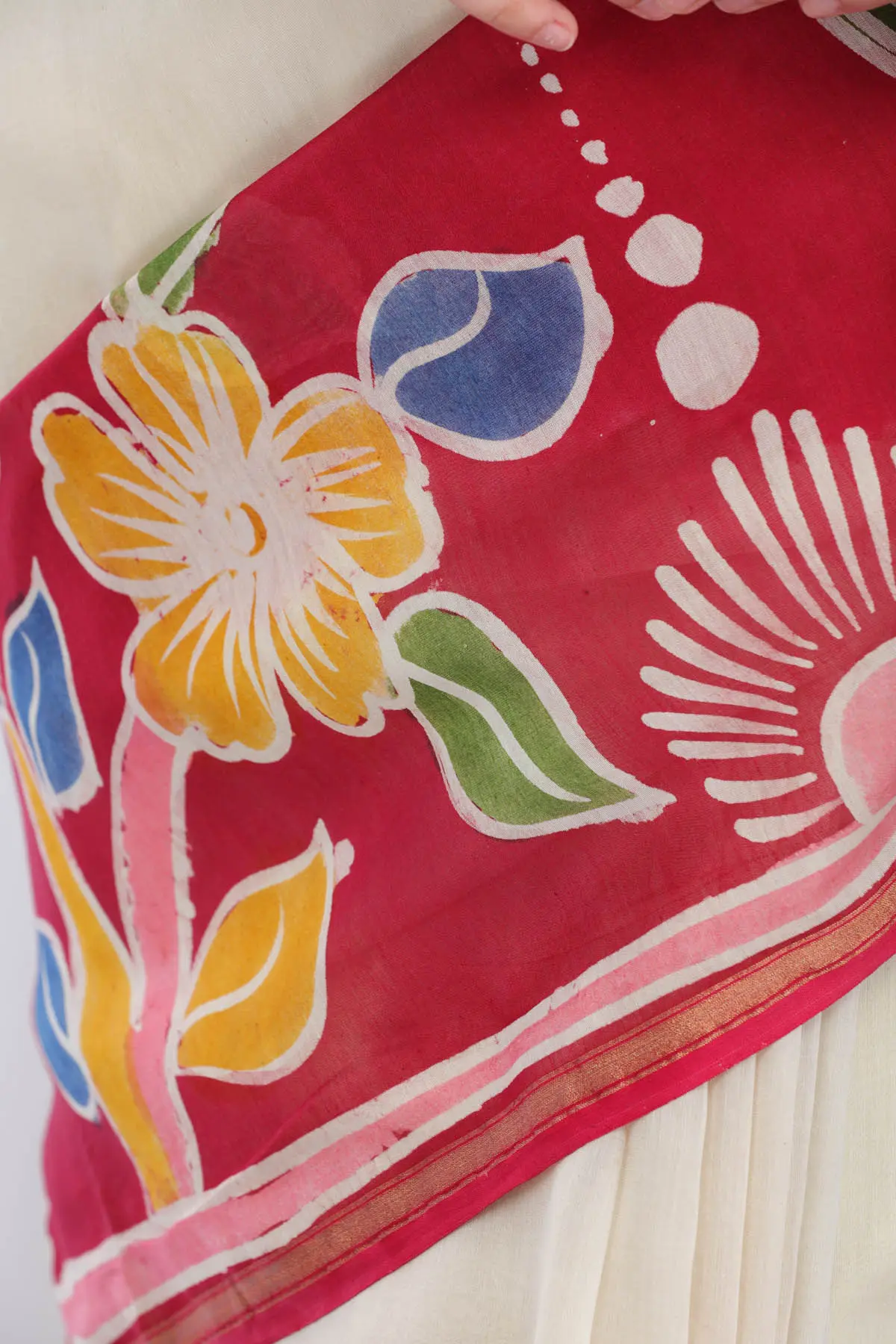 Batik Floral Printed Art Silk Dupatta from Telangana with Fringes