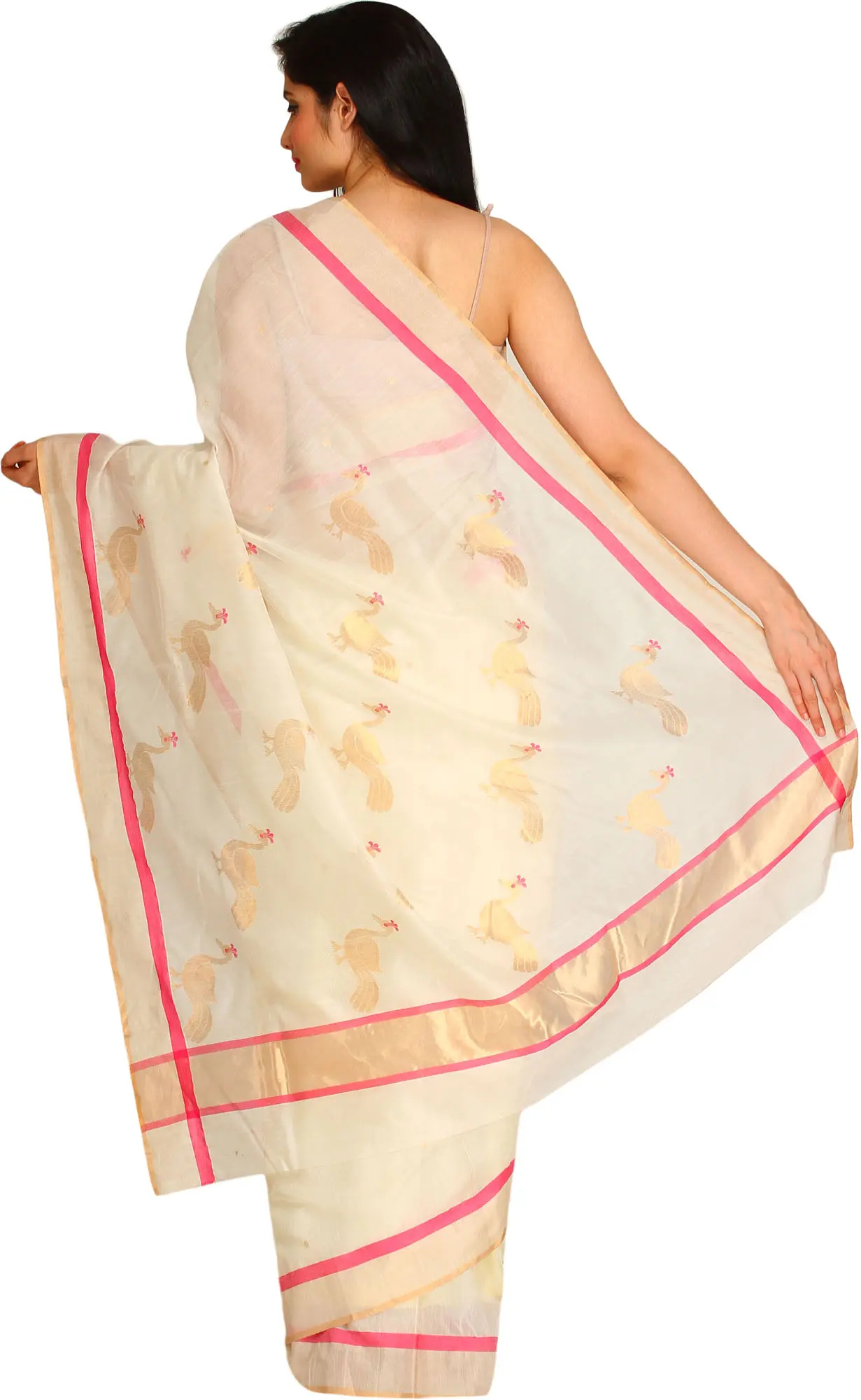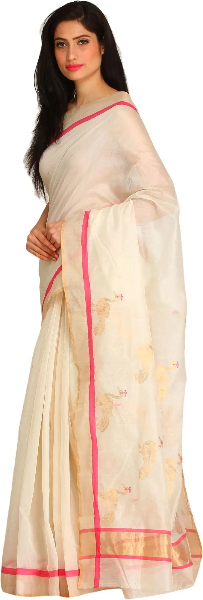 This would make it an unusual yet select addition to your trousseau. The gracious strip of pink along the border makes for an ultra-feminine statement. The strategic proportions of gold zari in this saree - the outer edge of the border as well as the booties on the pallu - add to its bridal appeal. A couple of such handpicked Chanderis would be great for wearing when meeting members of the extended family at your new home, especially if you team them with your signature gold pieces.