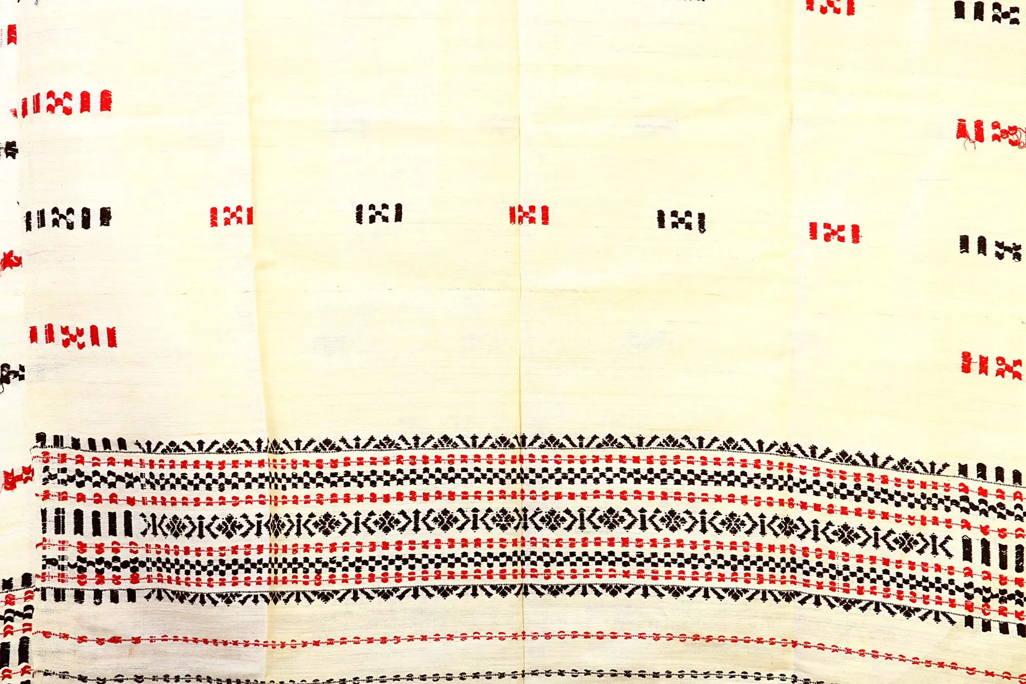 Discover the artistry and tradition of Nagaland woven into this exquisite ivory shawl. Crafted from pure Eri silk, renowned for its natural softness and subtle sheen, this piece offers a luxurious feel against the skin. The natural ivory hue serves as a beautiful canvas for the intricate patterns that adorn this hand-woven masterpiece. Each thread tells a story, meticulously placed by skilled artisans who carry forward generations of weaving heritage.