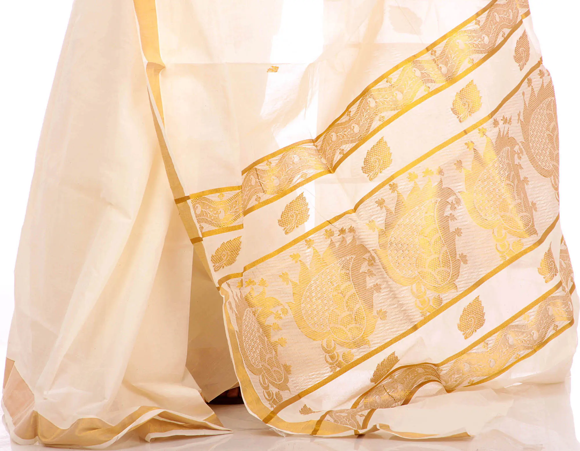 Ivory Kasavu Cotton Sari from Kerala with Golden Thread Weave