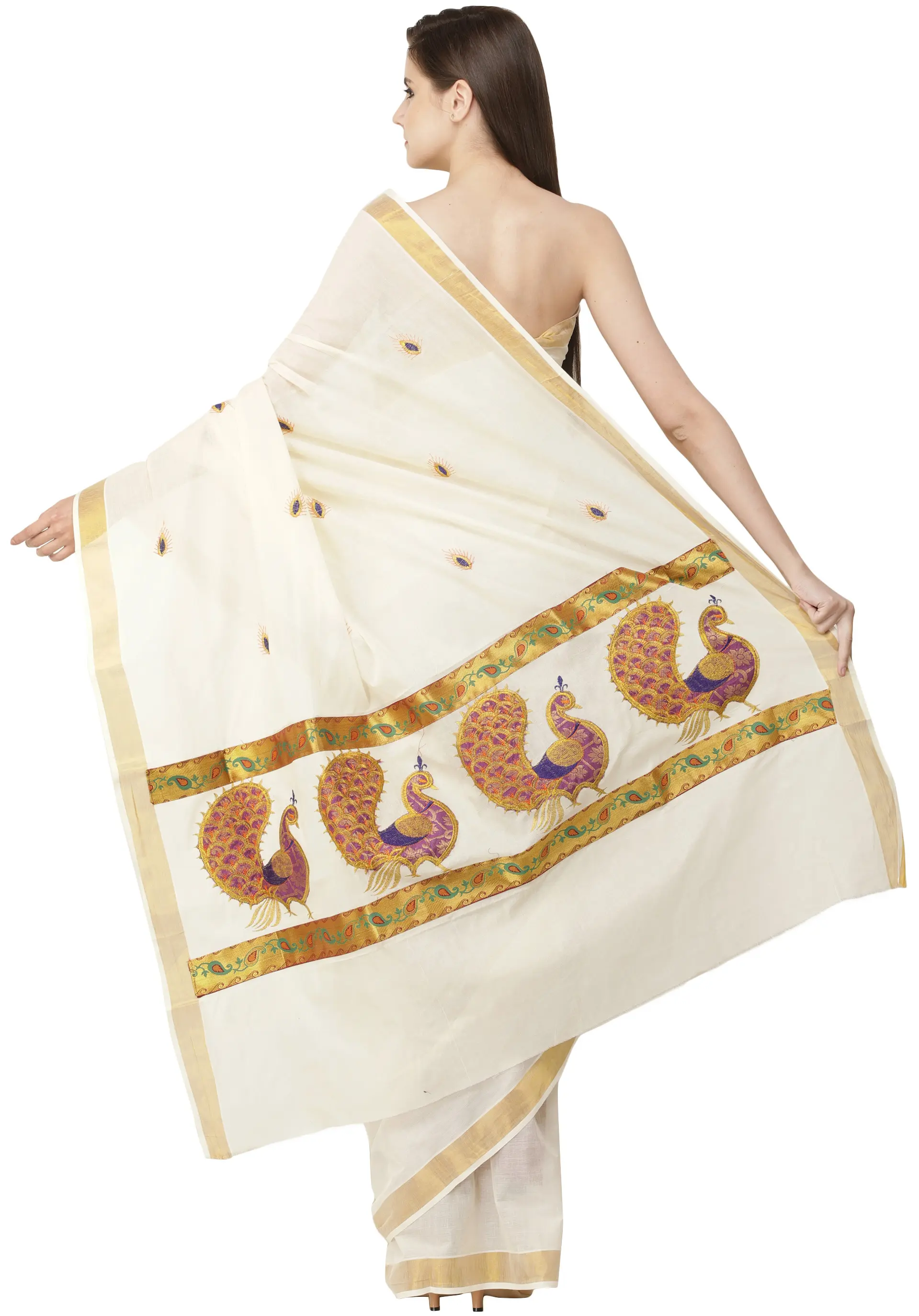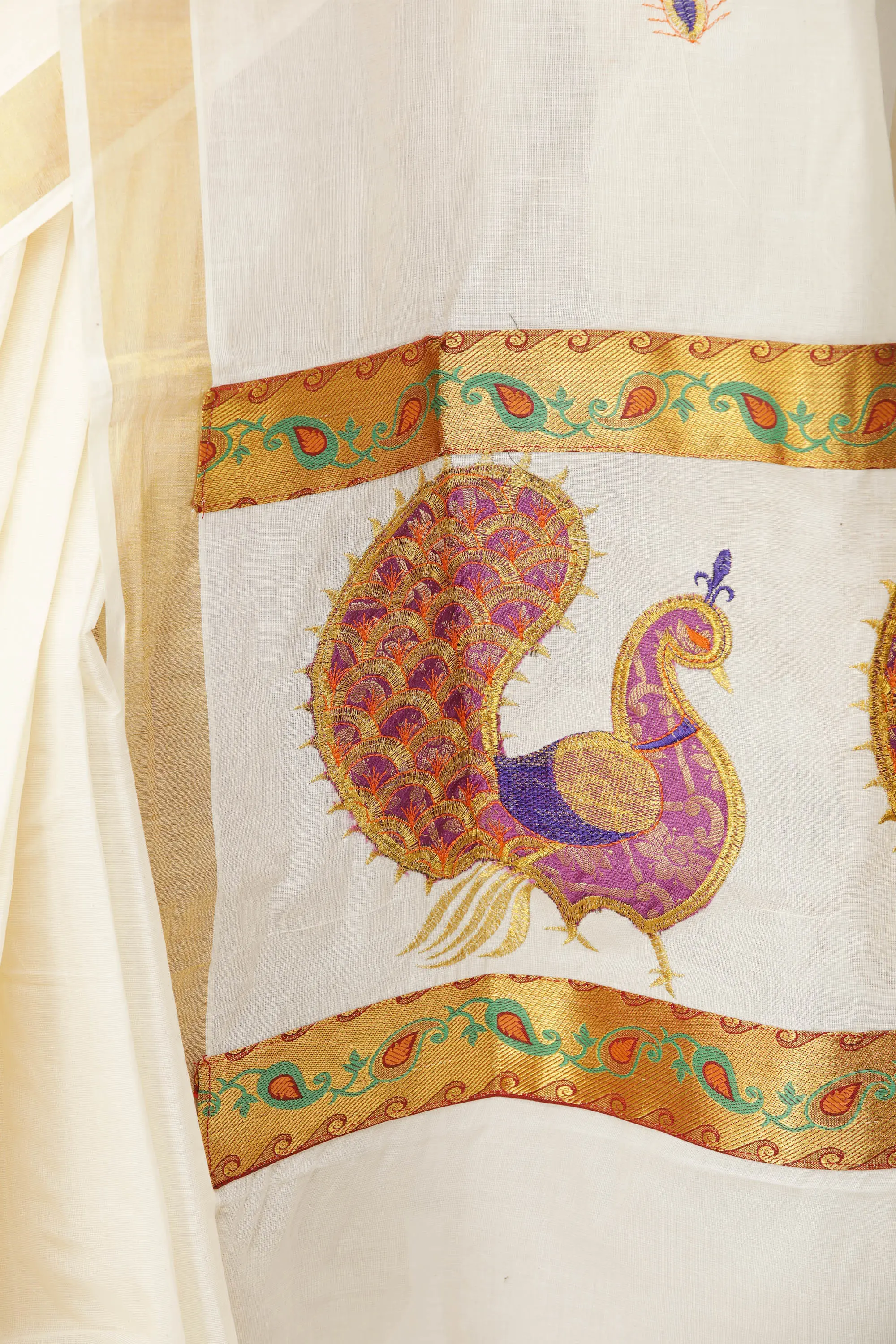 Ivory Kasavu Sari from Kerala with Embroidered Peacocks and Golden Border