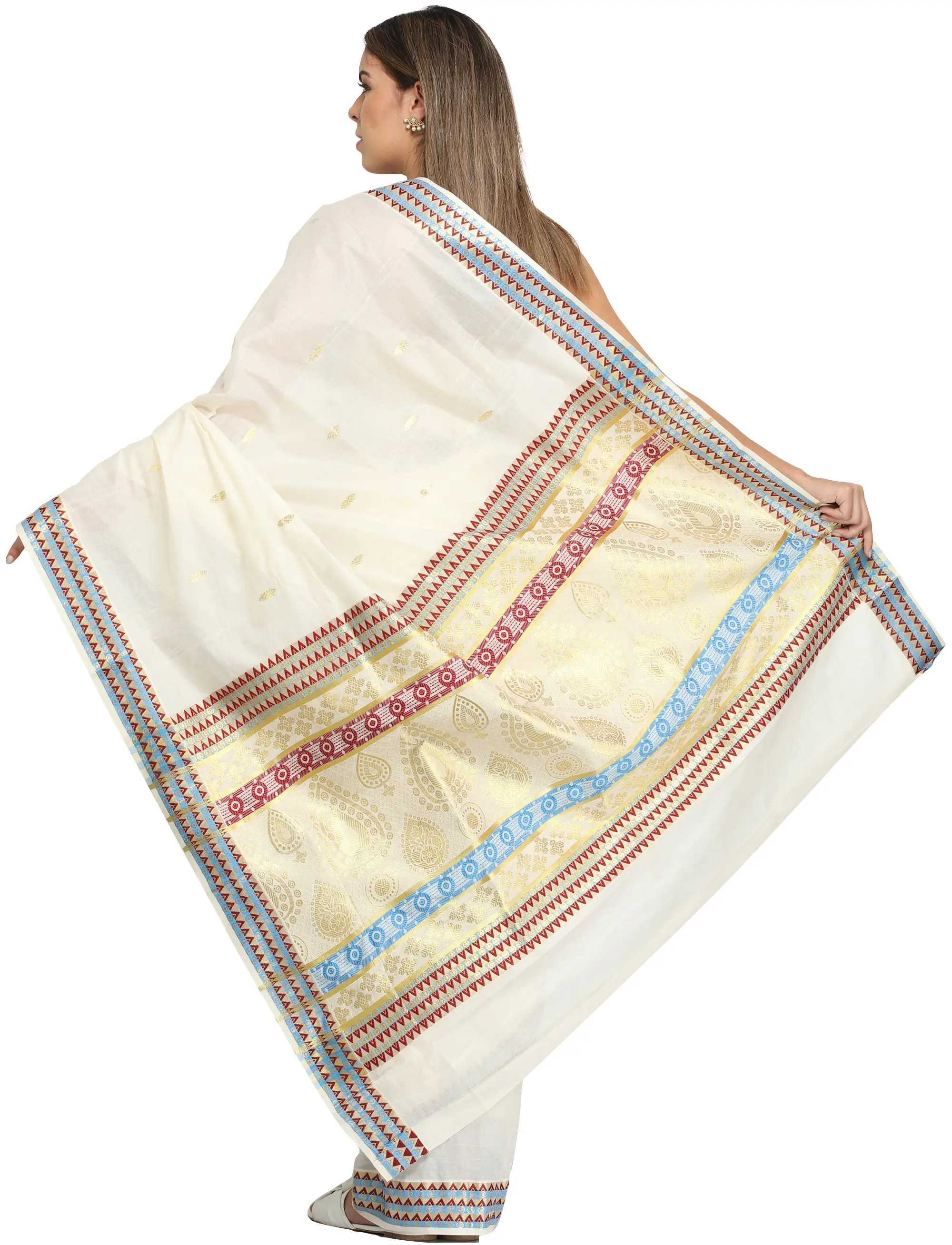The essence of this sari lies in its intricate detailing. Woven bootis, small and delicate, are scattered across the fabric, adding subtle texture and visual interest. The true showstopper, however, is the border. Featuring a captivating interplay of geometric patterns and traditional paisley motifs, the border is adorned with a harmonious blend of colors, including accents of red and blue against a backdrop of shimmering gold thread. This combination creates a striking yet balanced aesthetic, reflecting the skilled hand of the artisan and the rich weaving traditions of Kerala. The pure cotton fabric ensures a breathable and comfortable drape, allowing the wearer to move with ease and confidence.