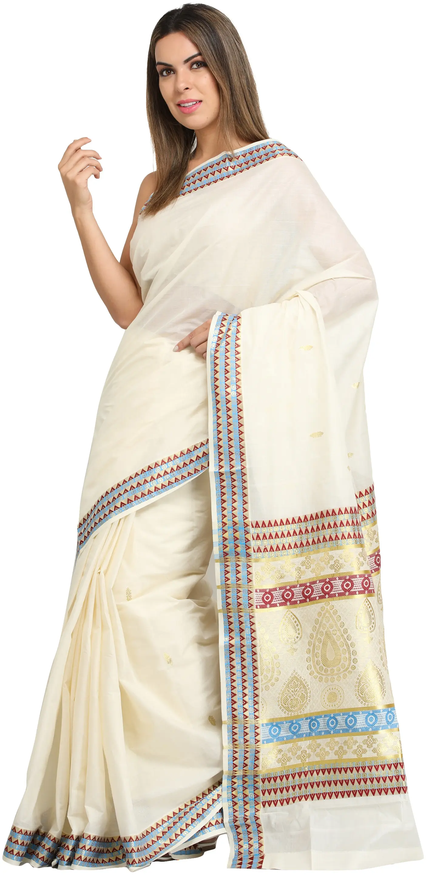 Ivory Kasavu Sari from Kerala with Woven Bootis and Border
