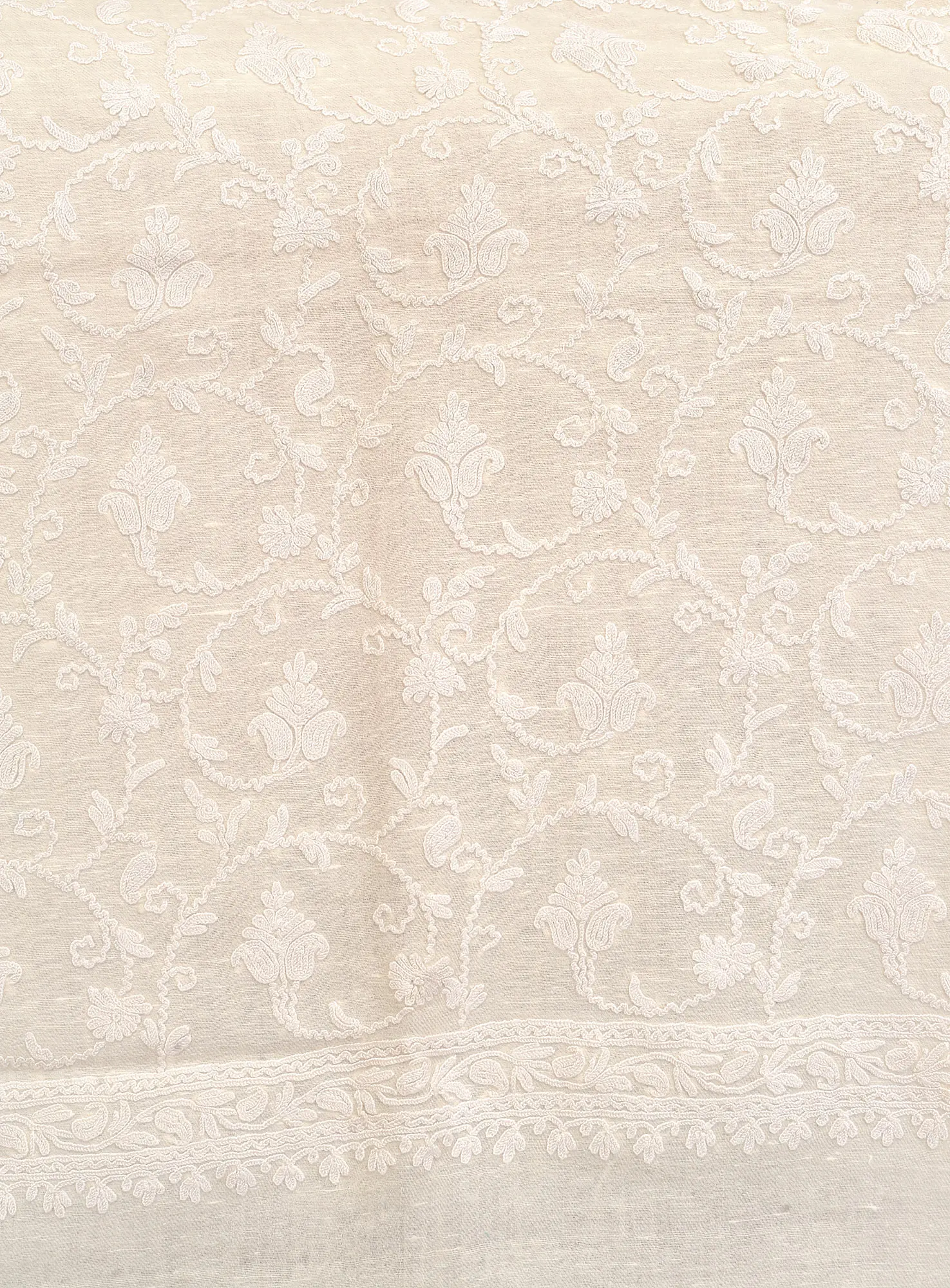 Ivory Stole from Kashmir with Floral Aari-Embroidery by Hand
