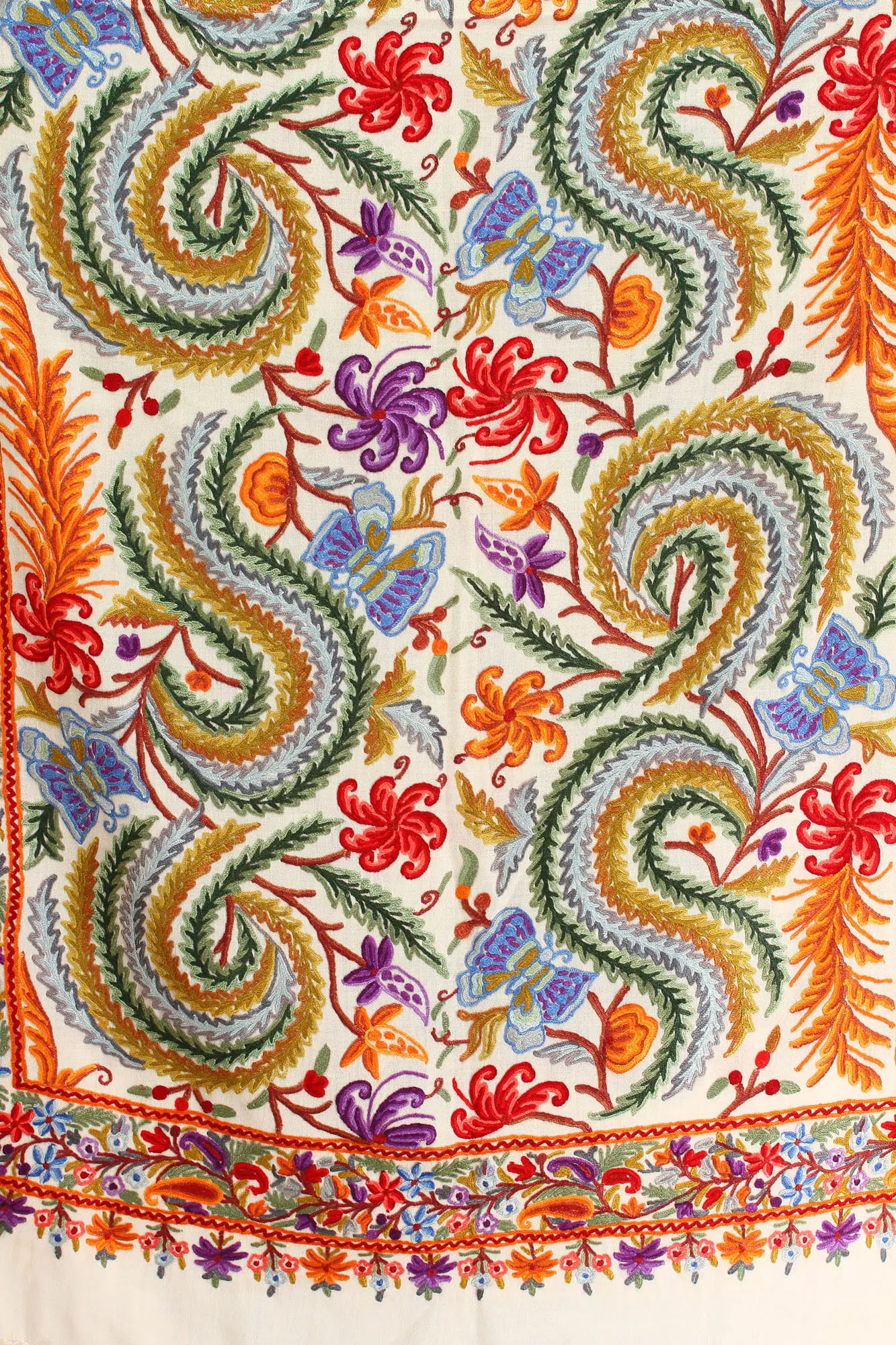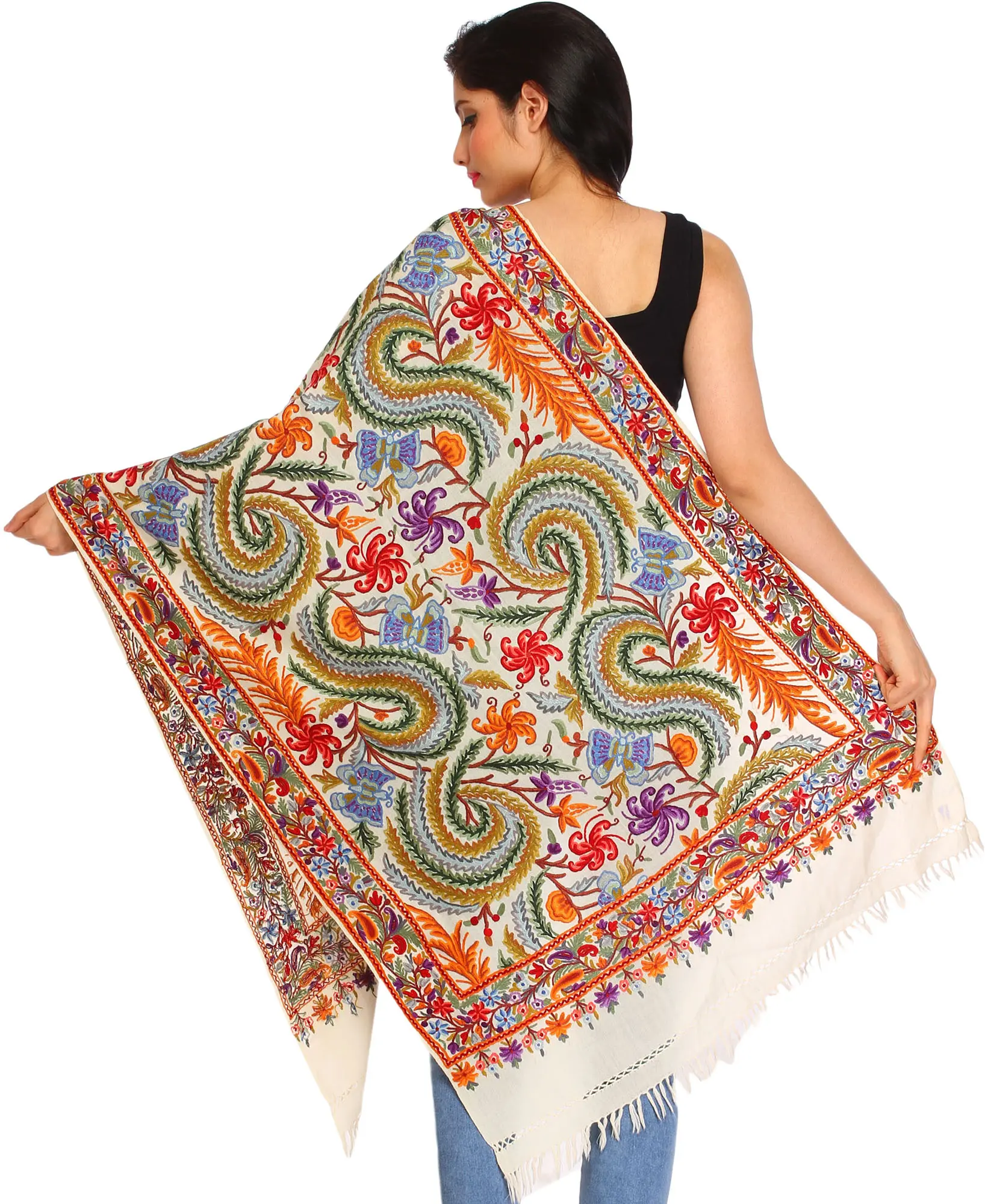 Ivory Kashmiri Stole with Aari Floral Hand-Embroidery and Butterflies