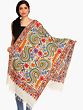 Experience the exquisite artistry of Kashmir with this stunning ivory wool stole. Crafted from the finest pure wool, this piece is a testament to centuries-old traditions of hand embroidery. The rich ivory base serves as a canvas for a vibrant and intricate display of Aari work, a needlecraft renowned for its delicate chain stitch that creates raised, textured patterns.