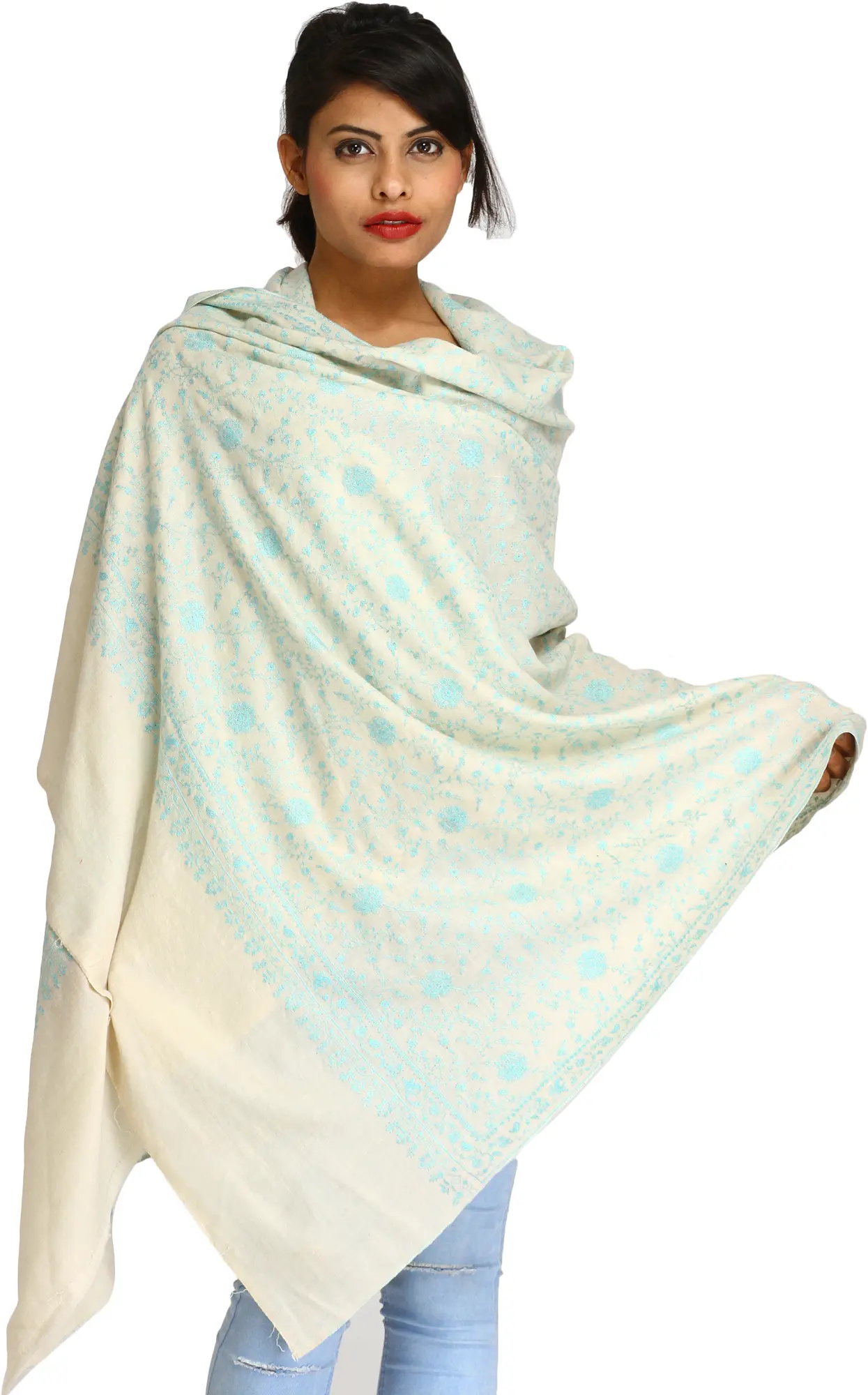 Kashmiri Pashmina Stole: Sozni Embroidered Floral Jaal Design