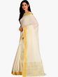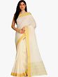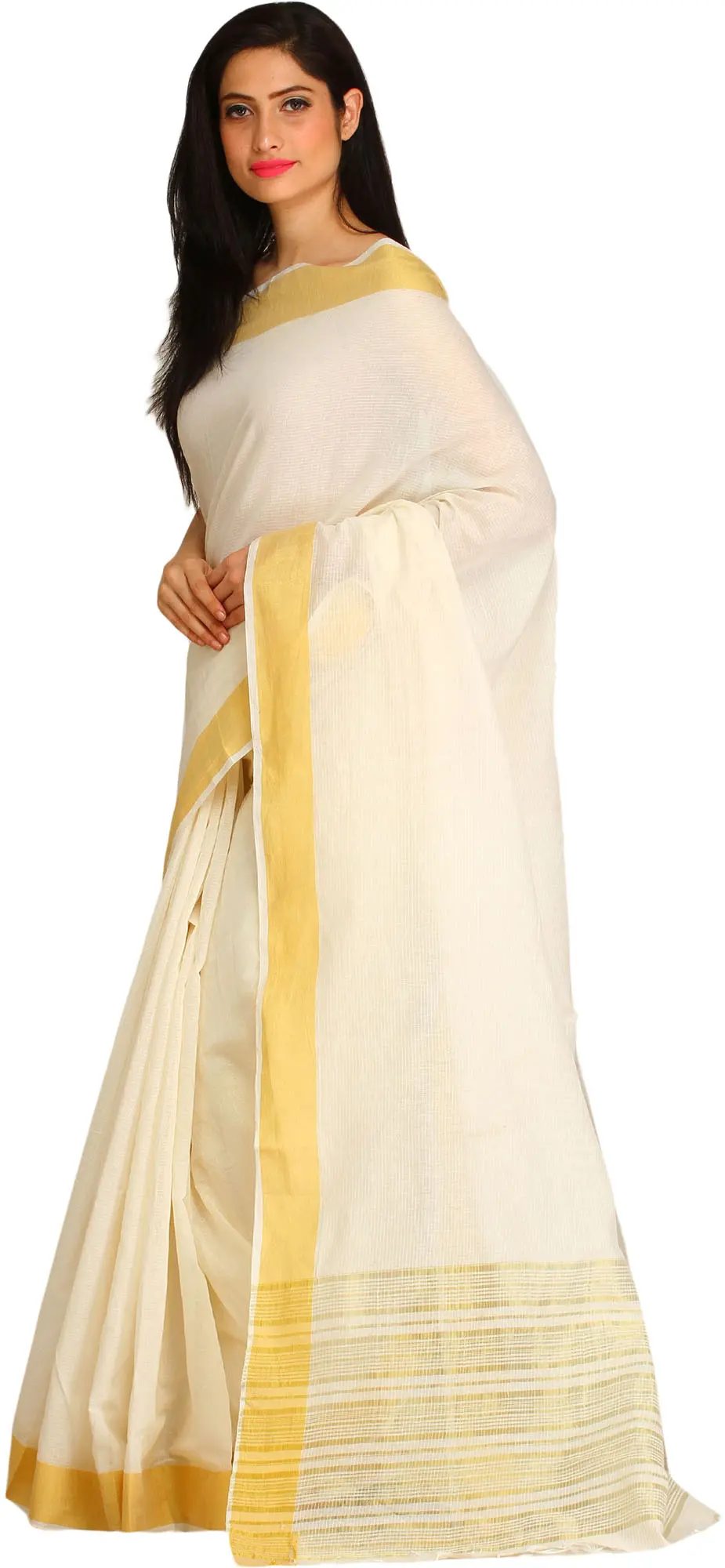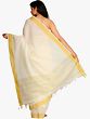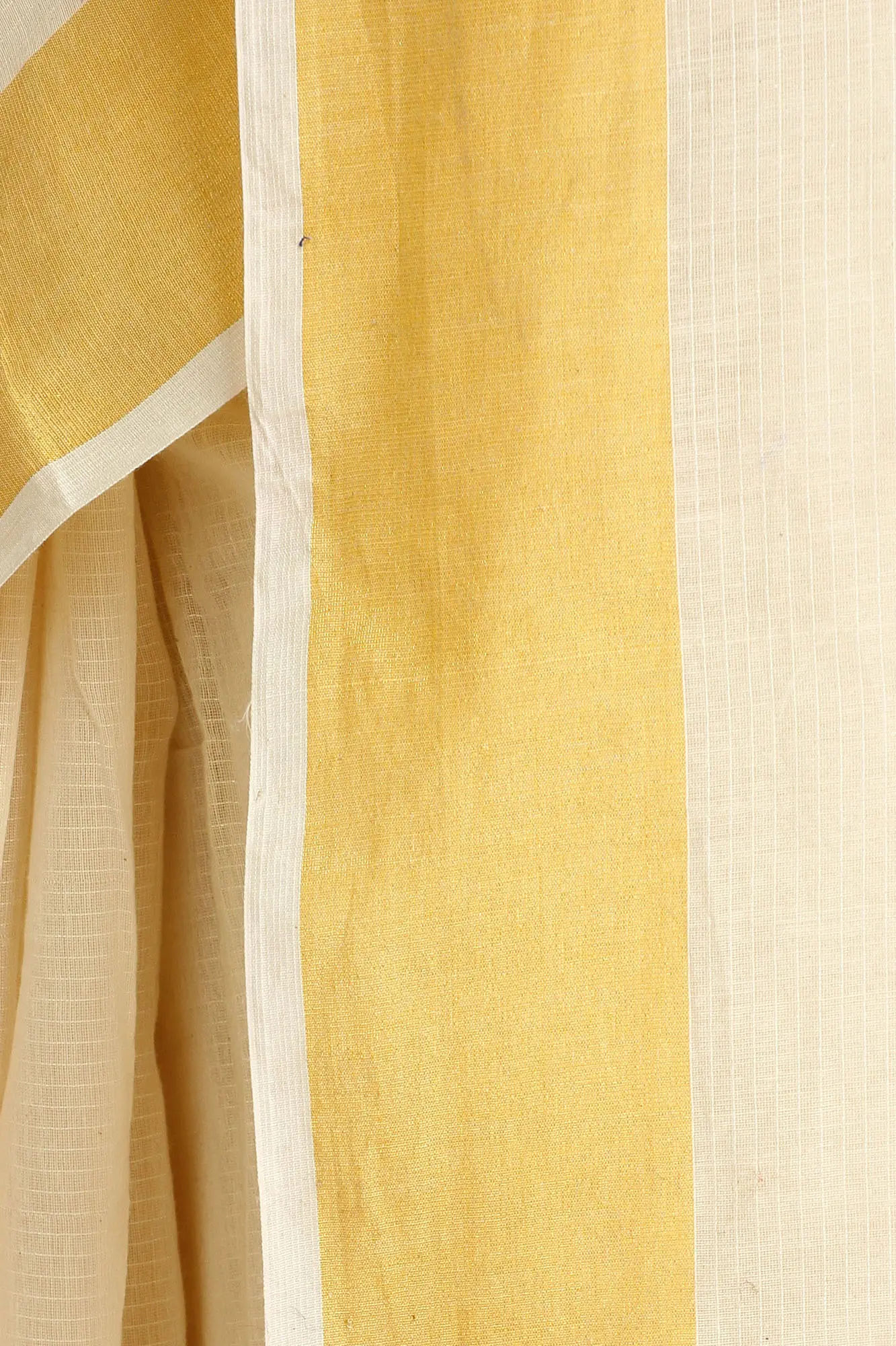 Ivory Puja Sari from Bengal with Woven Stripes in Self Color Thread and Golden Solid Border