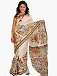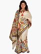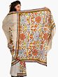 Ivory Sari from Kolkata with Printed Flowers and Kantha Embroidery By Hand