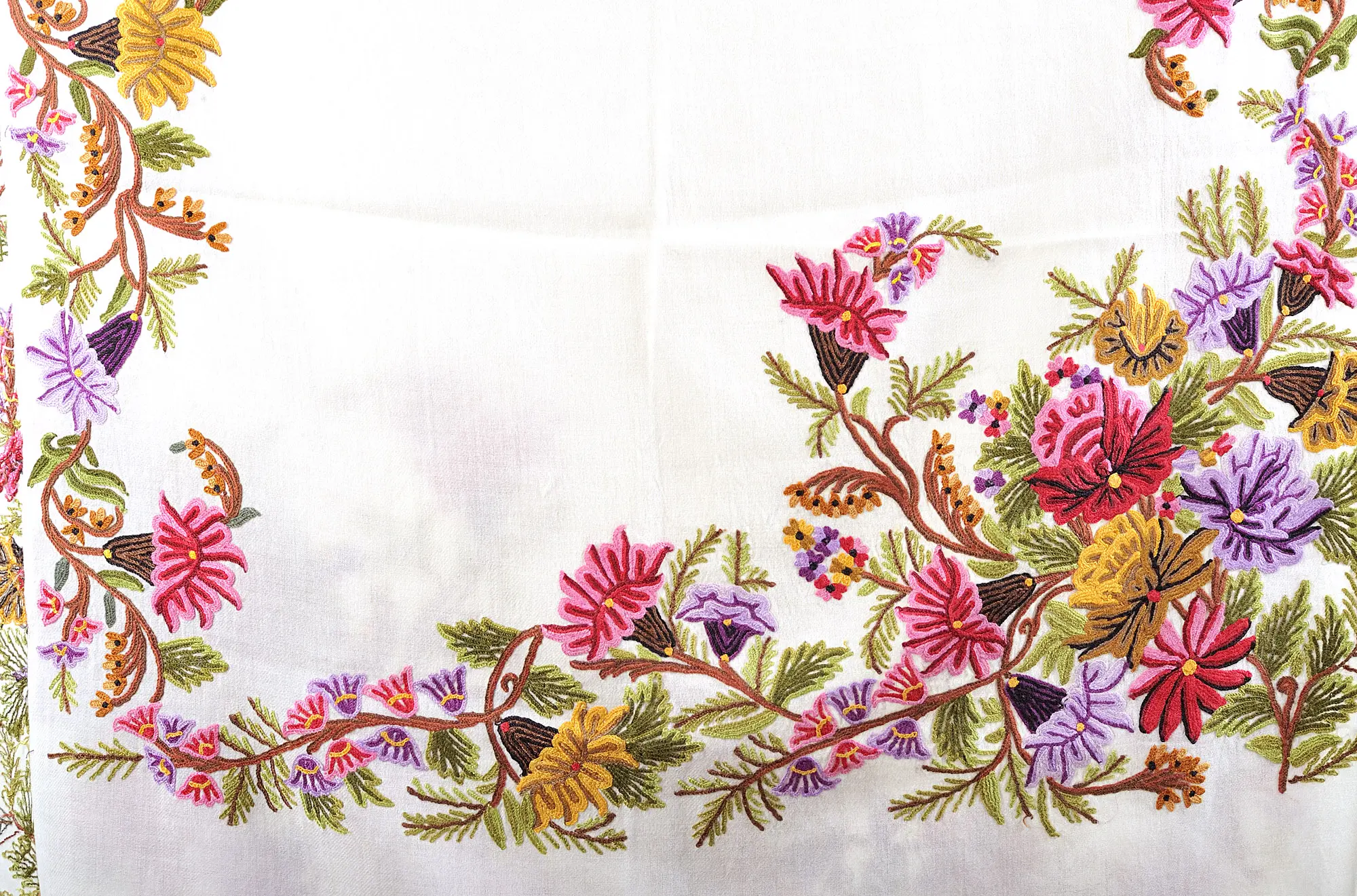 The magic lies in the meticulous hand-embroidery. The Aari technique, a traditional Kashmiri craft, involves a special hook that creates fine, chain-like stitches, allowing for the creation of detailed and delicate patterns. Each flower, each leaf, and each vine on this stole has been brought to life by the skilled hands of artisans who have honed their craft over generations. The floral motifs are a celebration of nature's bounty, bursting with a riot of colors – vivid pinks, deep purples, sunny yellows, and rich reds, all interwoven with earthy greens and browns. The embroidery flows gracefully along the edges and drapes elegantly across the fabric, creating a captivating visual narrative.