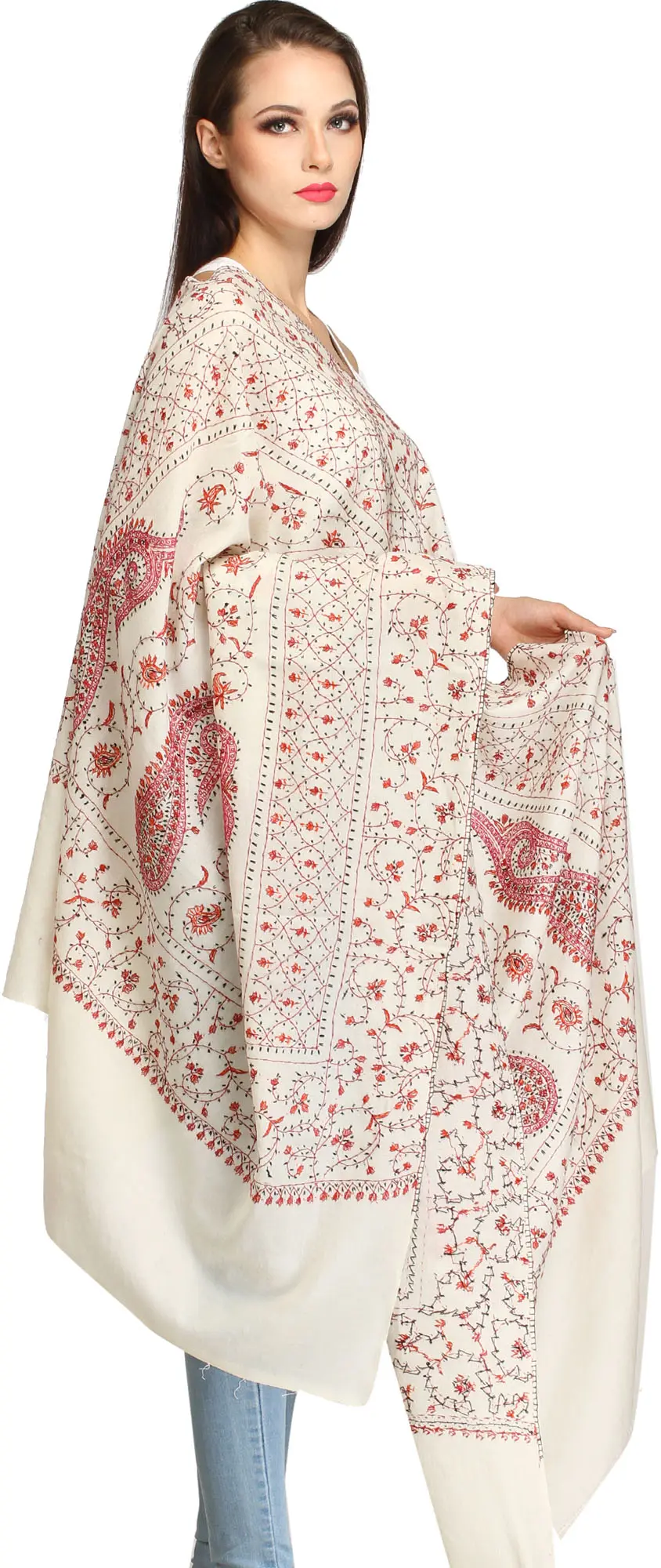 Ivory Tusha Shawl from Kashmir with Sozni Hand-Embroidery All-Over