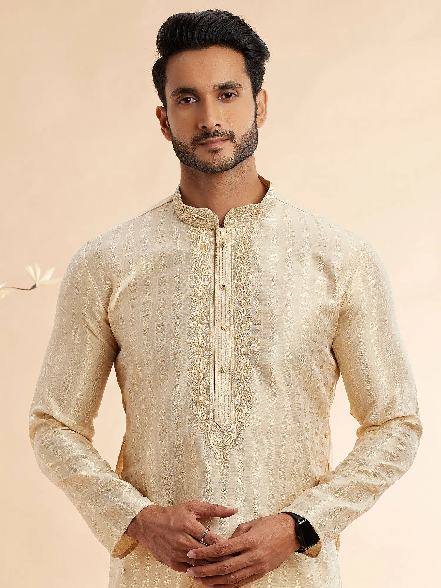 Wedding Kurta Pajama Set with Embroidered Collar and Jacquard Woven Paan Leaves