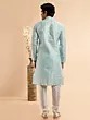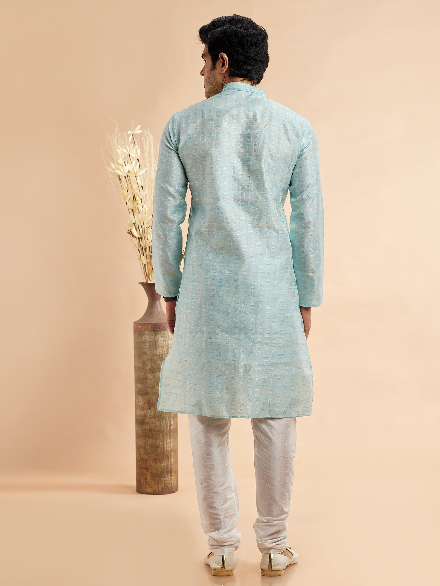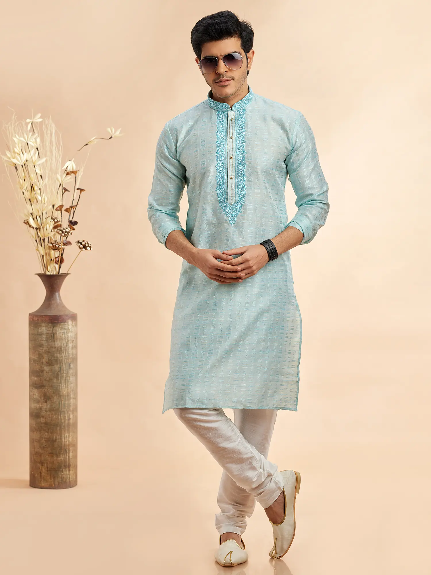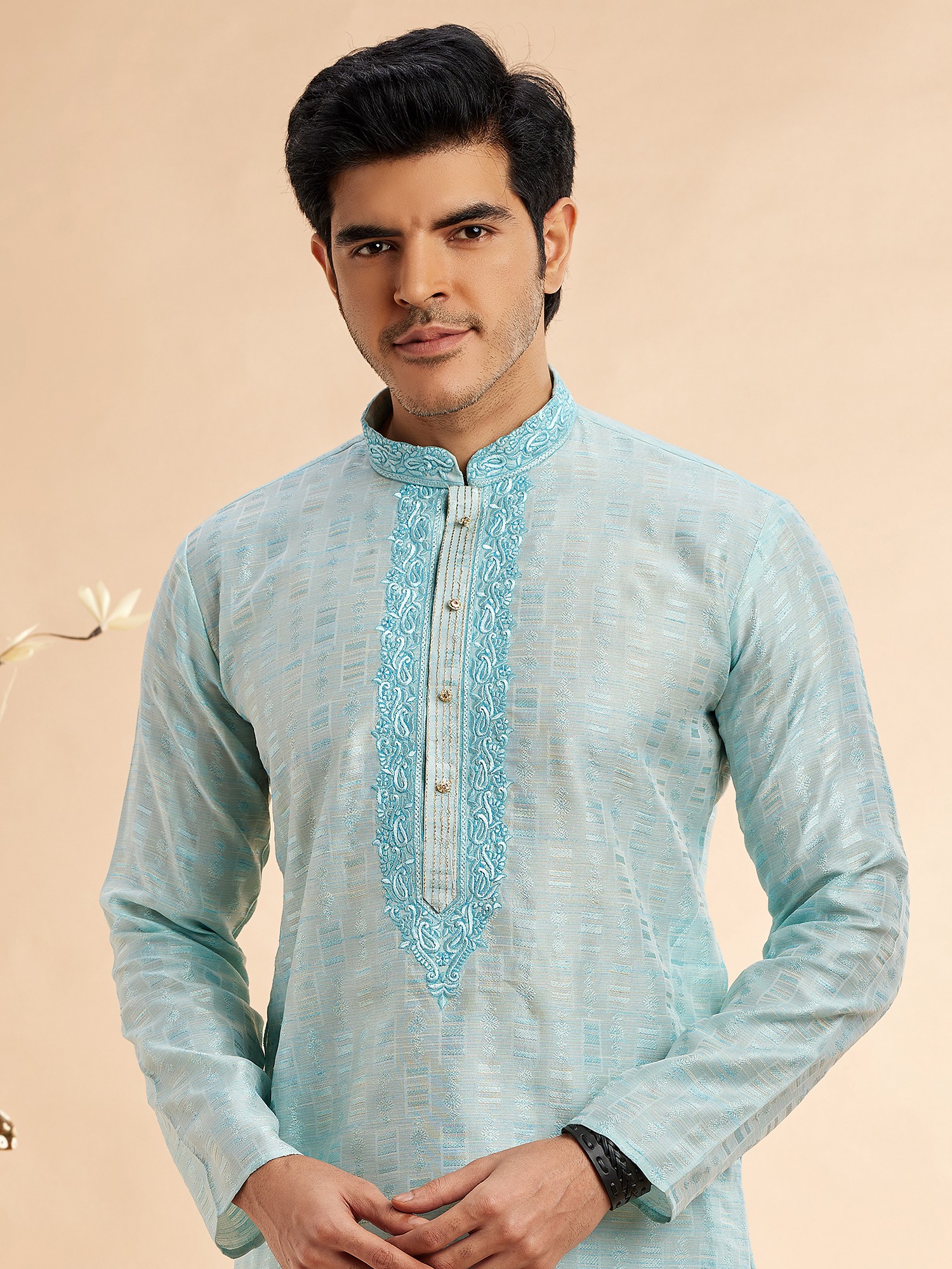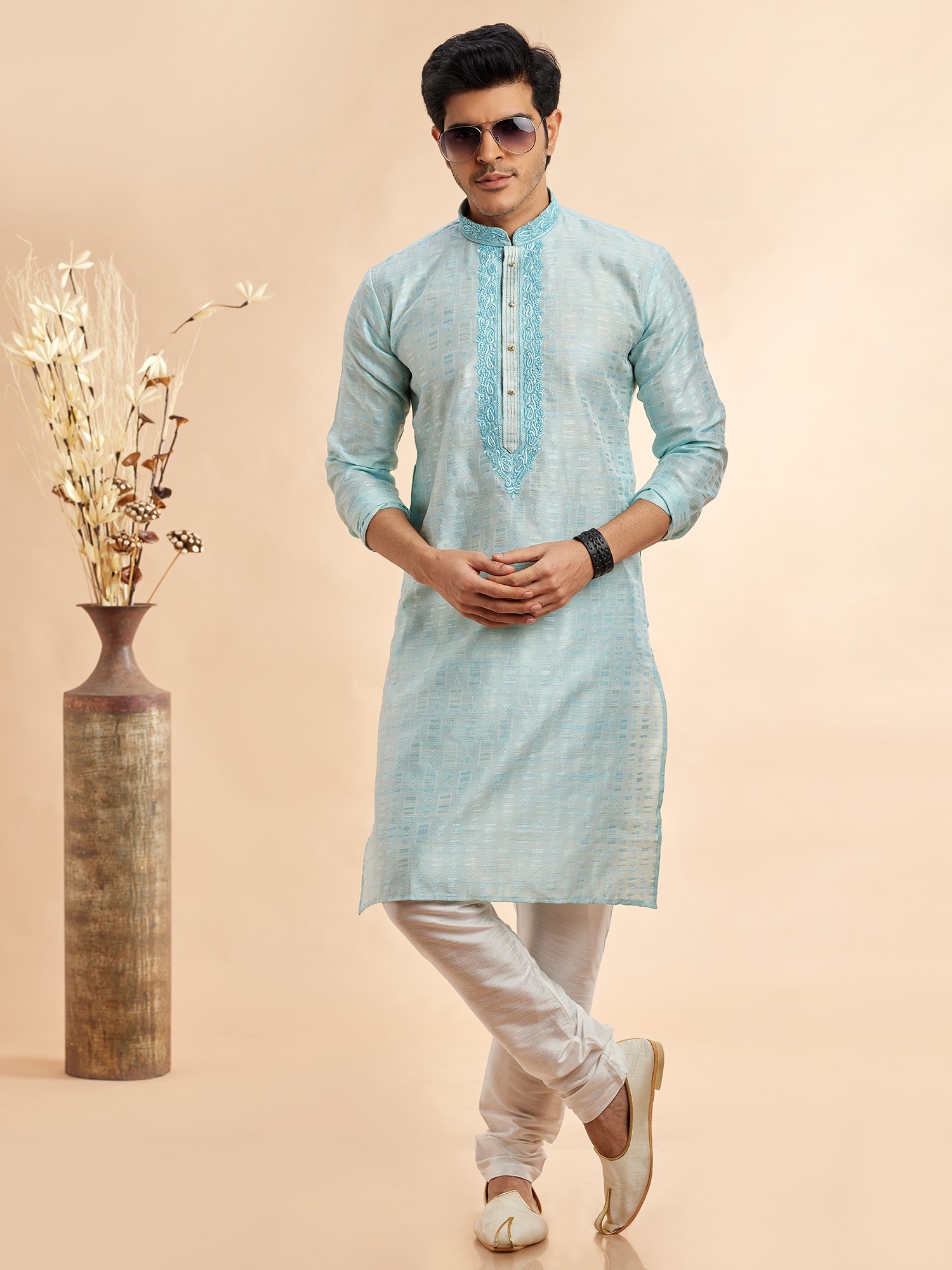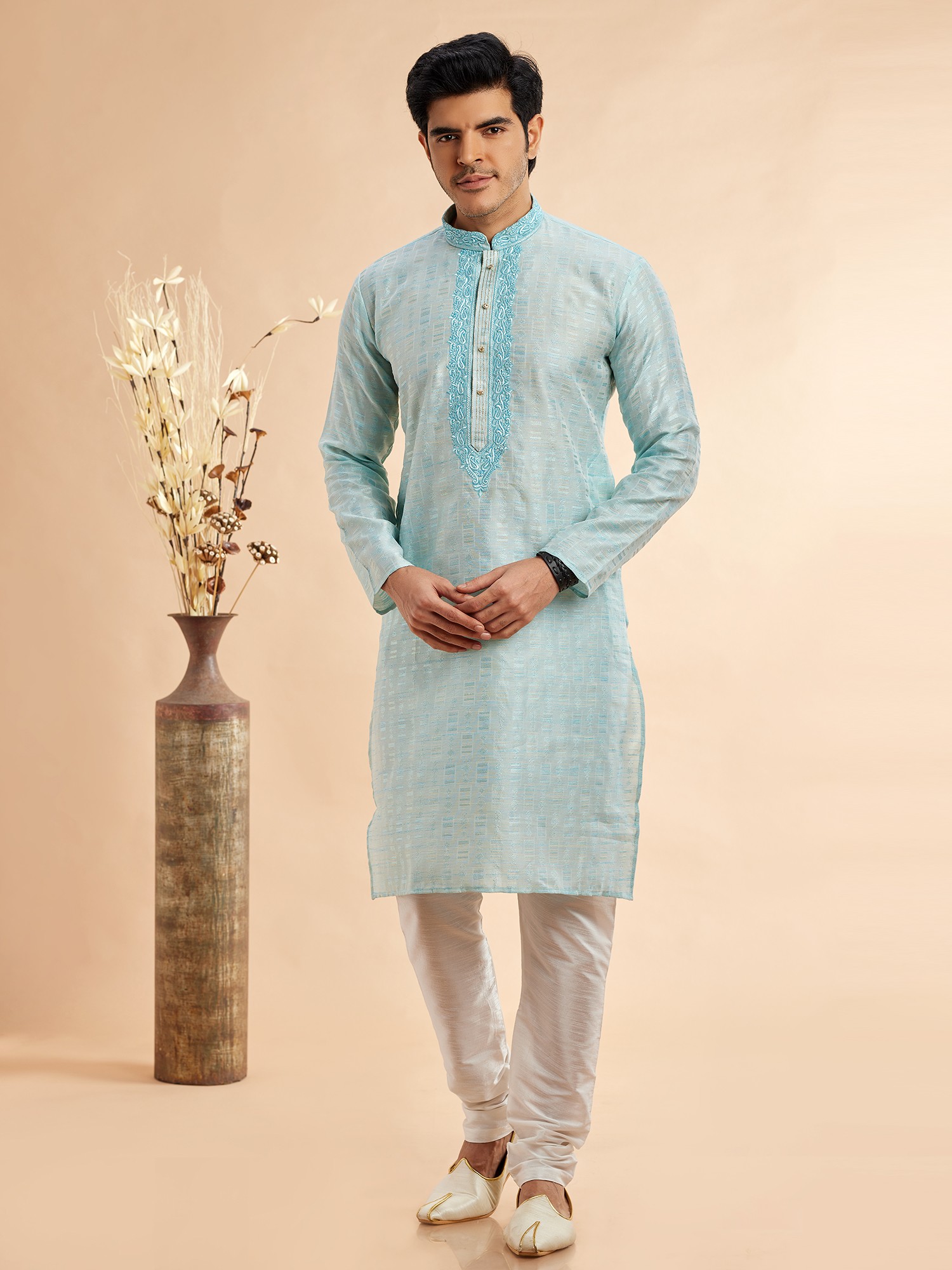 The kurta itself is a masterpiece, woven from premium Jacquard Art Silk that provides a sophisticated drape and a visually appealing textured pattern. The fabric is lightweight and breathable, ensuring comfort even during long celebrations. The highlight of this ensemble is the intricate machine work embroidery adorning the neckline and placket. Delicate patterns in a contrasting yet complementary shade of blue create a focal point, adding a touch of opulence without being overwhelming. The full sleeves and classic mandarin collar contribute to a timeless silhouette, making this kurta a versatile piece that can be styled in numerous ways.