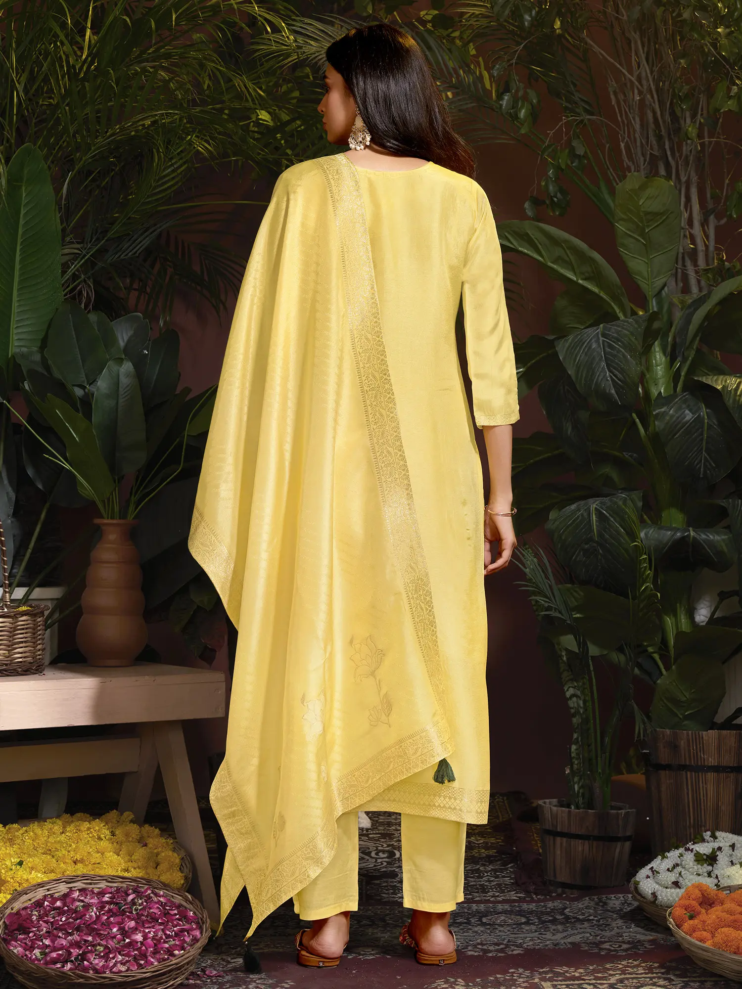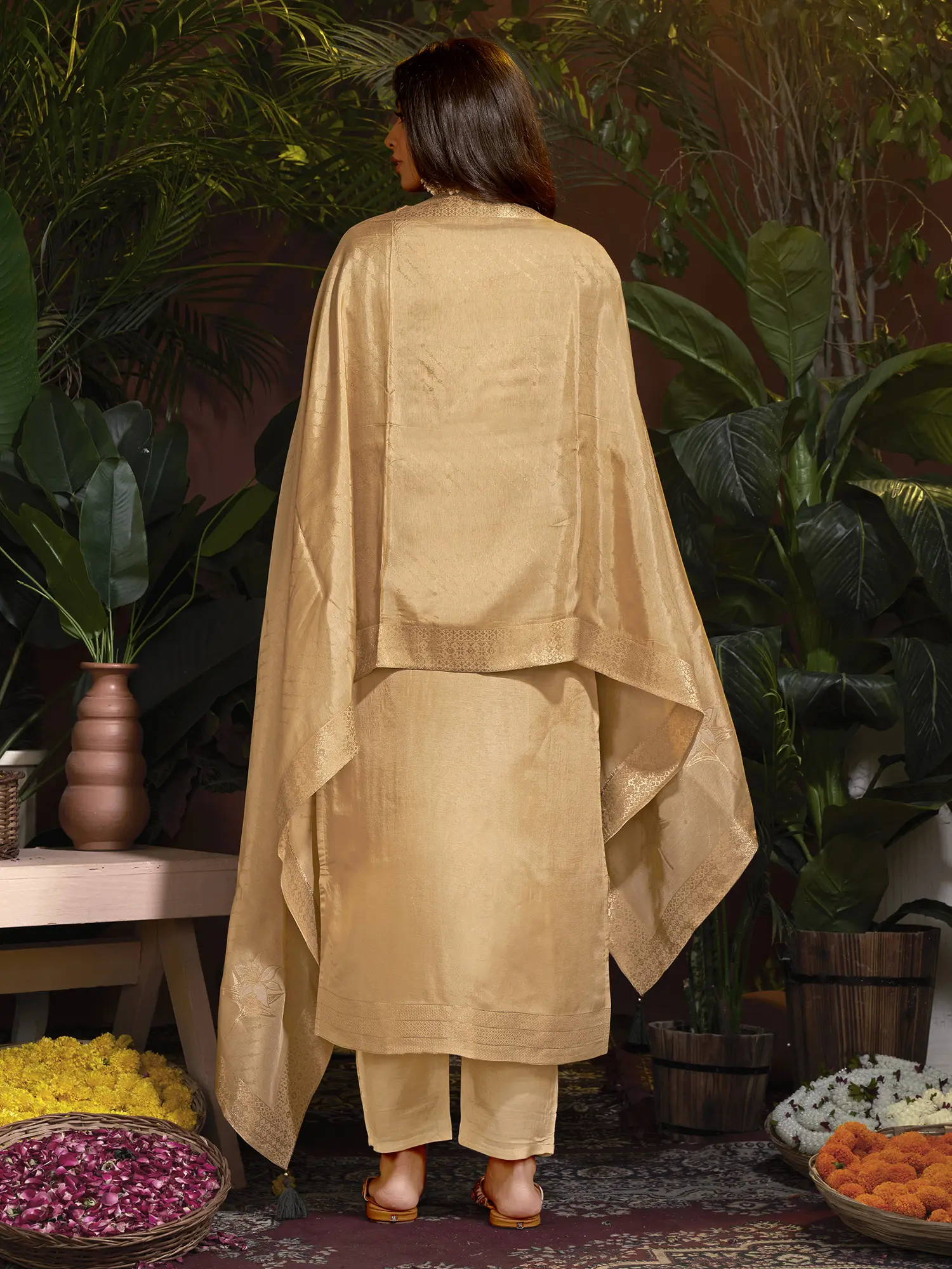 Made with natural viscose, the salwar and kurta have a soft and shimmering look, enhanced by tiny butis and golden details on the border.