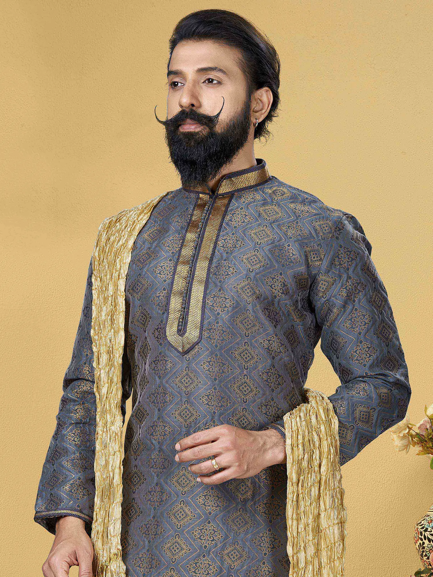 Embrace tradition with an air of sophistication with this exquisite Jacquard Silk Kurta and Pajama set, designed to make you stand out at any wedding or festive occasion. The rich indigo-blue hue of the kurta is a deep, captivating shade, reminiscent of twilight skies, offering a timeless and regal aesthetic. Crafted from luxurious Jacquard silk, the fabric itself is a masterpiece, woven with intricate patterns that catch the light and add a subtle shimmer to your presence. The kurta features a classic silhouette that balances comfort with elegance. The intricate Jacquard weave extends across the entire garment, creating a subtle yet striking texture. Adorning the neckline is a band of contrasting gold embroidery, meticulously stitched to provide a touch of opulence. This detail is echoed on the cuffs, offering a harmonious balance to the overall design. The mandarin collar adds a touch of refinement, framing the face and enhancing the traditional appeal. The accompanying pajama is designed for ultimate comfort and a seamless look. Tailored in a complementary shade, it ensures ease of movement without compromising on style. The fabric choice for the pajama harmonizes with the kurta, creating a cohesive and polished ensemble. Adding a final flourish of grandeur is the accompanying dupatta. Draping elegantly over the shoulders, this golden-hued scarf is woven with a textured finish, offering a beautiful contrast to the kurta's intricate pattern. The delicate tassels that adorn its edges add a playful yet refined touch, completing the festive look. This set is more than just attire; it's an embodiment of cultural heritage and modern elegance, perfect for making a lasting impression.