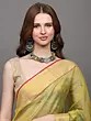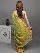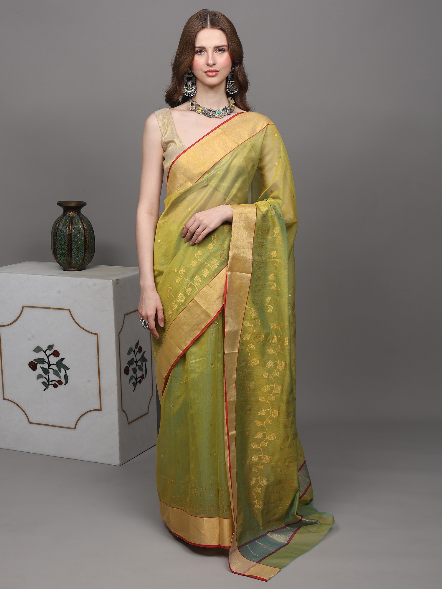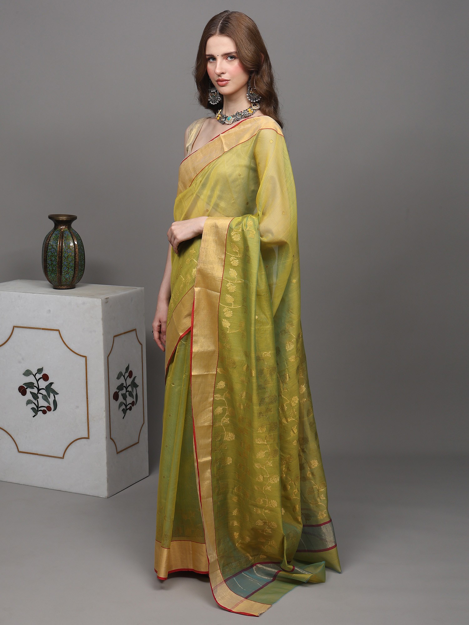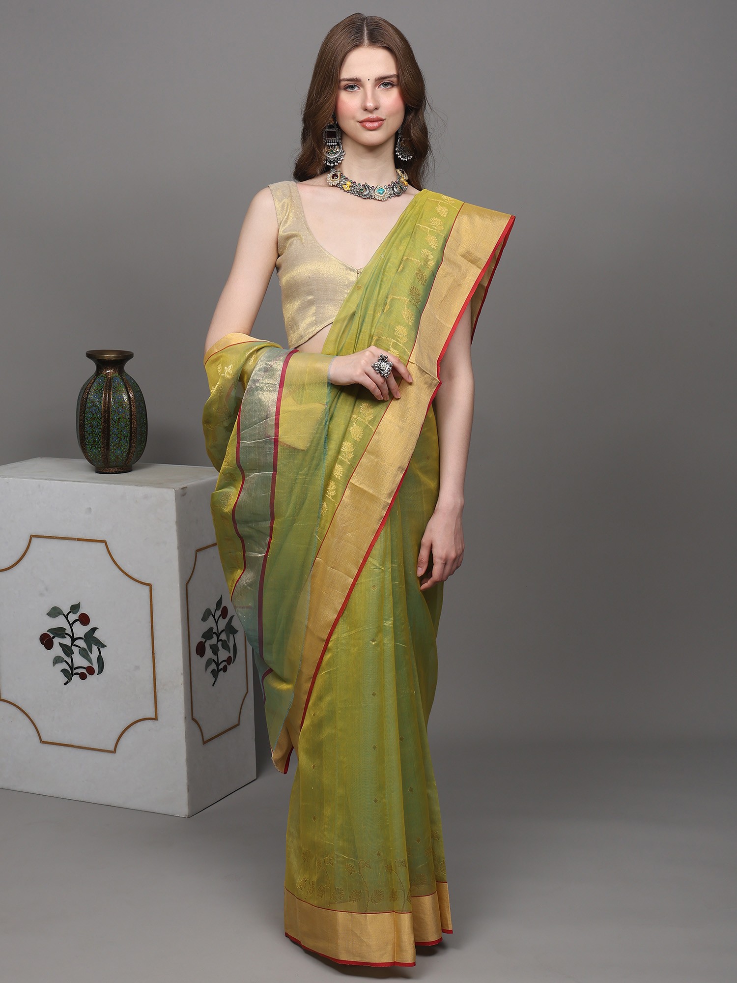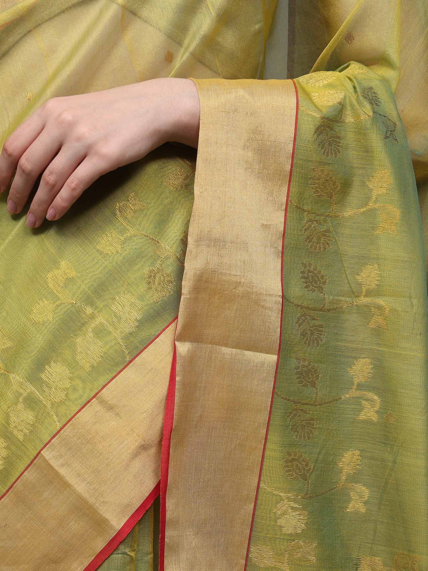 This jade-lime Chanderi saree is a tale to nature's bounty. Hand-woven flowers bloom on its canvas, a tribute to the weaver's love for the craft. The golden border, like rays of sunlight, adds a touch of radiance to your every step. In this saree, you are a walking garden, a symbol of beauty and grace.