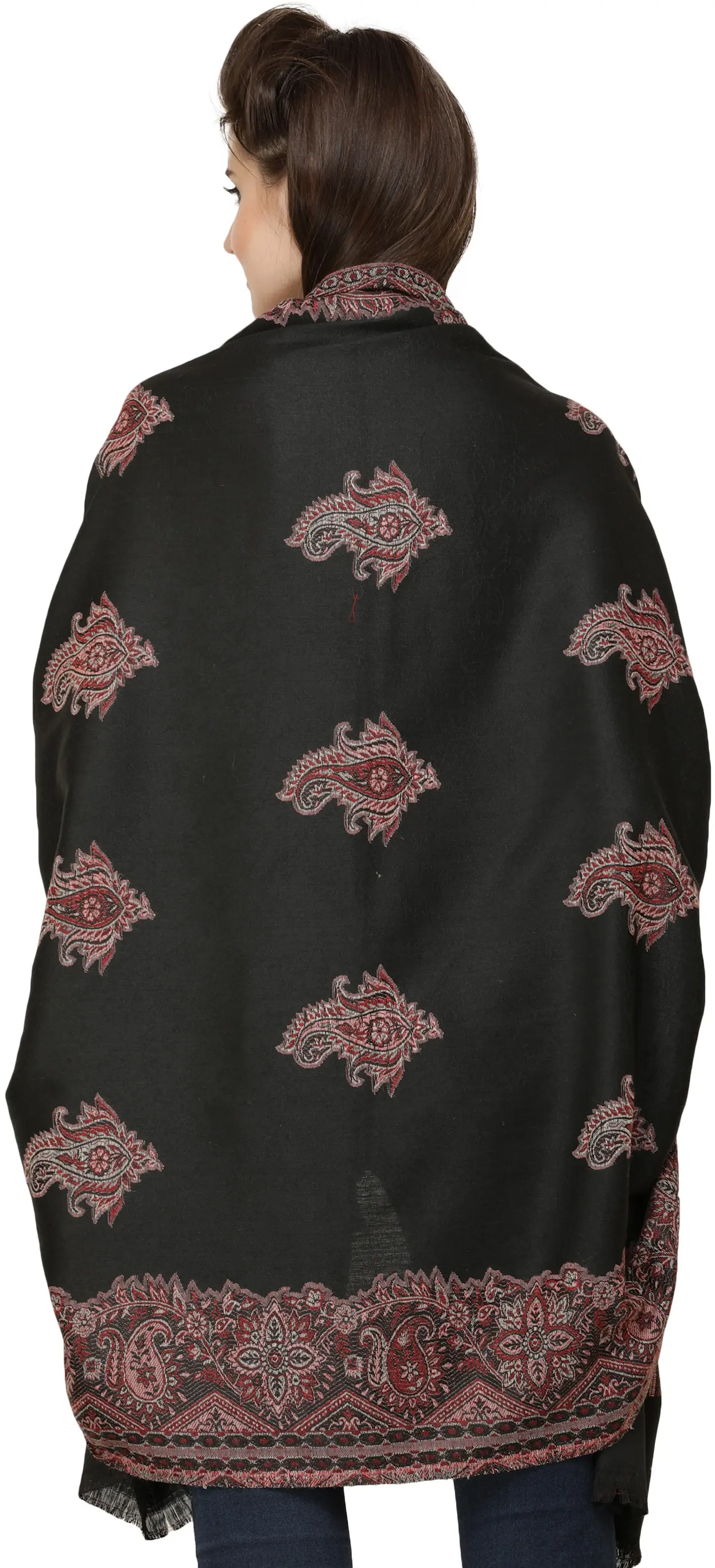 The allure of Jamawar craftsmanship shines brightly with our Woven Border and Paisleys Shawl. The fabric, rich in history, comes to life with intricate paisley patterns and a meticulously woven border. The origins of Jamawar can be traced back to Persian royalty, and its timeless appeal still resonates today. The earthy color palette adds a touch of sophistication to modern trends, making it a prized possession that blends tradition and contemporary style seamlessly. Skilled artisans ensure that every detail is perfect, reflecting the precision and dedication in each thread.