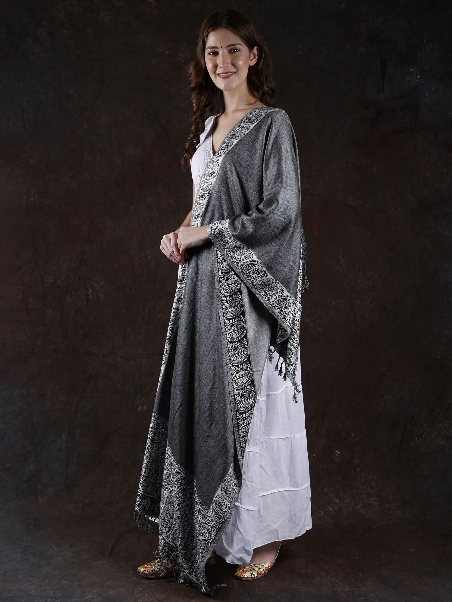 Elevate your wardrobe with this exquisite Jamawar stole, a true testament to artisanal craftsmanship. Hailing from the renowned weaving hub of Ludhiana, this stole is a symphony of traditional design and contemporary appeal. The core of the stole is a serene, solid expanse, offering a versatile canvas that complements any outfit. This clean aesthetic is beautifully contrasted by the meticulously detailed borders, which showcase the iconic paisley motif in a striking green and white pattern.