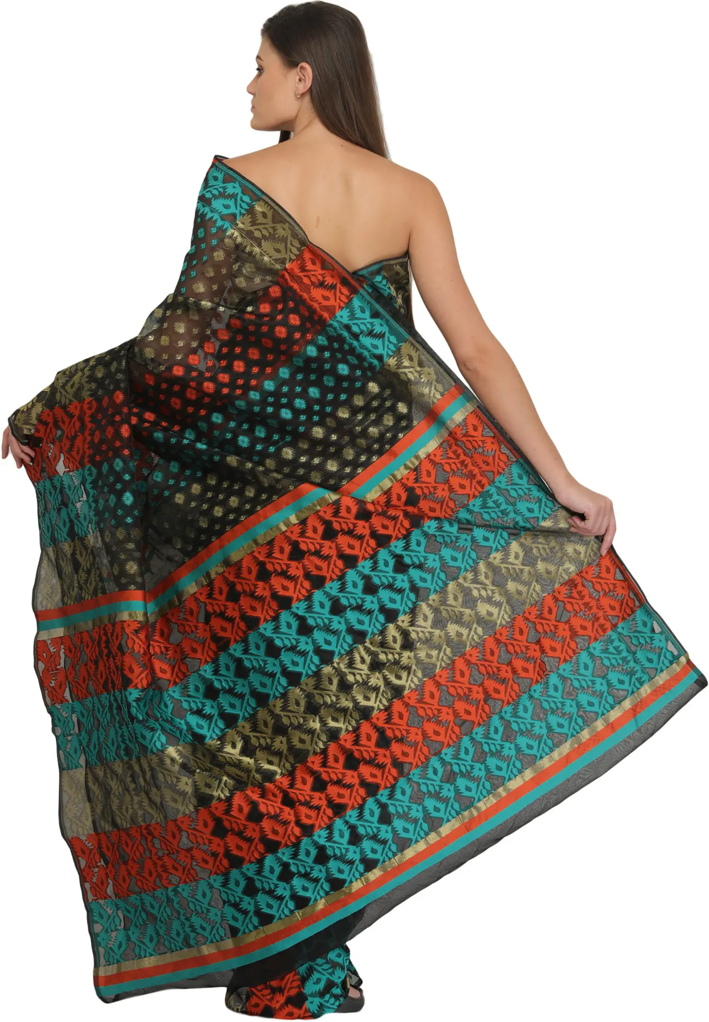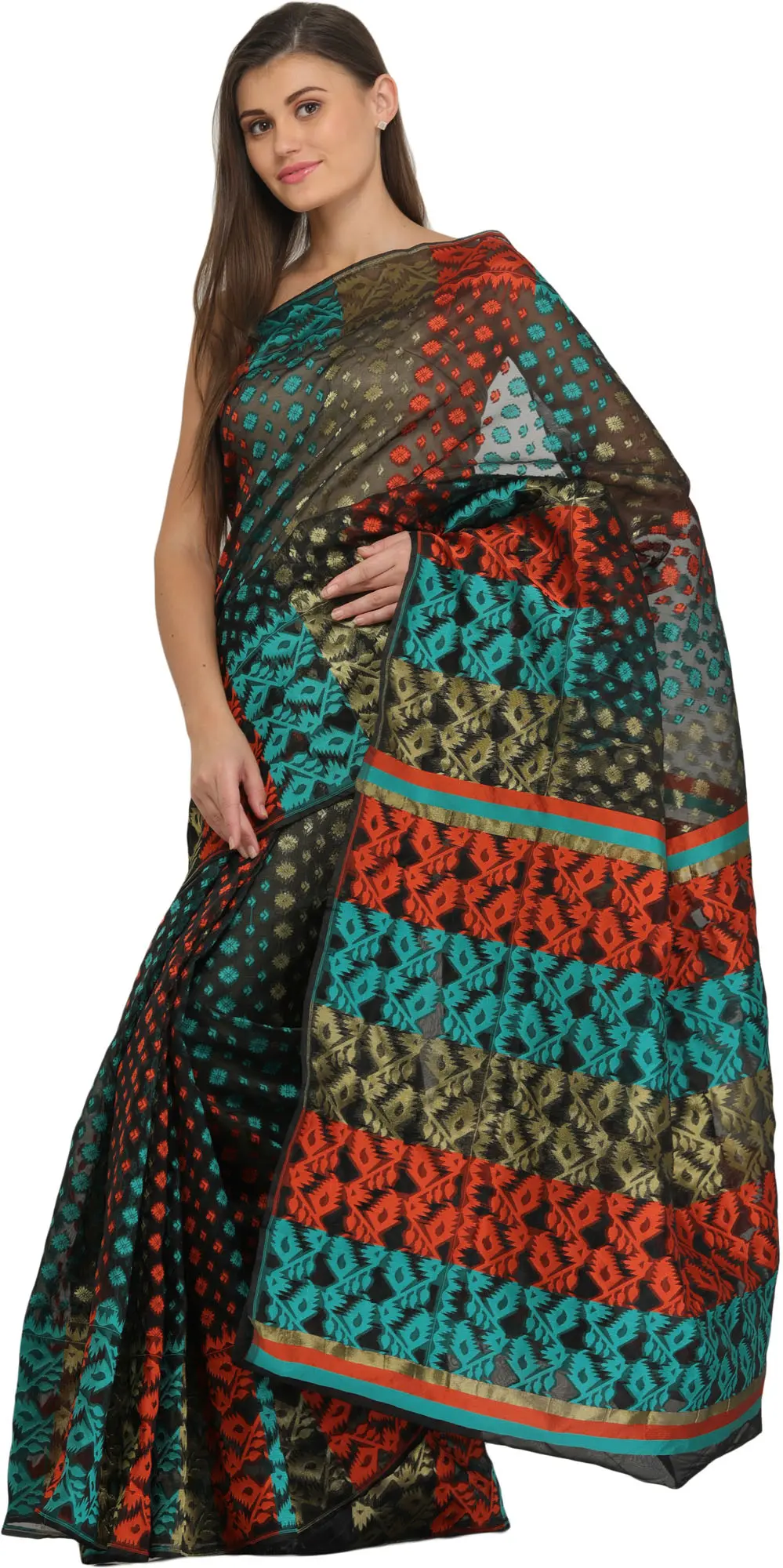 Jamdani Dhakai Sari from Bangladesh with Woven Motifs in Multicolor