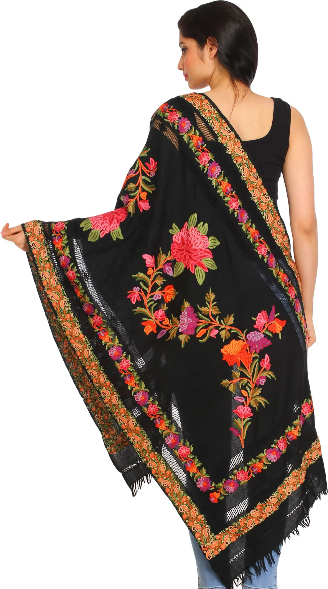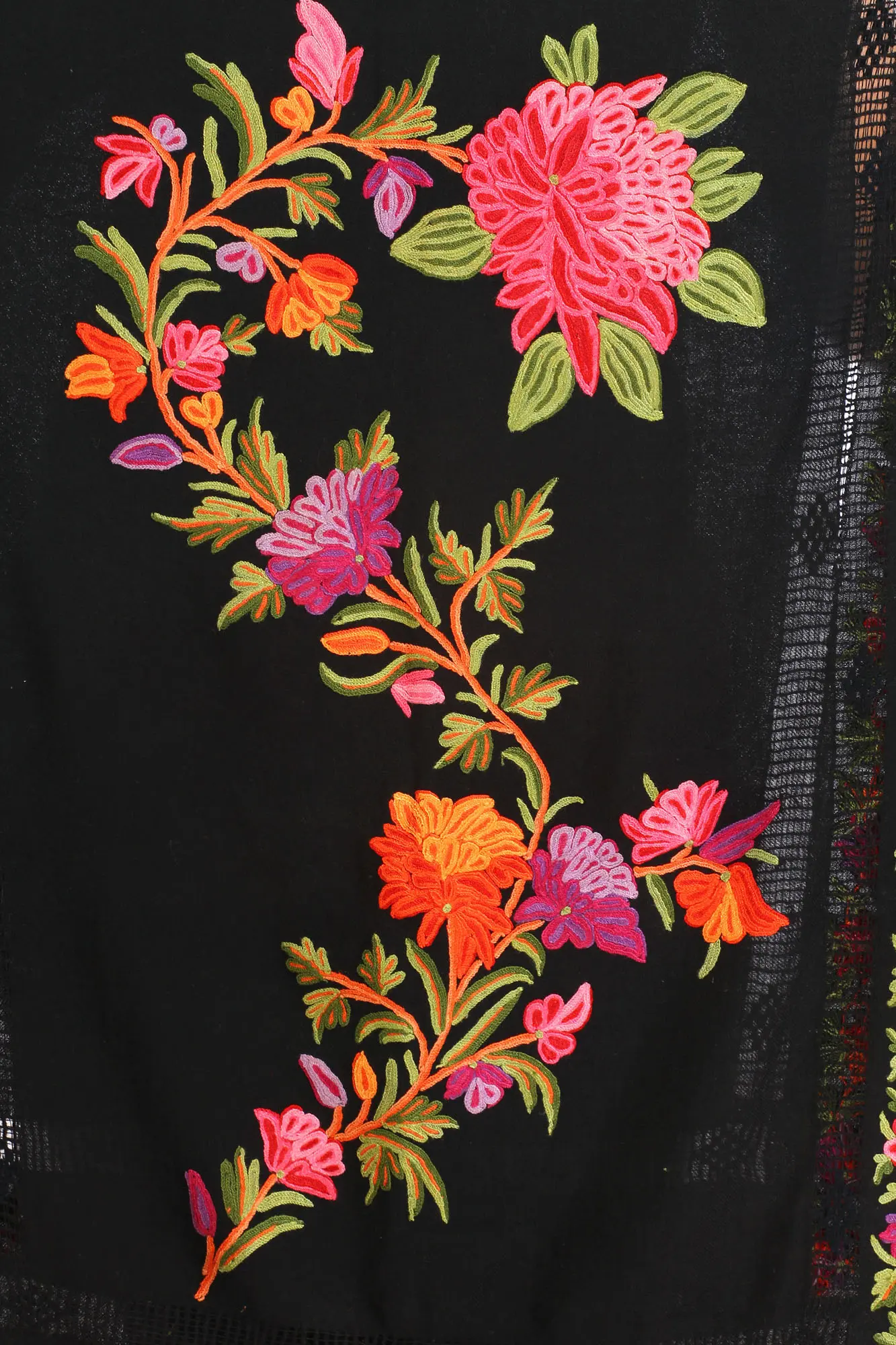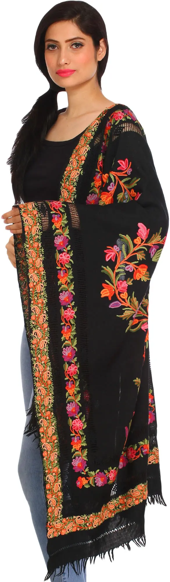 Black-Onyx Pure Wool Stole with Aari Embroidered Flowers from Kashmir