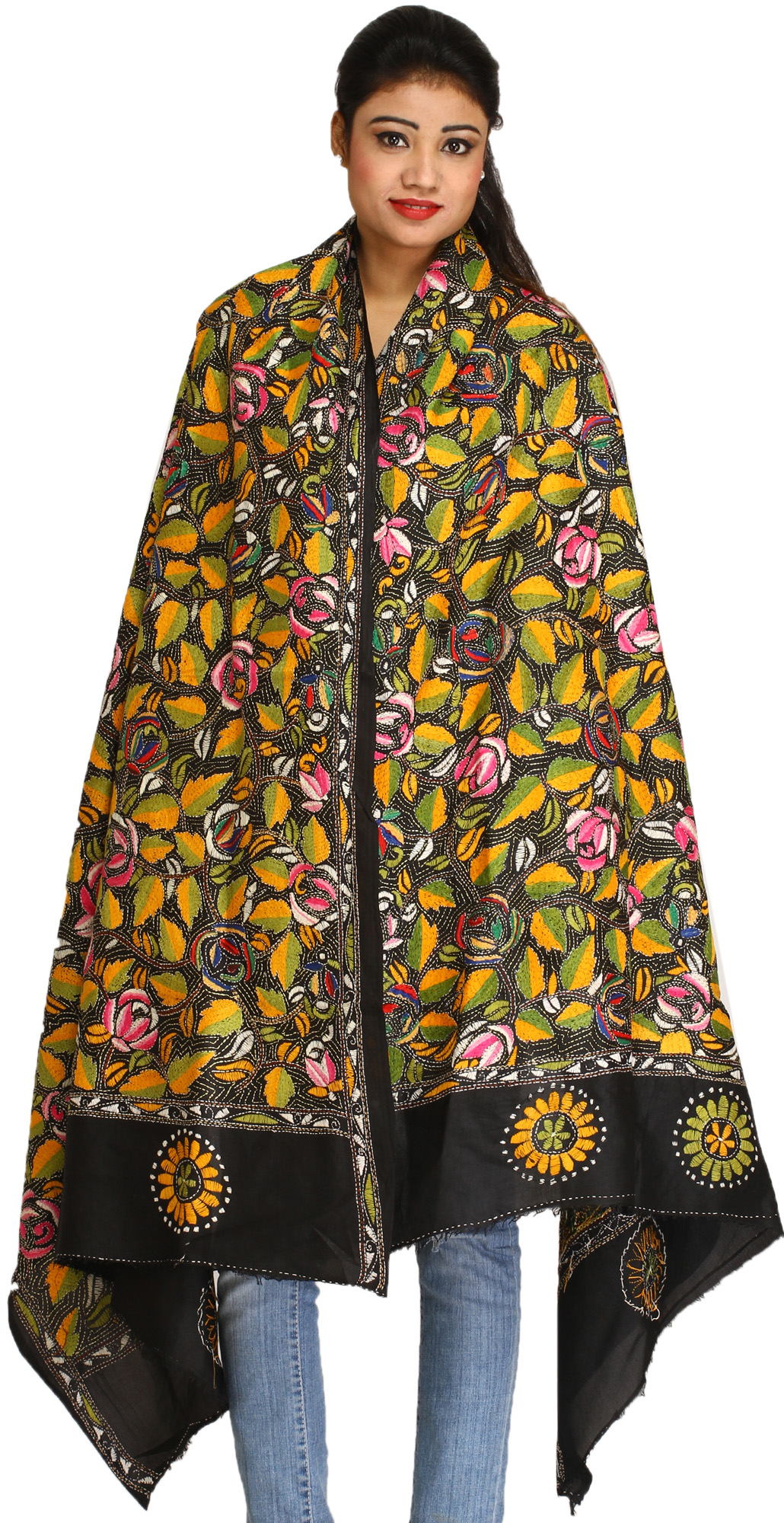 Multi-Color Patchwork Reversible Shawl from Kolkata with Kantha Stitch Embroidery All-Over