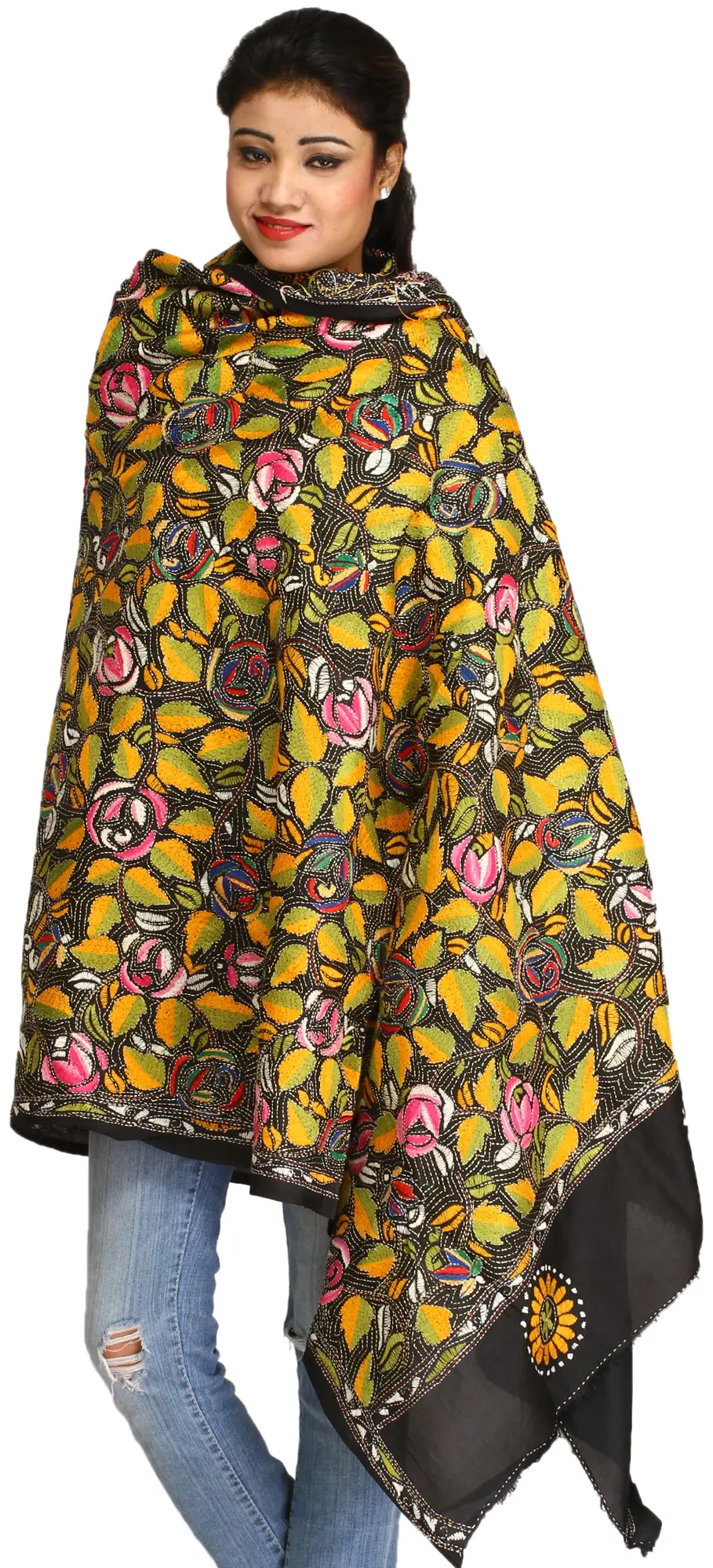 Discover the artistry of Kolkata with this exquisite silk stole, a testament to the enduring beauty of traditional Indian crafts. The rich, jet-black silk serves as a dramatic canvas for a vibrant spectacle of hand-embroidered leaves and blooming flowers. Each stitch is a whisper of heritage, meticulously placed by skilled artisans to bring a botanical dream to life.