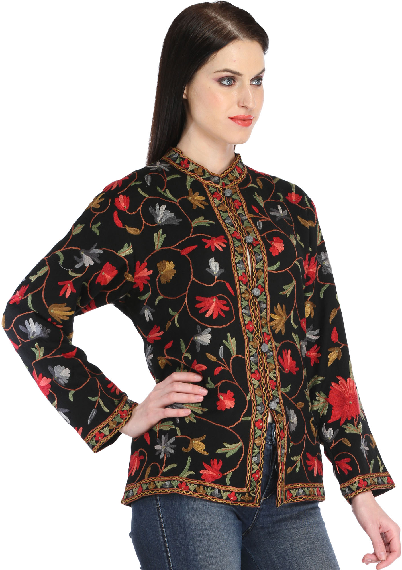 Embroidered Floral Vines Wool Jacket with Stand Collar and Pockets