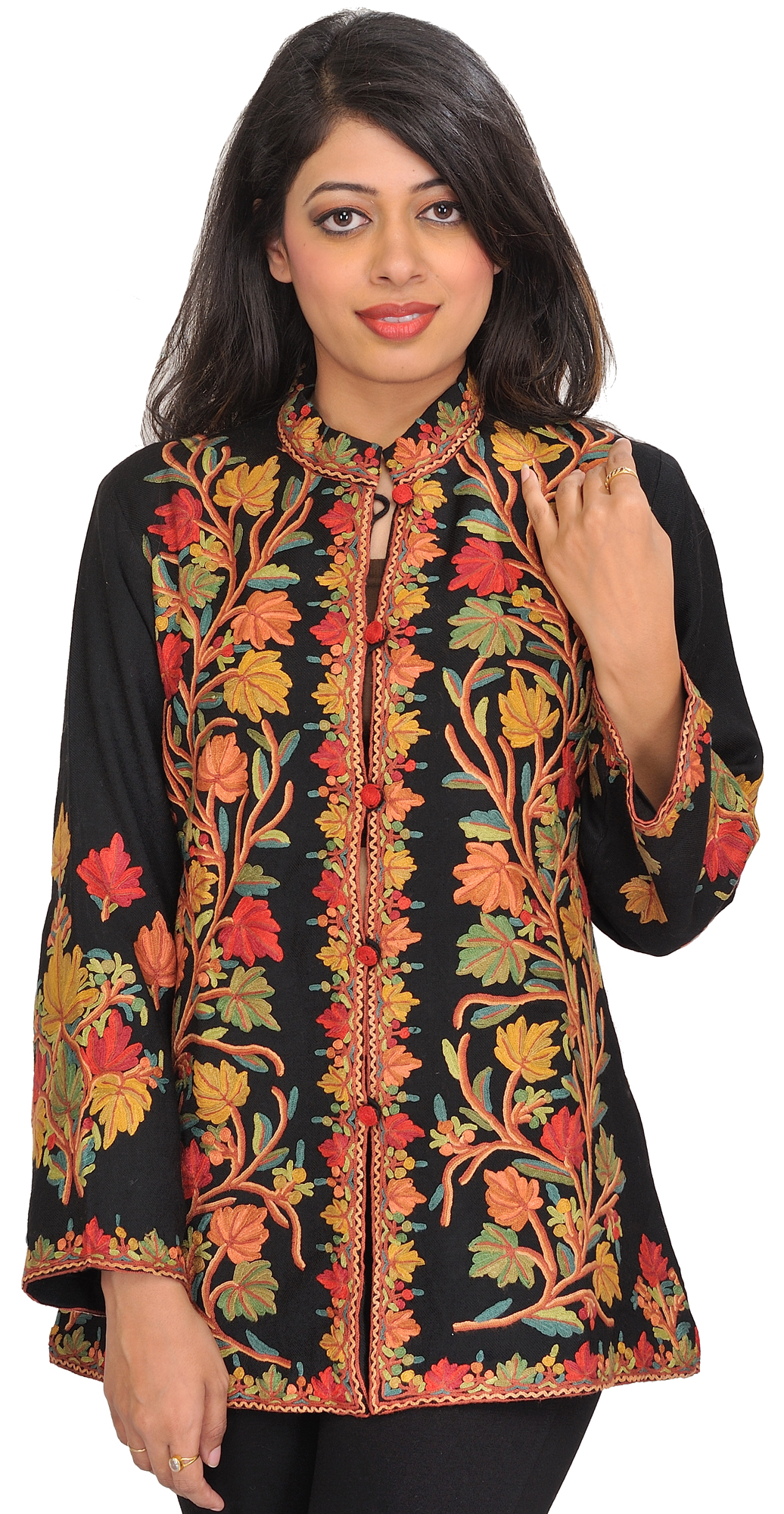 Kashmiri Short Jacket with Aari Embroidered Maple Leaves on All-over