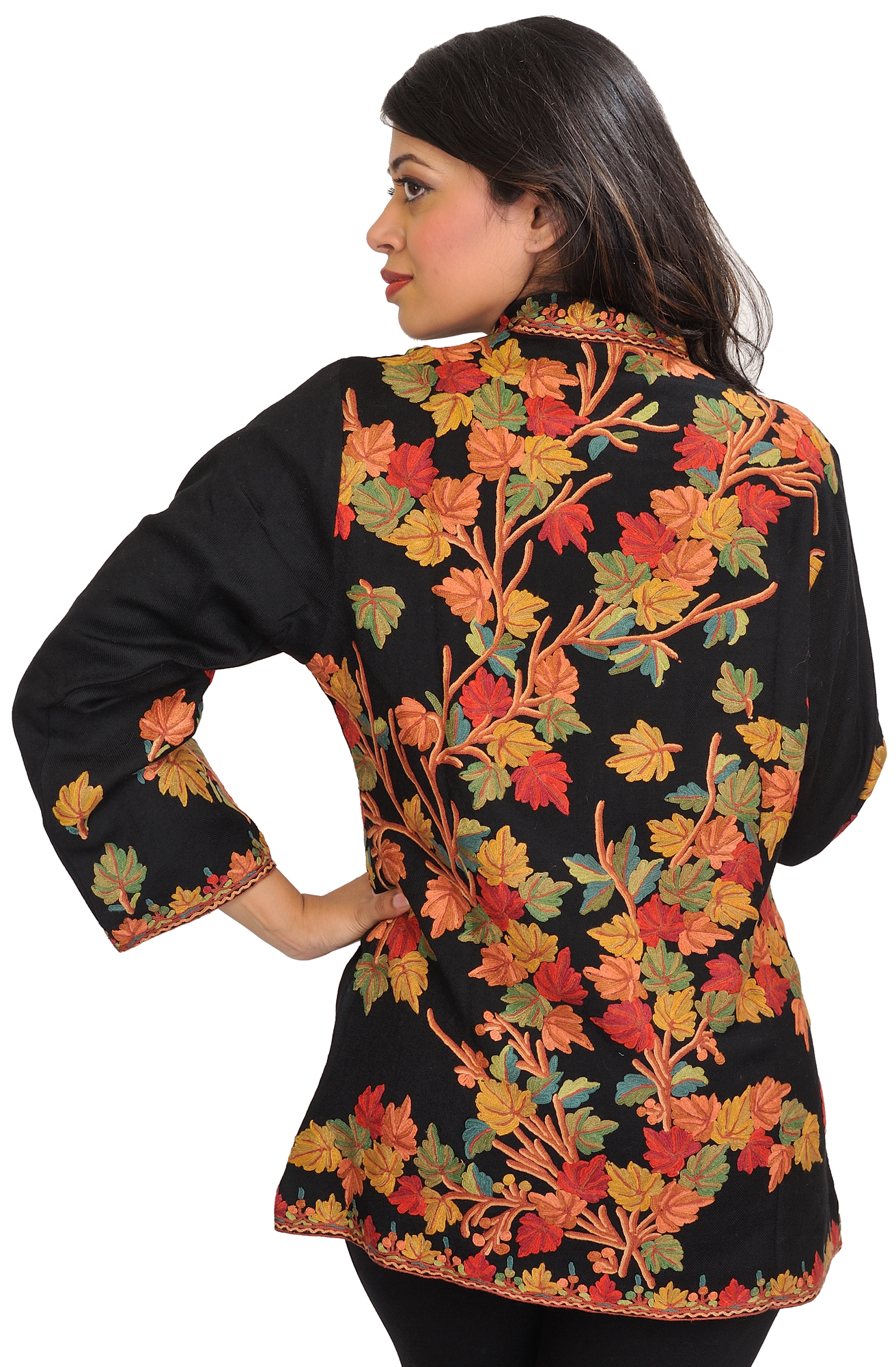 Jet-Black Jacket from Kashmir with Aari Hand-Embroidered Maple Tree
