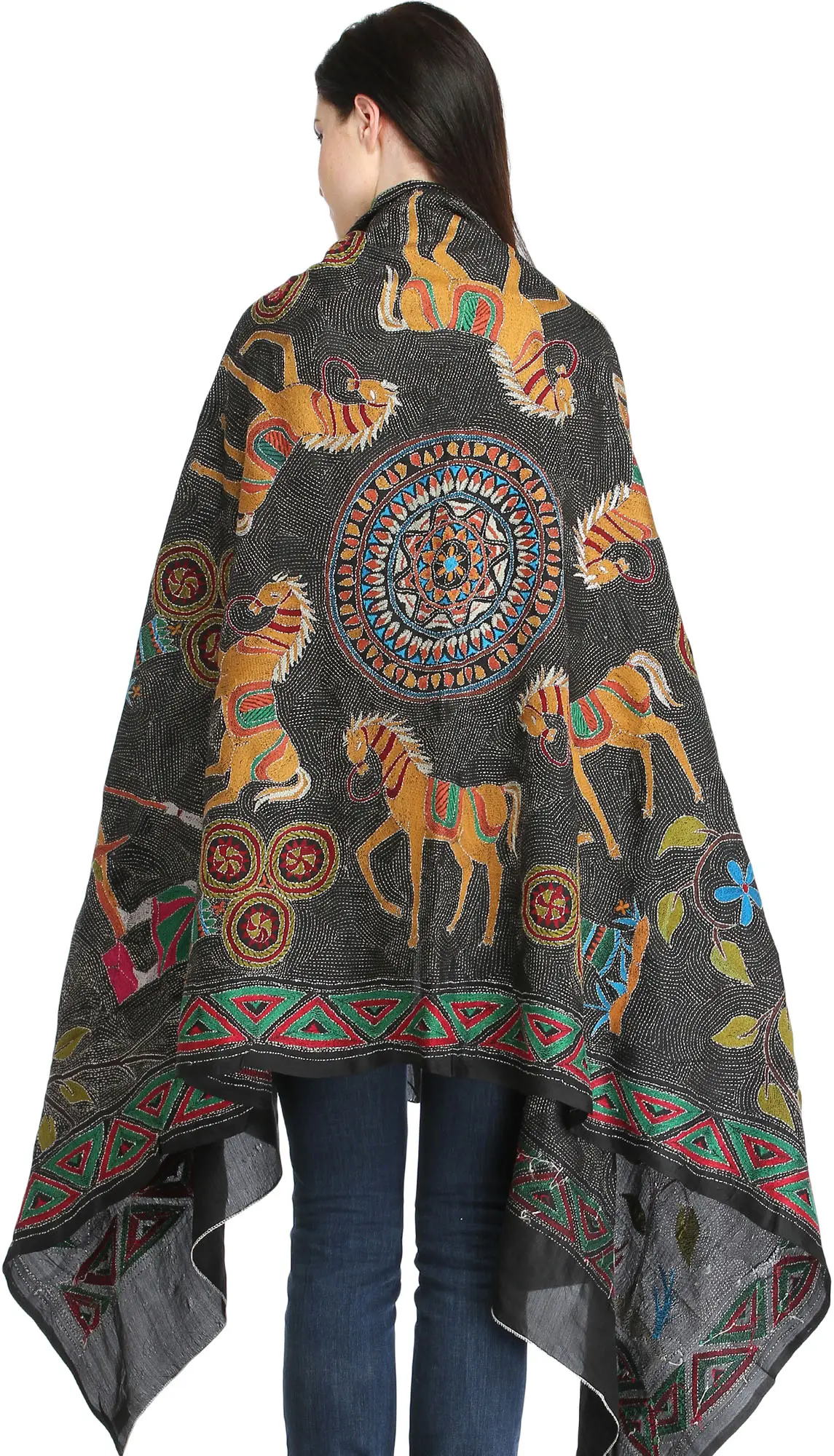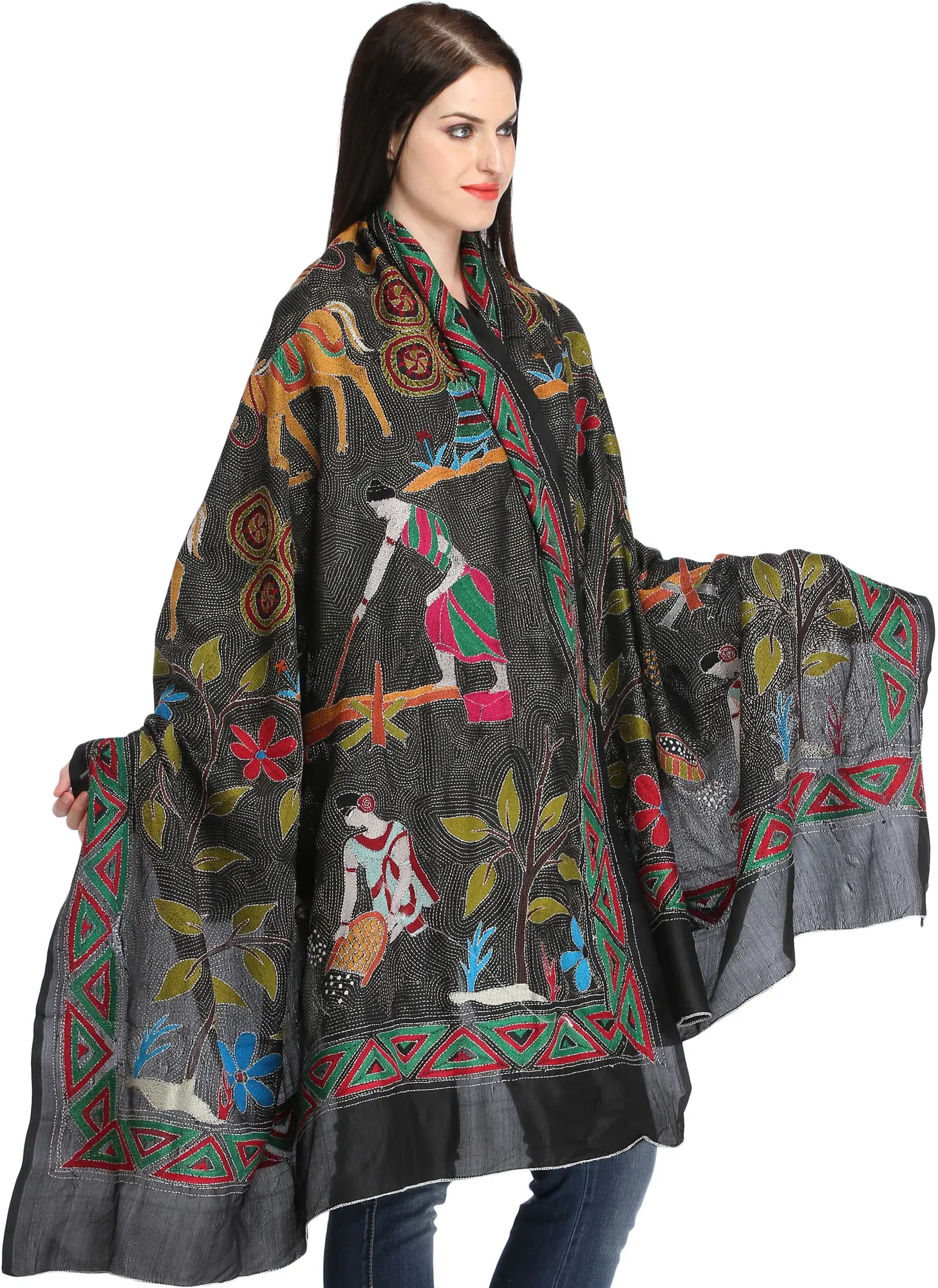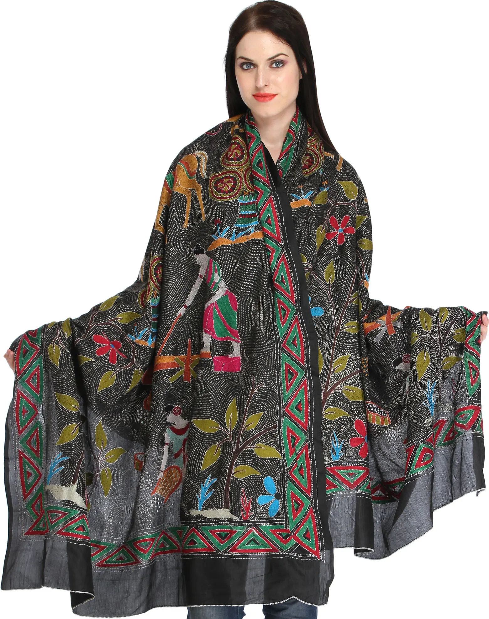 Lambs-Wool Nakshi Kantha Dupatta with Black Color Hand Embroidered Warli Inspired Motif