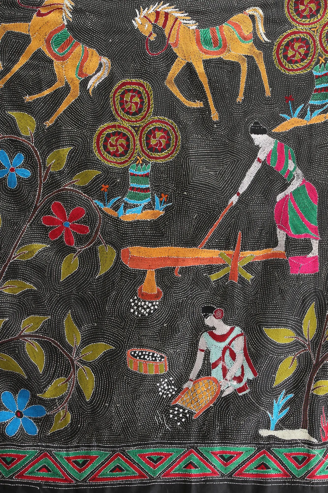 Immerse yourself in the vibrant artistry of Bengal with this exquisite Kantha-embroidered dupatta, a true masterpiece handcrafted in Kolkata. The deep, jet-black pure silk fabric serves as a captivating canvas for a meticulously detailed depiction of a bustling village scene. Each stitch tells a story, bringing to life the essence of rural life with a remarkable array of motifs and figures.