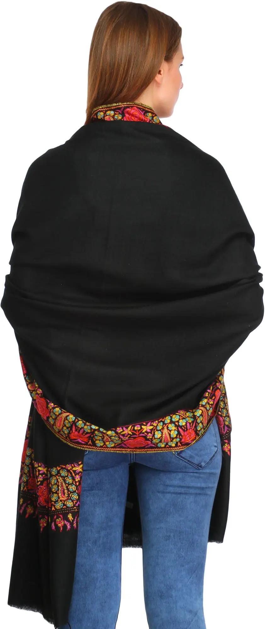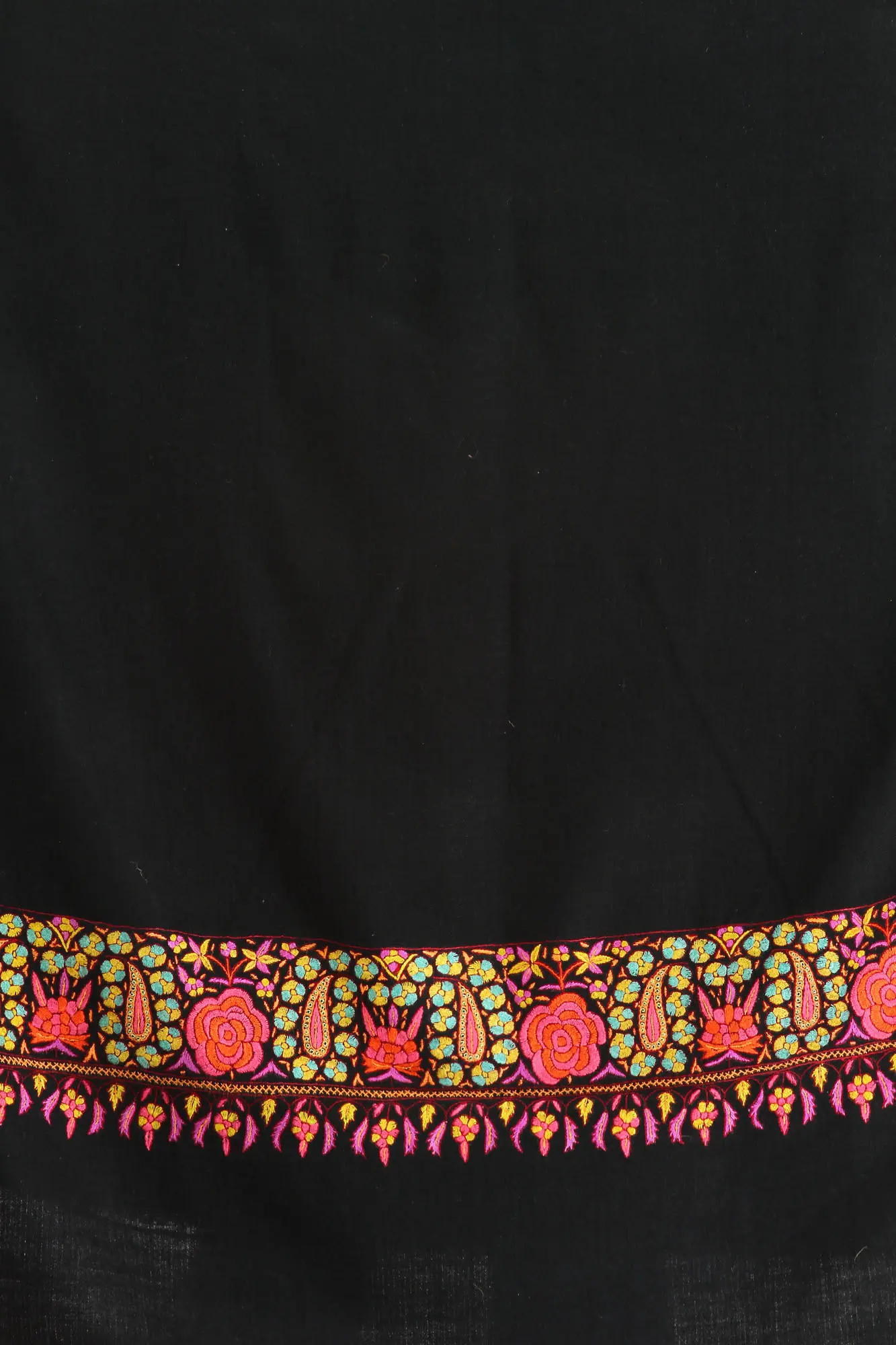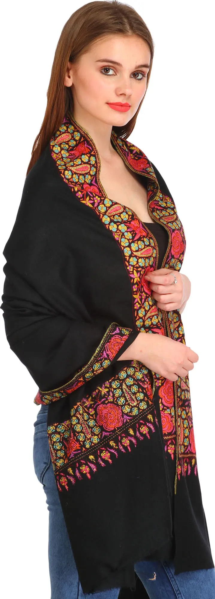 A unique piece of shawl, embroidered with a unique technique called Papier Mache embroidery. The Papier Mache word has been derived from a French word that means “Chewed paper”. It is a composite substance created from paper stripes or glued in some manner. This style of embroidery is only done in the northwestern region of Jammu and Kashmir. This form of embroidery consists of the design of flowers and leaves. It involves creating three-dimensional shapes or designs using papier mache and then embellishing them with intricate embroidery.