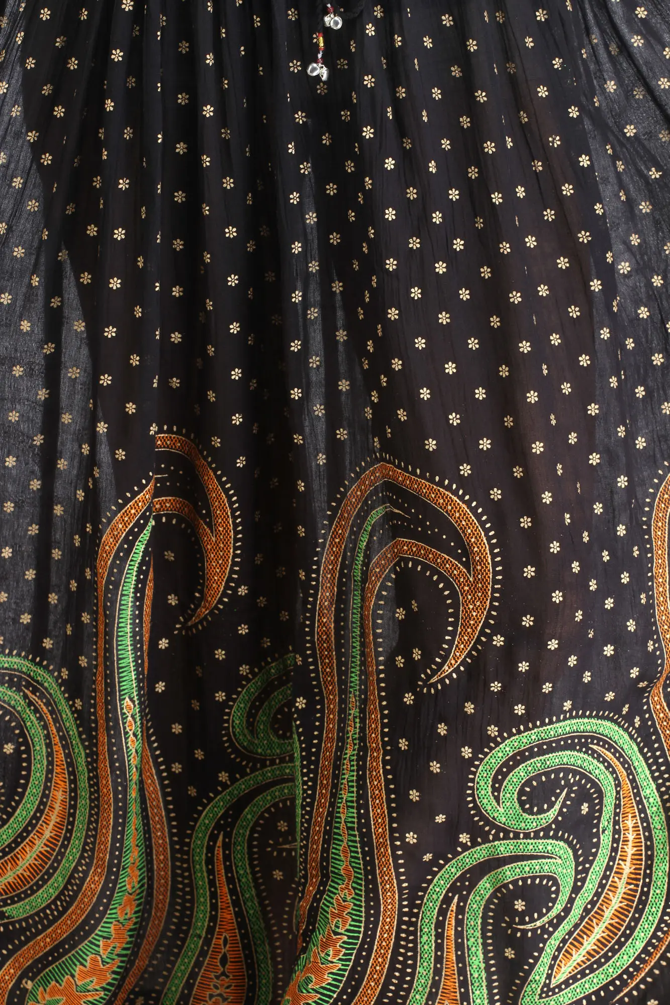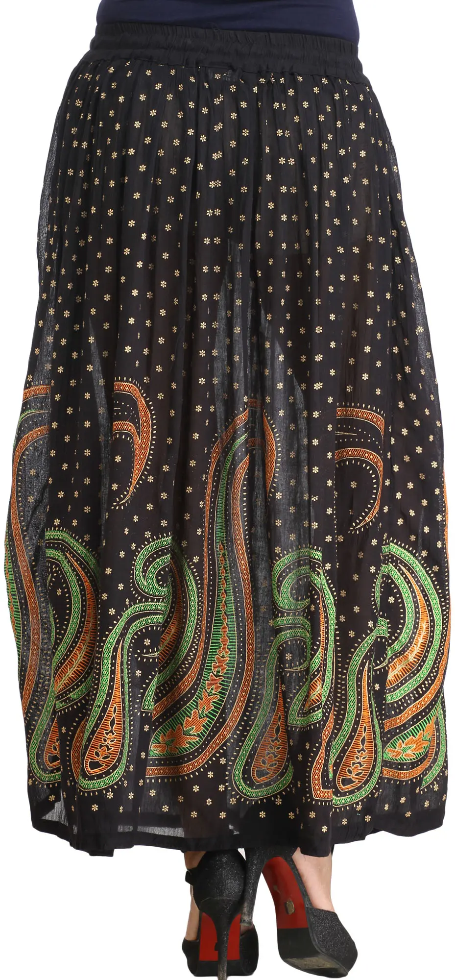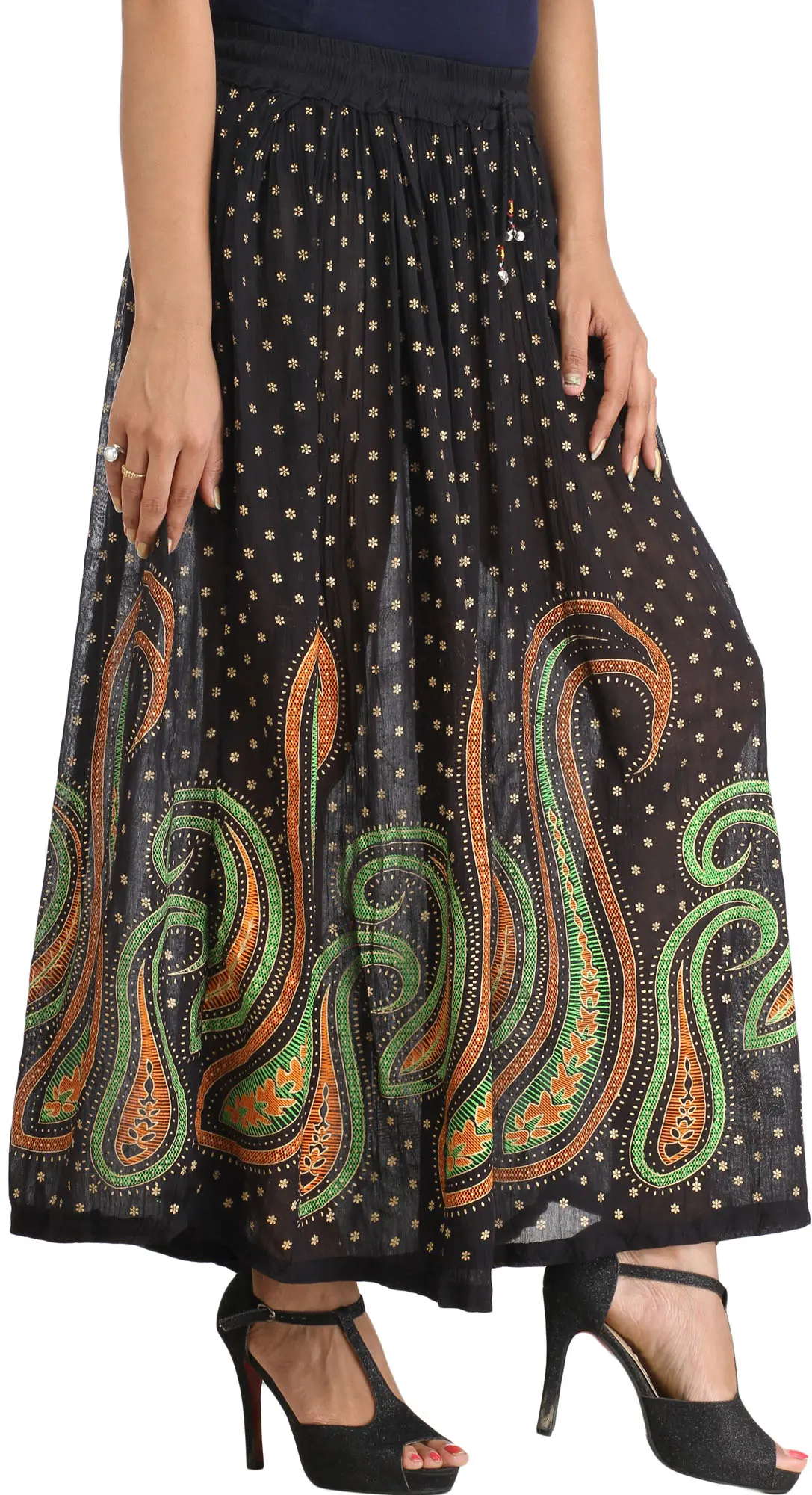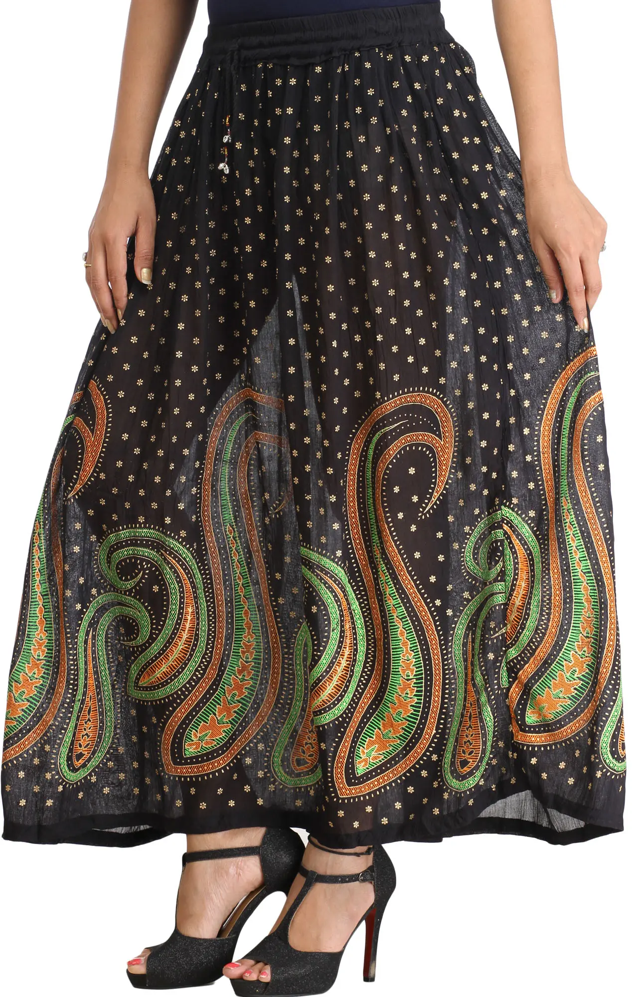 Adorn yourself with the allure of this Jet-Black Long Elastic Skirt decorated with stunning printed paisleys and bootis. This skirt, crafted from premium rayon, flawlessly integrates comfort and style. Its elastic waistband guarantees a great fit, letting you move gracefully and easily. The rich jet-black colour oozes refinement, while the complex paisley and booti designs create a sense of mystique, celebrating tradition in a contemporary form. Versatile and Chic, this skirt transitions from casual outings to special occasions. Enrich your everyday look with this captivating piece.