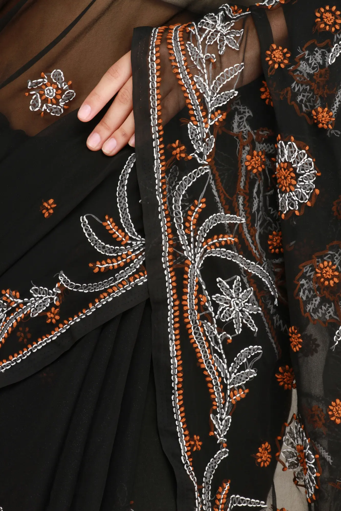 The heart of this saree lies in its meticulously hand-stitched Chikan work. Delicate floral motifs, rendered in pristine white and accented with subtle hints of burnt orange, are meticulously embroidered across the fabric. Each stitch speaks of traditional craftsmanship, passed down through generations of skilled artisans. The embroidery is concentrated along the borders, creating a captivating frame that draws the eye, and is also scattered in smaller motifs throughout the body of the saree, adding depth and visual interest. The sheer nature of the chiffon allows the embroidery to truly stand out, creating an ethereal effect.