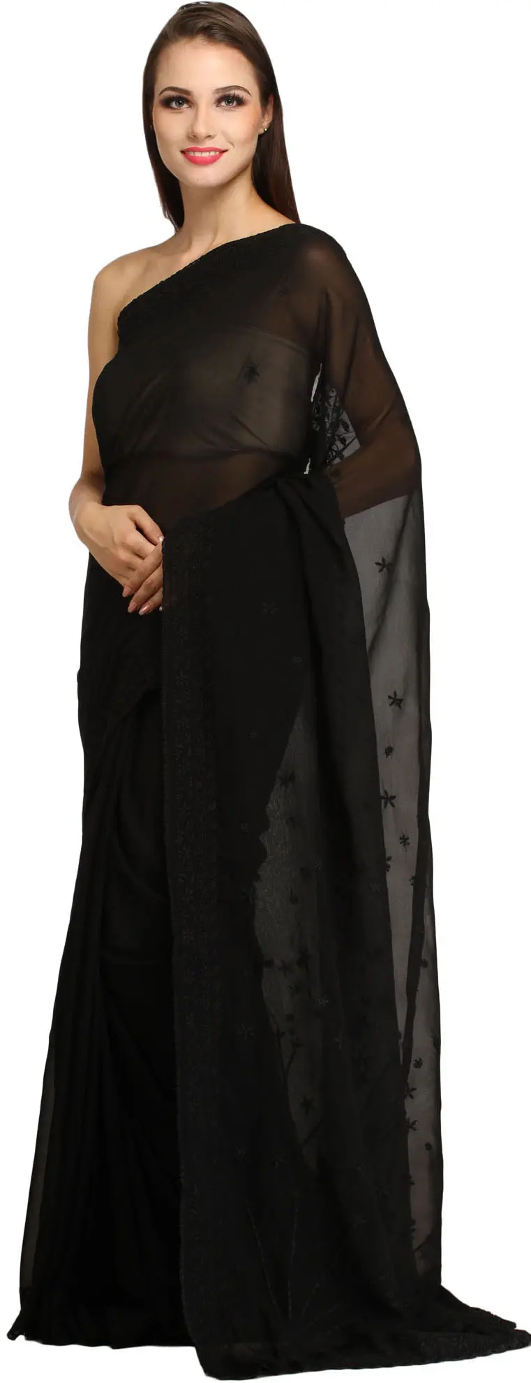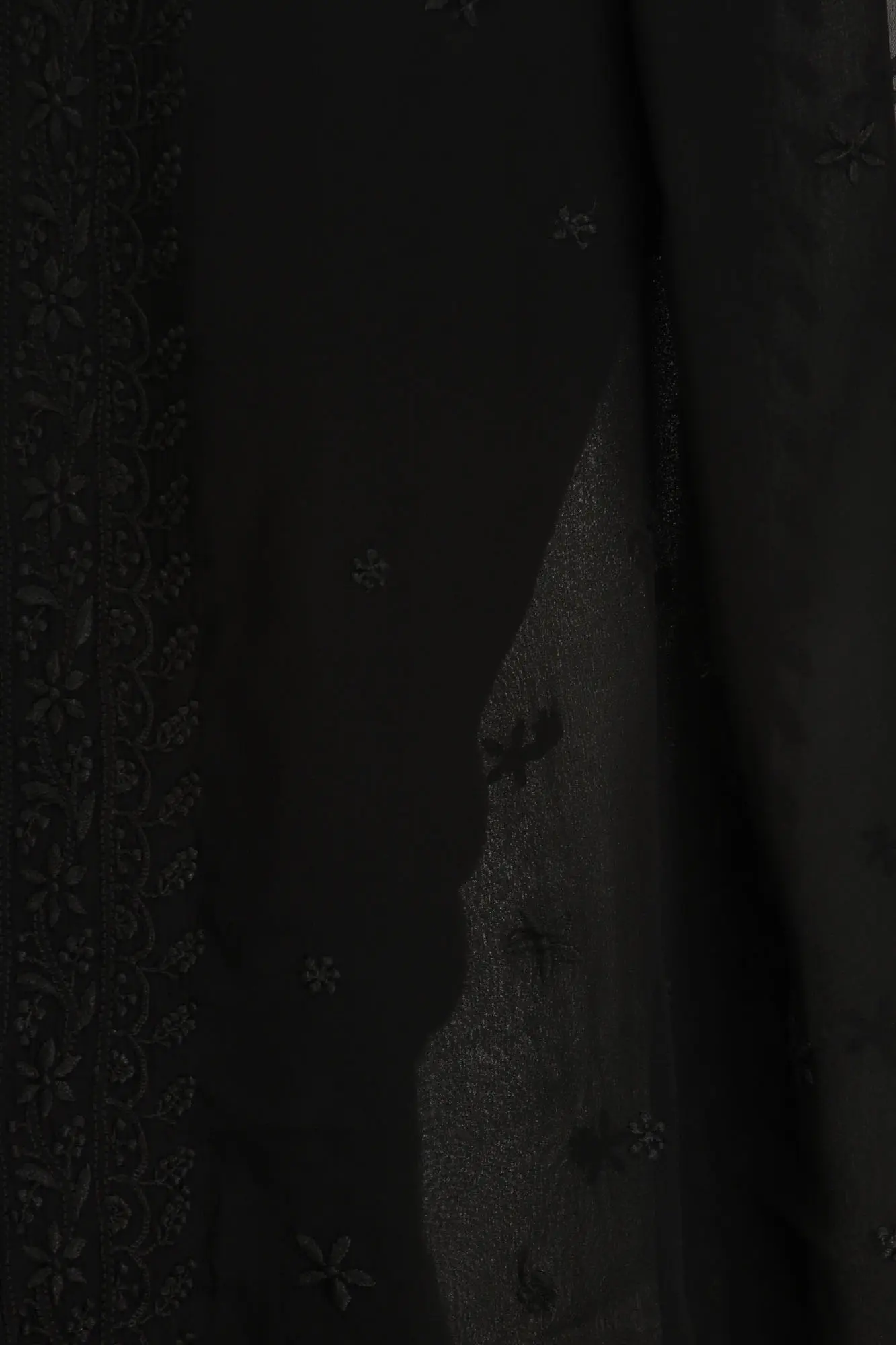 The soul of this saree lies in its artisanal Chikan embroidery. Originating from Lucknow, this intricate hand-work features meticulous needlepoint stitches that create a stunning textural effect. The embroidery on this saree is a testament to the skill and patience of the artisans, transforming the luxurious georgette into a piece of wearable art. The delicate floral motifs are rendered with precision, exuding a timeless beauty that is both subtle and captivating. The embroidery graces the pallu and borders, adding depth and dimension to the classic black fabric.