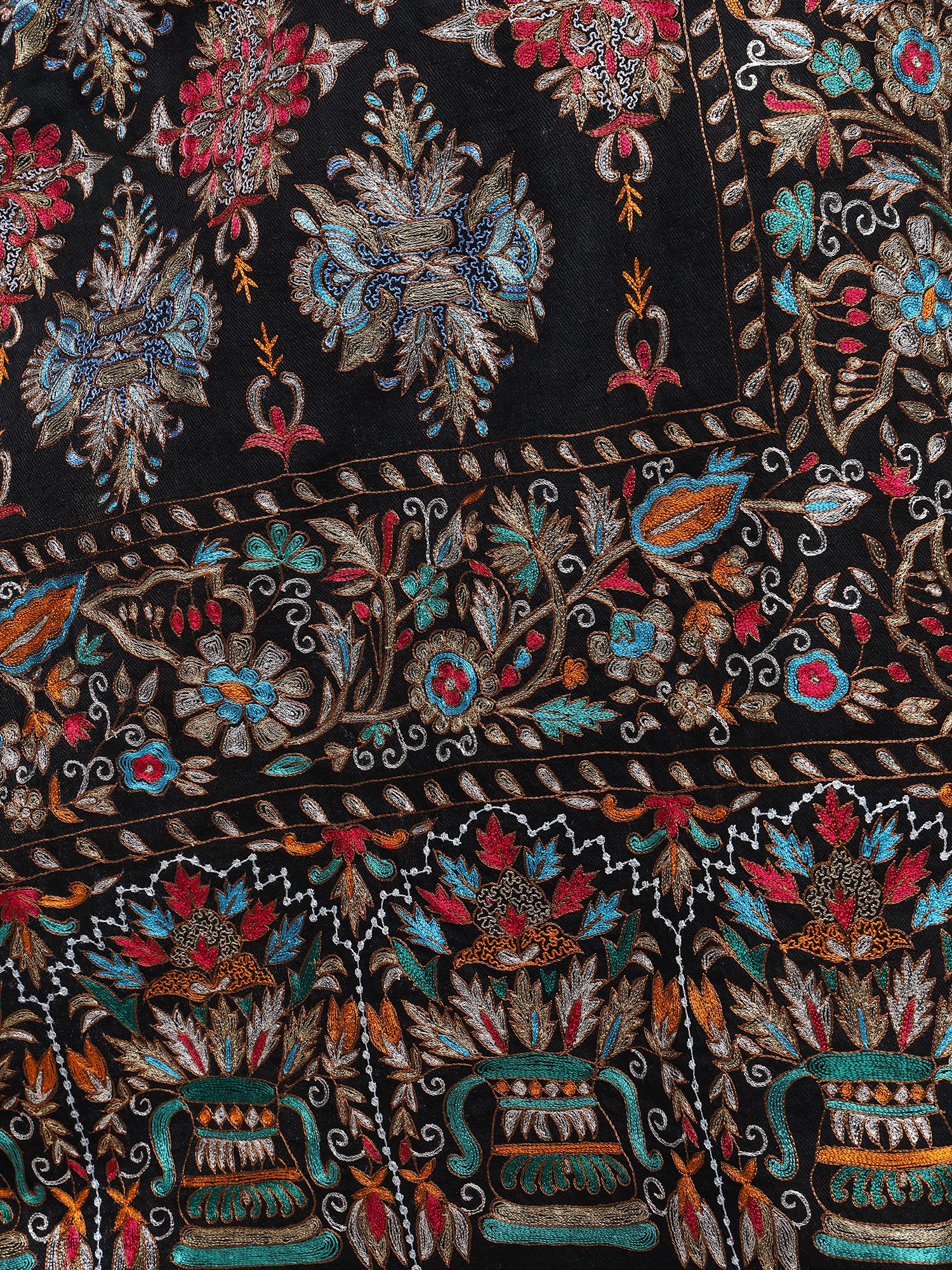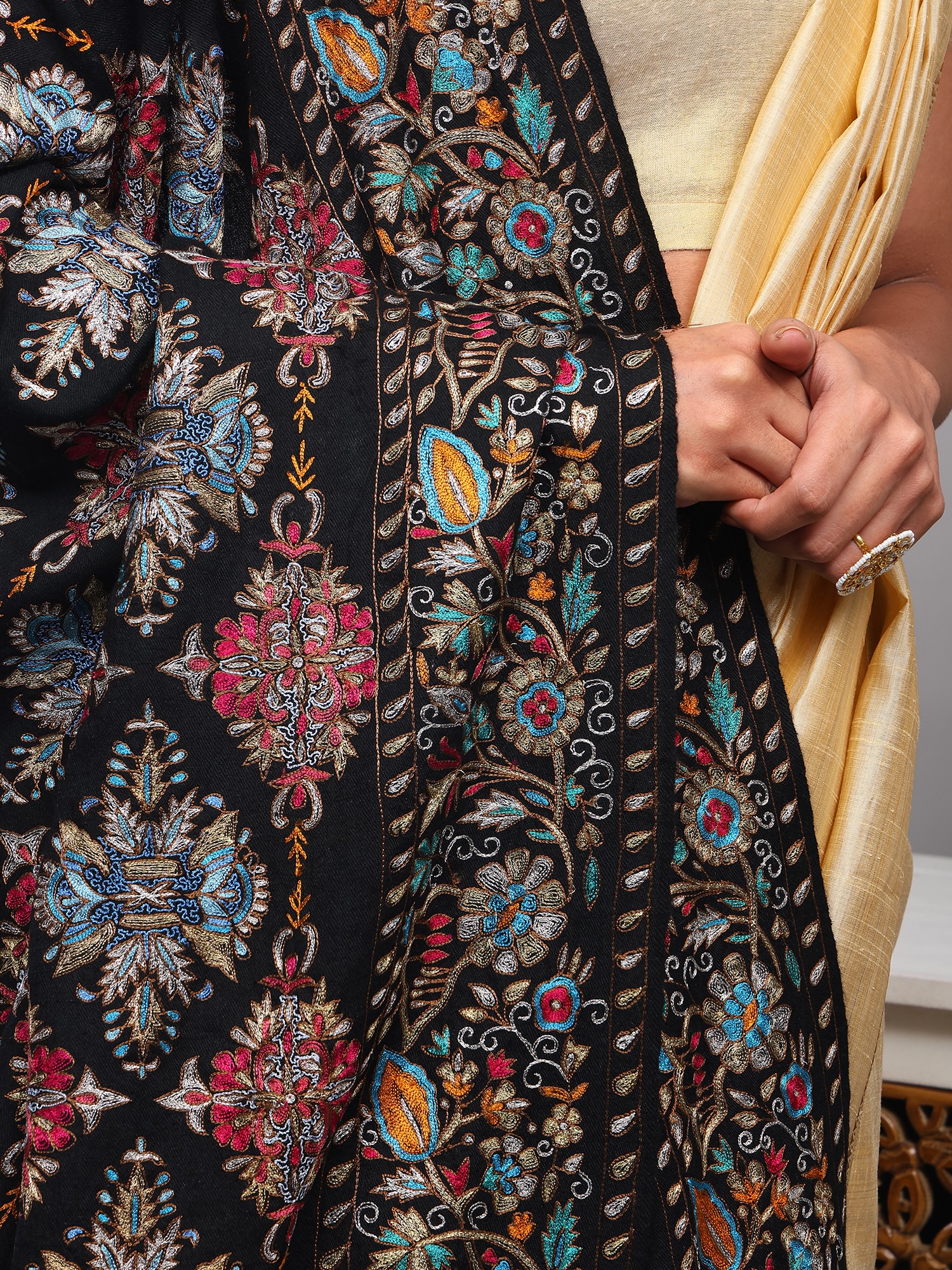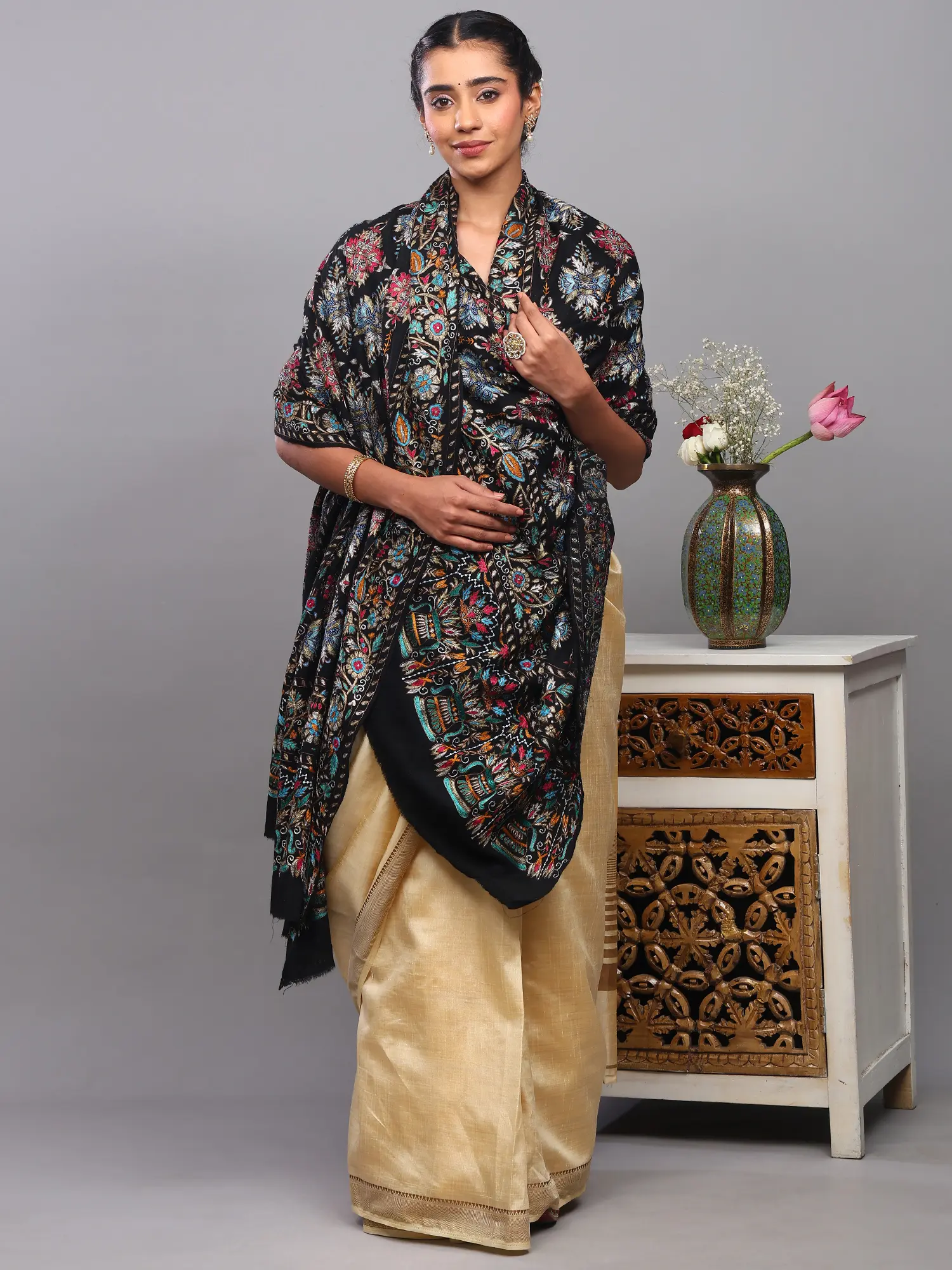 Black-Beauty Pure Wool Kashmiri Stole with Aari Hand-Embroidered Birds and Floral Border