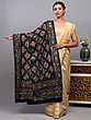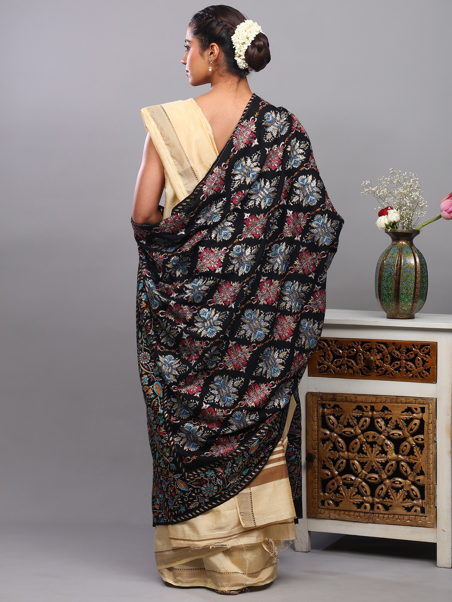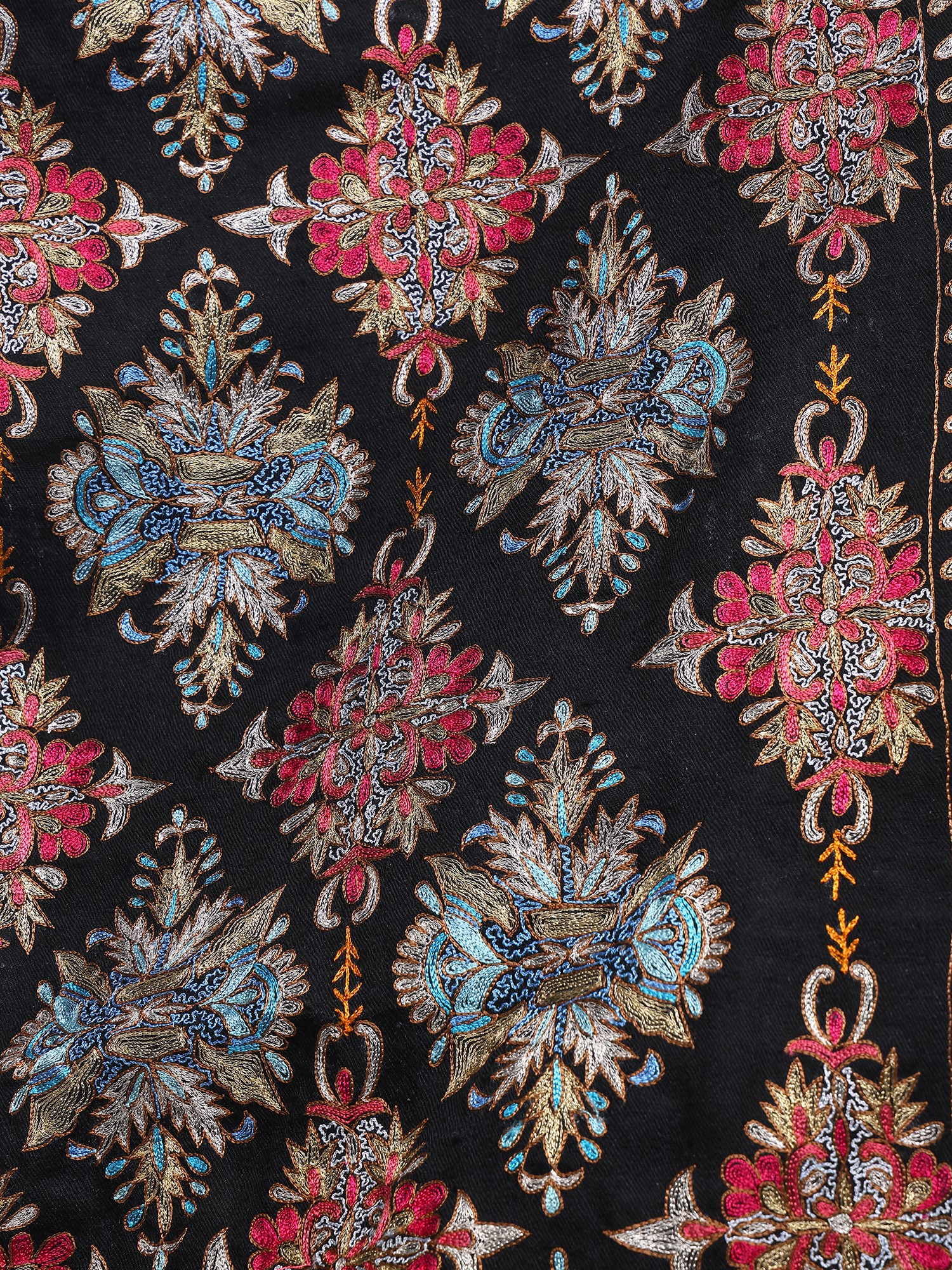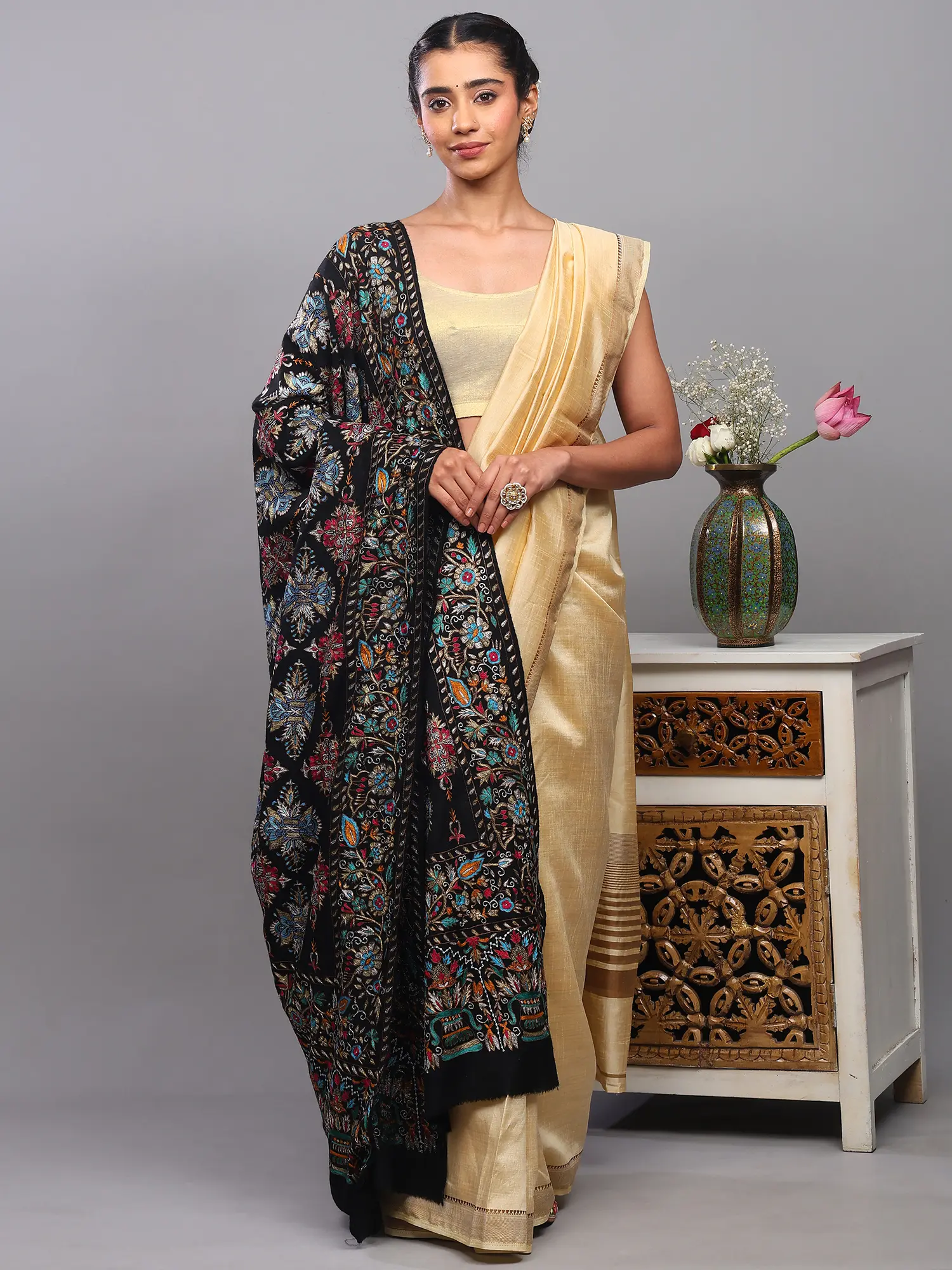 Black-Beauty Pure Wool Kashmiri Stole with Aari Hand-Embroidered Birds and Floral Border
