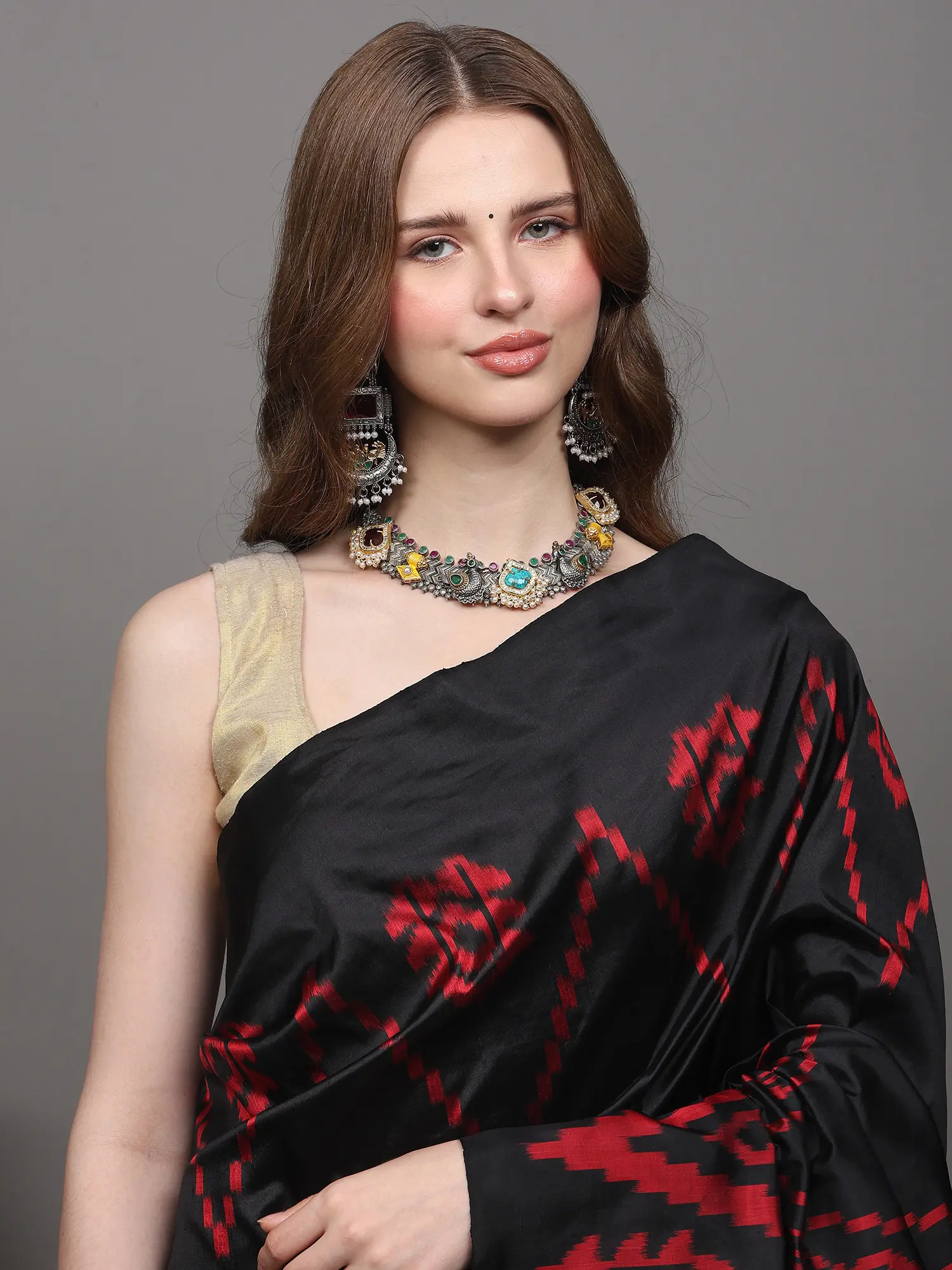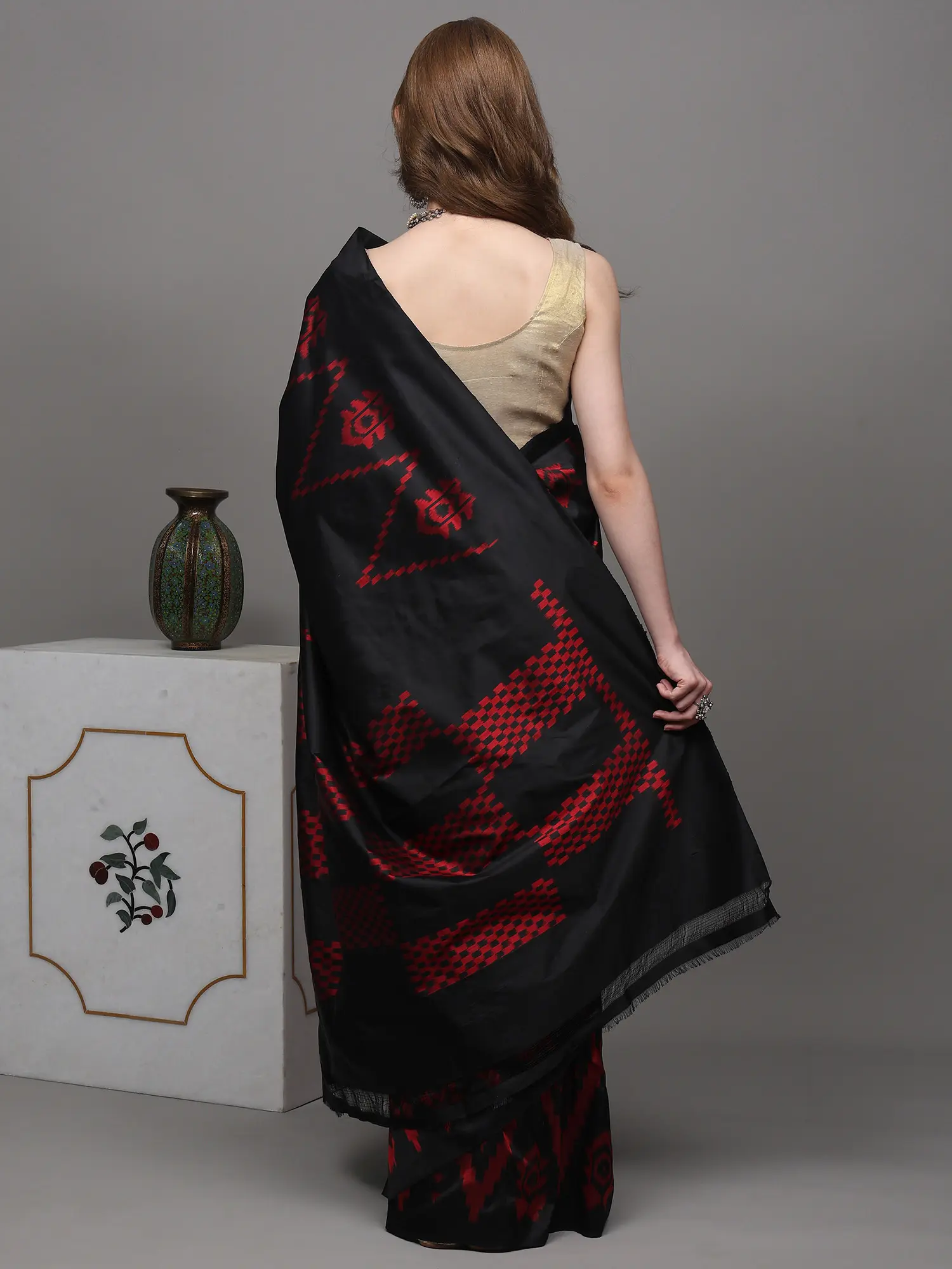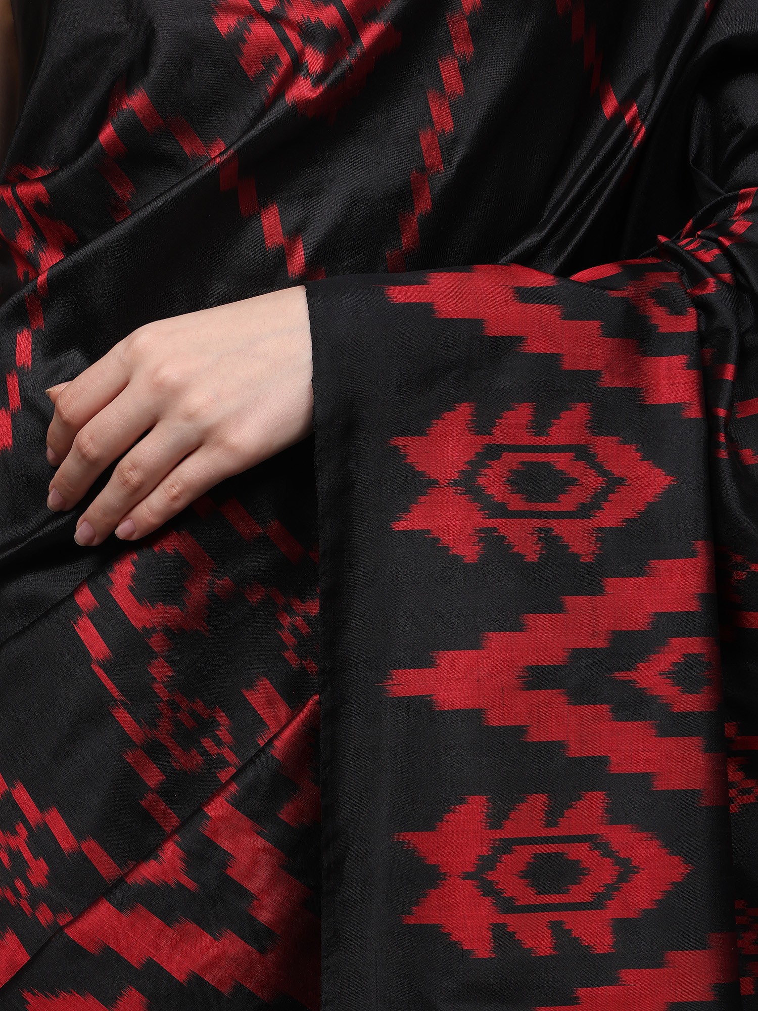 The richness of pure silk finds a beautiful feel in this Jet-black handloom saree from Pochampally. The single Ikat weave patterns bloom brilliantly on the border and the pallu, with the loveliness of red hue which gorgeously balances the mystical appeal of black. The Pochampally Ikat sarees are prized pieces for their symmetrical beauty of patterns, traditionally known as Paagadu Bandhu, which finds a lovely expression on the silken field of this saree.